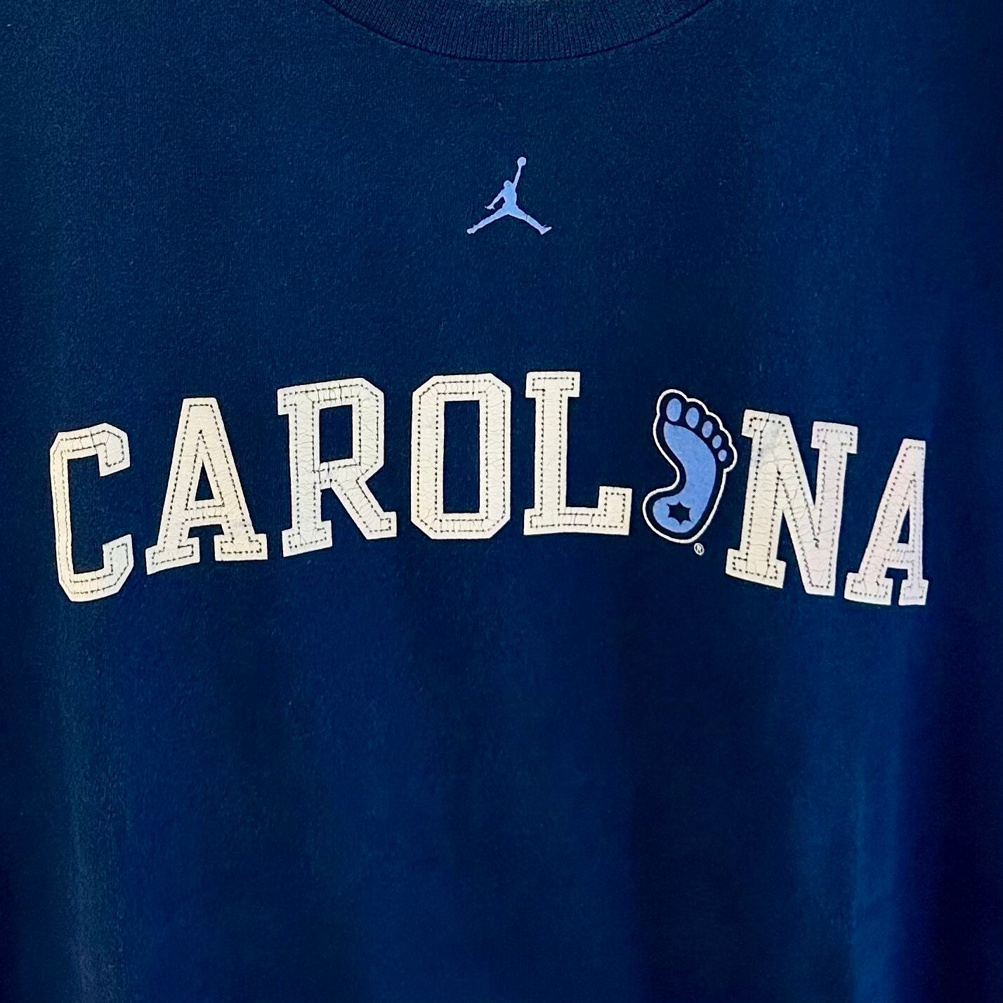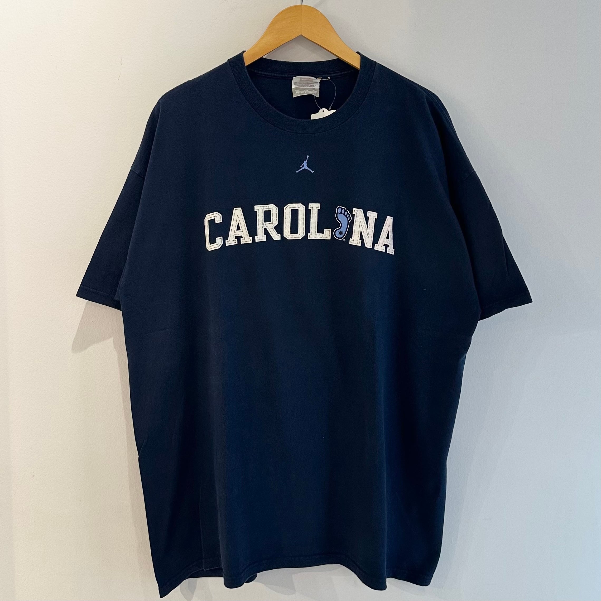 ネイビーのコットン素材、フロントに大きくCAROLINAとジャンプマンプリント、バック襟元にTAR HEELSプリントの入るデザインです。