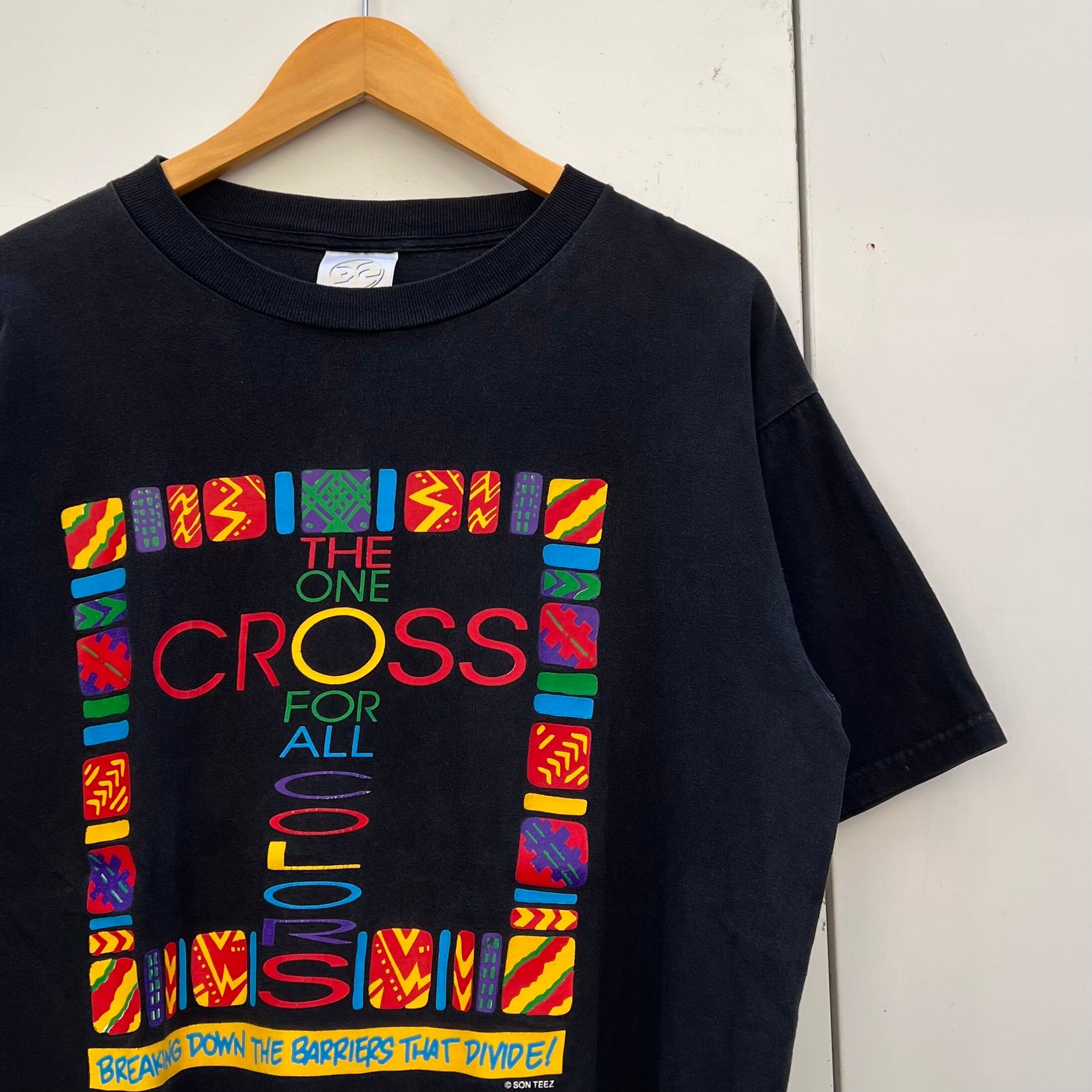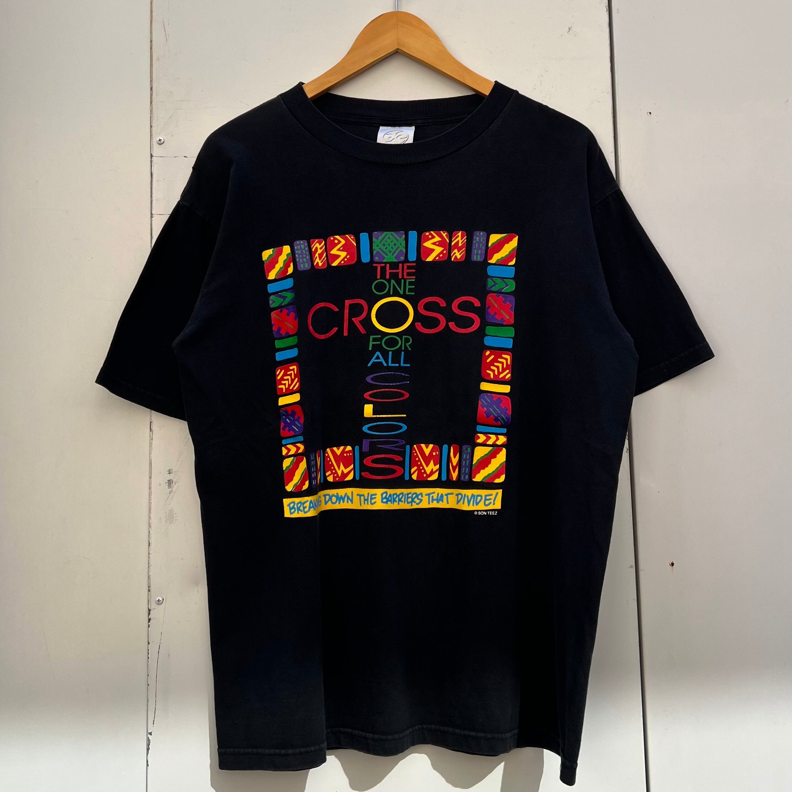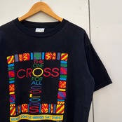 ブラックのコットン素材、フロントにCROSS COLOURSとTHE ONE FOR ALL COLORSプリントが入るメッセージ性の高いデザインです。