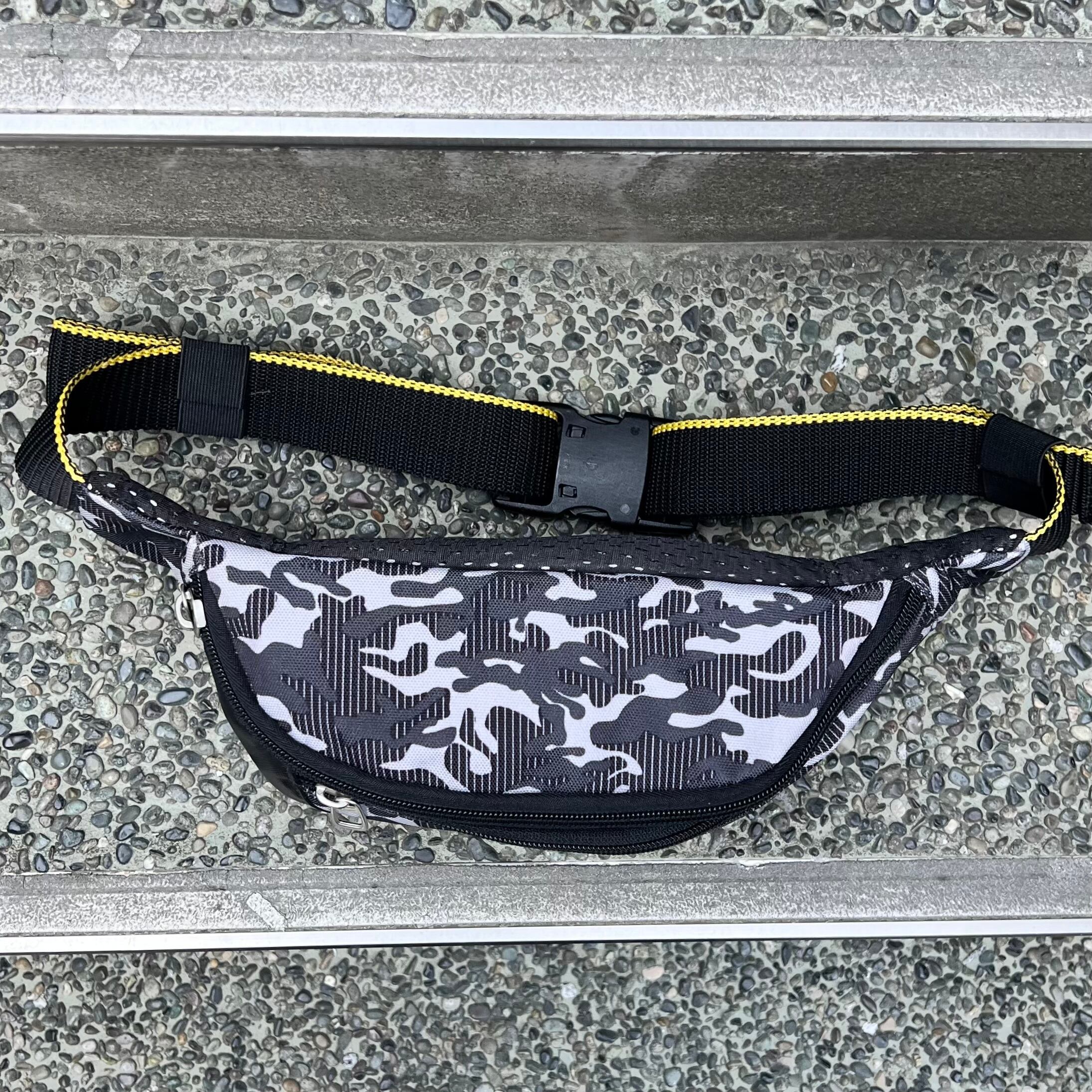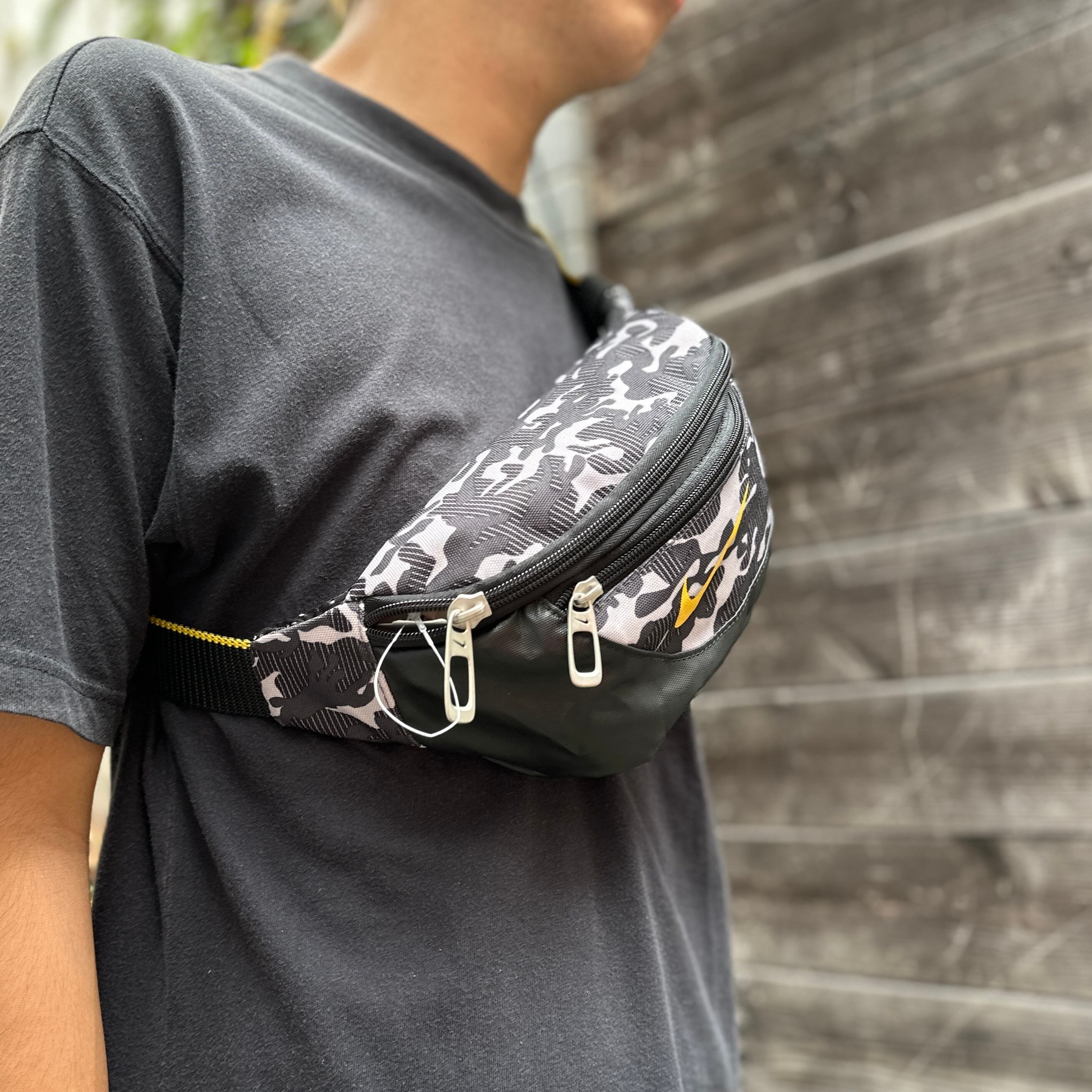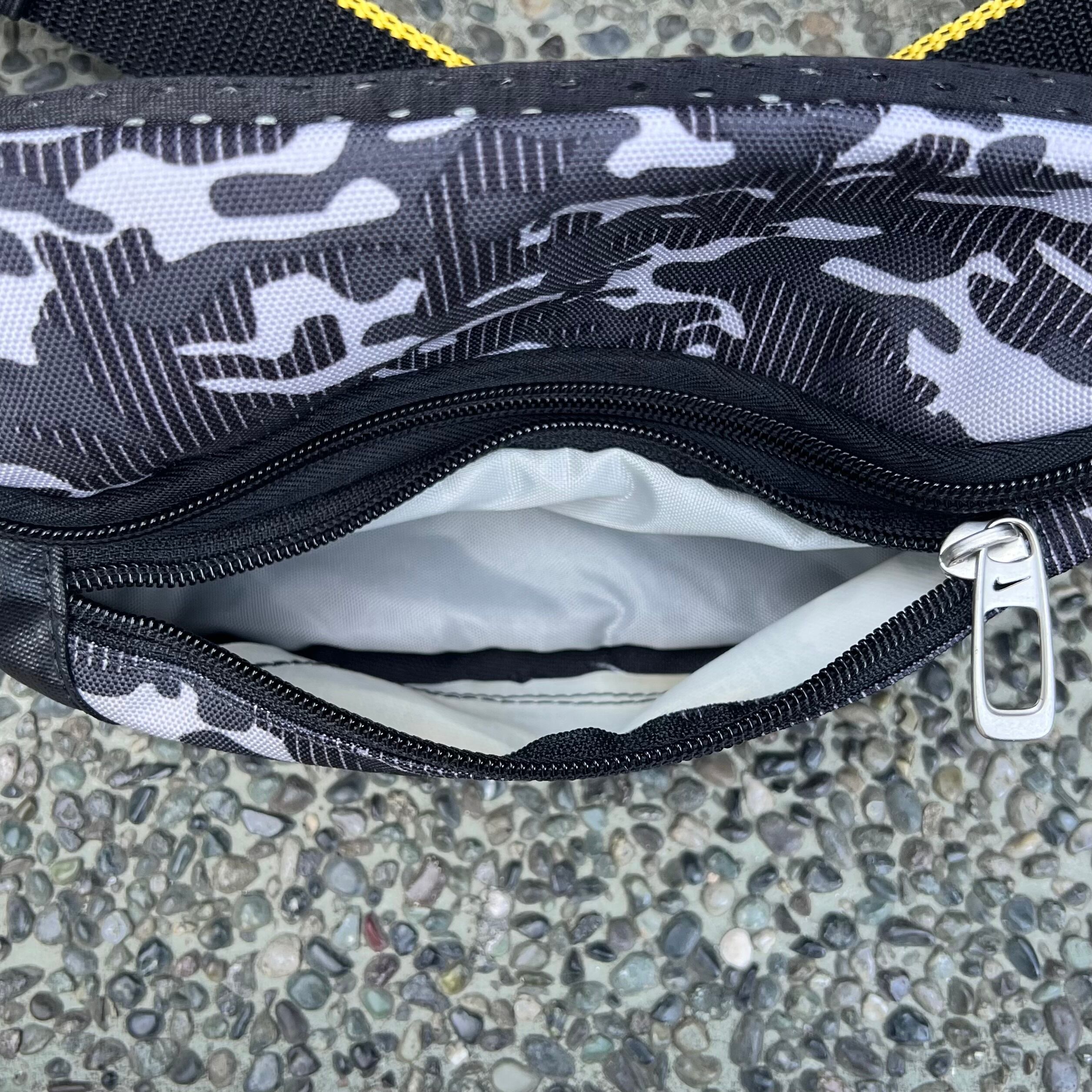 ブラック/グレー系カモフラージュxブラックのナイロン混素材、フロントにスウォッシュプリント、ジッパーで開閉のメインポケットとフロントのサブポケット、スウォッシュ入りジッパースライダー、背面にメッシュ素材を使用したアスリート向けデザインです。