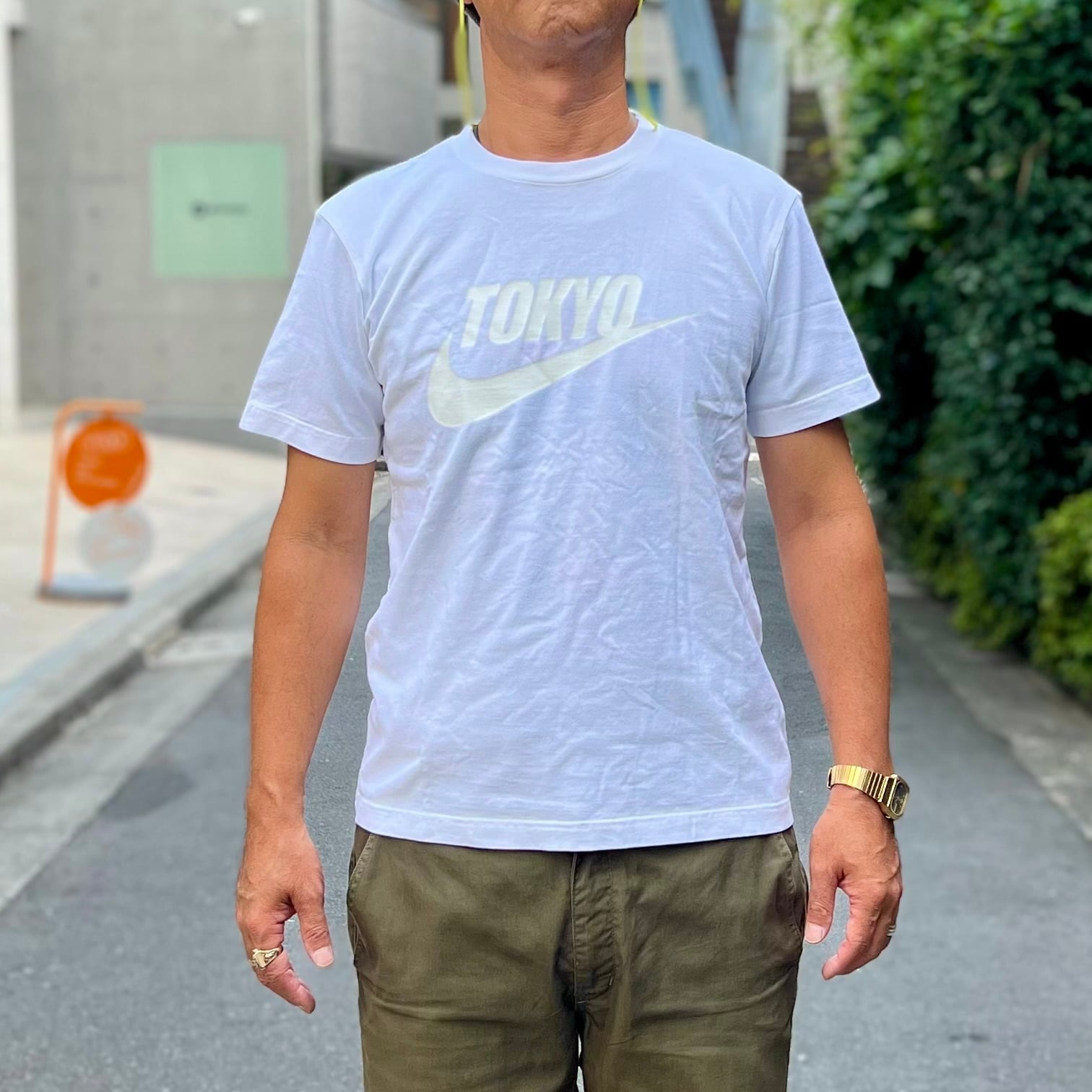 ホワイトのコットン素材、フロントにスウォッシュにTOKYOプリント、バック襟元にフラグメントデザインロゴマーク、右裾にコラボネームプリントが入るデザインです。
