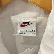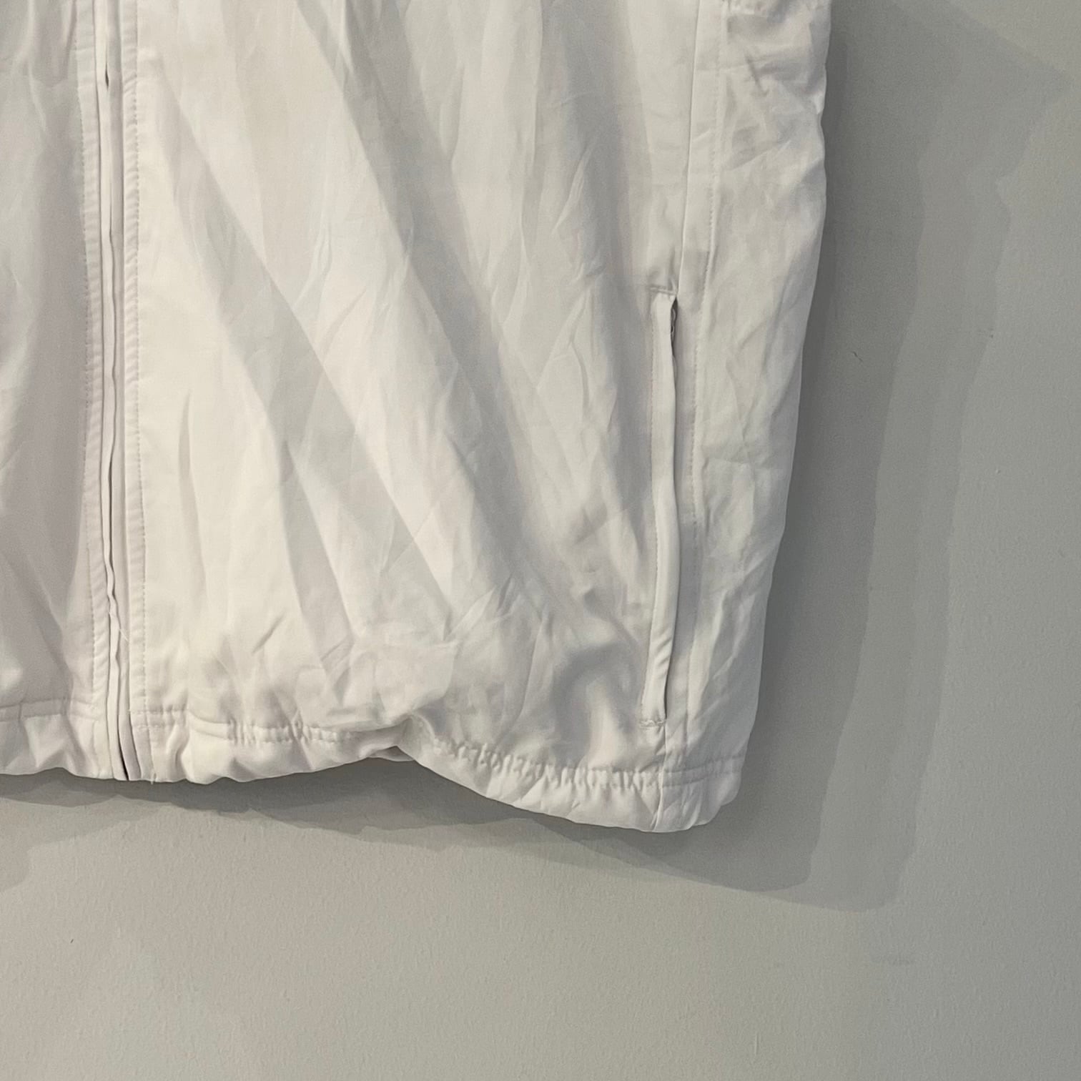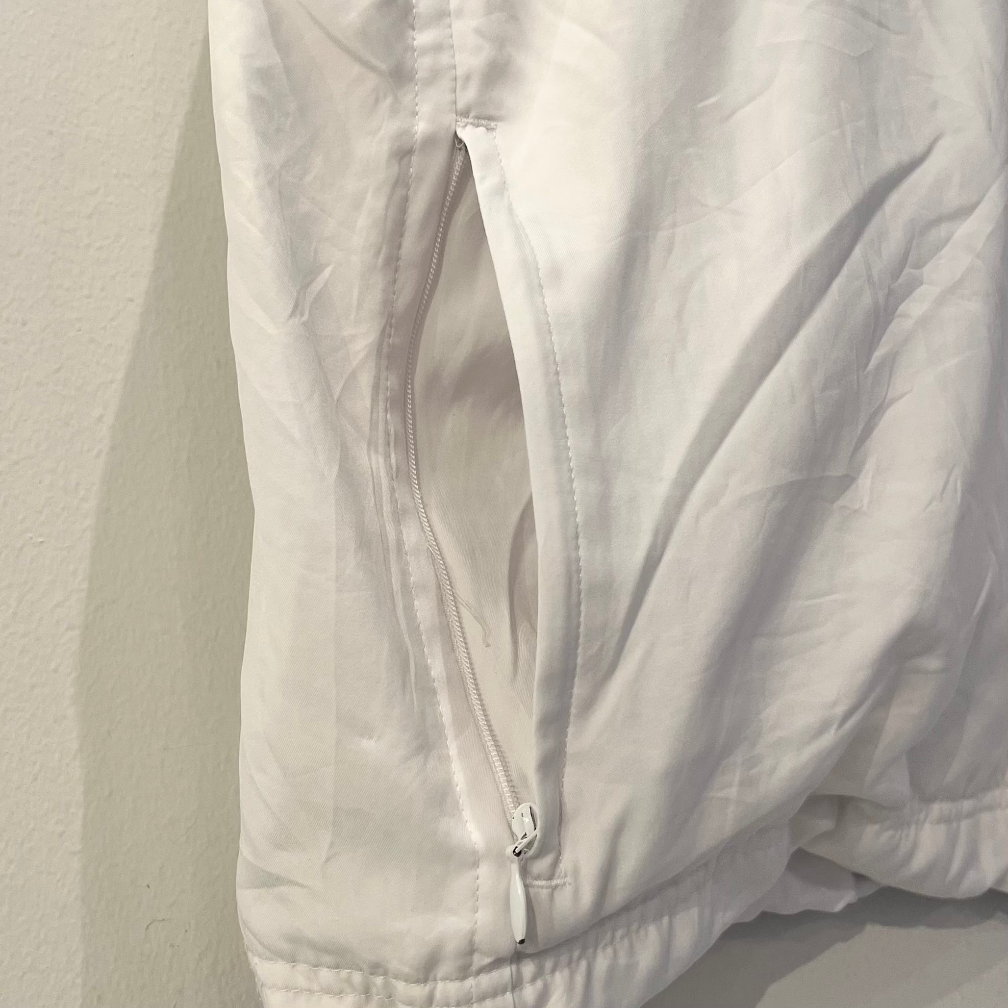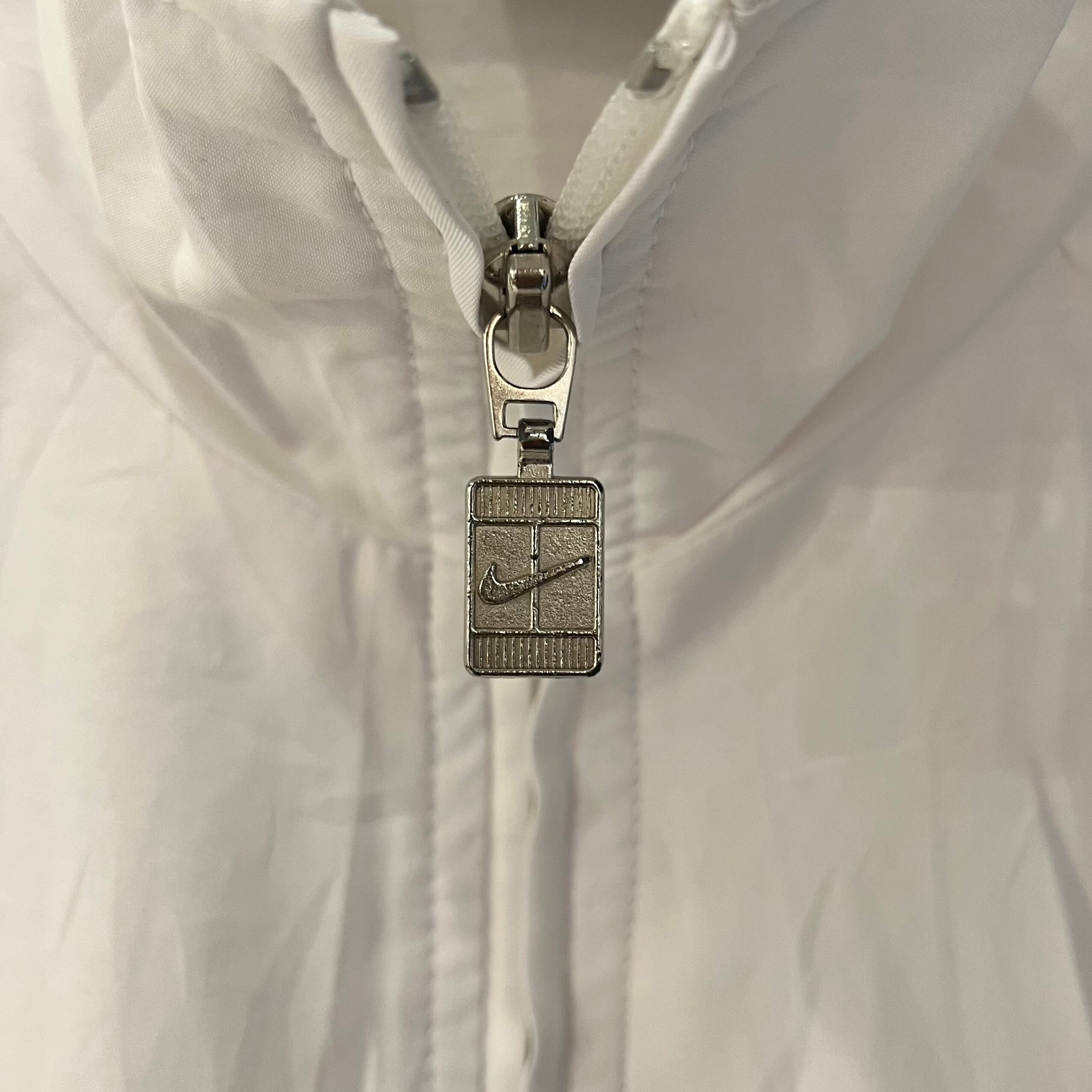 ホワイトのポリエステル素材、左胸にNIKE TENNISロゴマークワッペン、ジッパー付きハンドウォームポケット、ナイキテニスロゴマークのメタルプレートジッパースライダー、バック襟元にスウォッシュ刺繍、裾にドローコードが入るデザインです。
