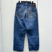 ウォッシュドブルーデニム、バックポケットとその周辺にデザイン刺繍、左バックポケットにネーム、右バックポケットにネーム、レザーパッチ、ロゴ入りボタン、リベットの付いた5ポケット型デザインです。