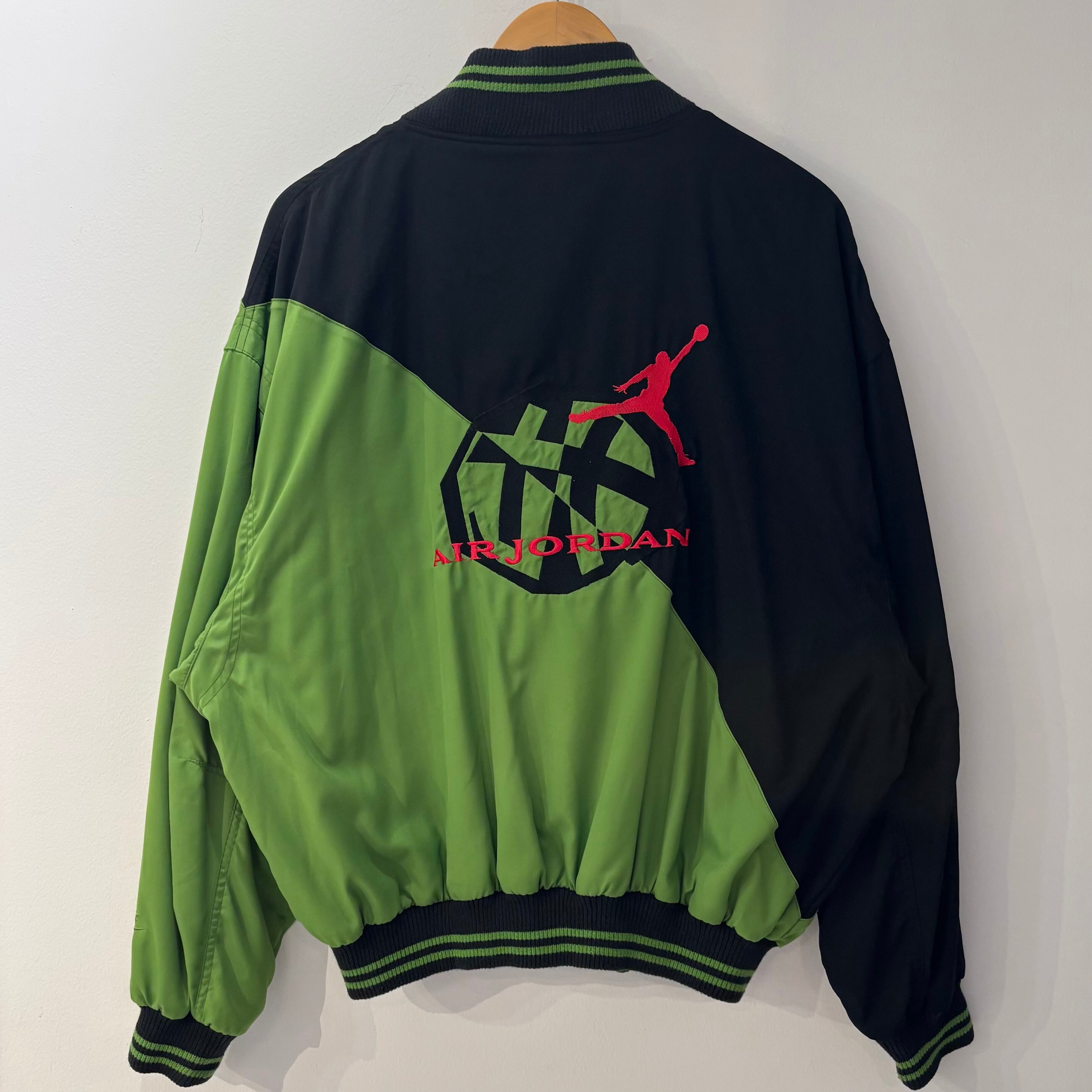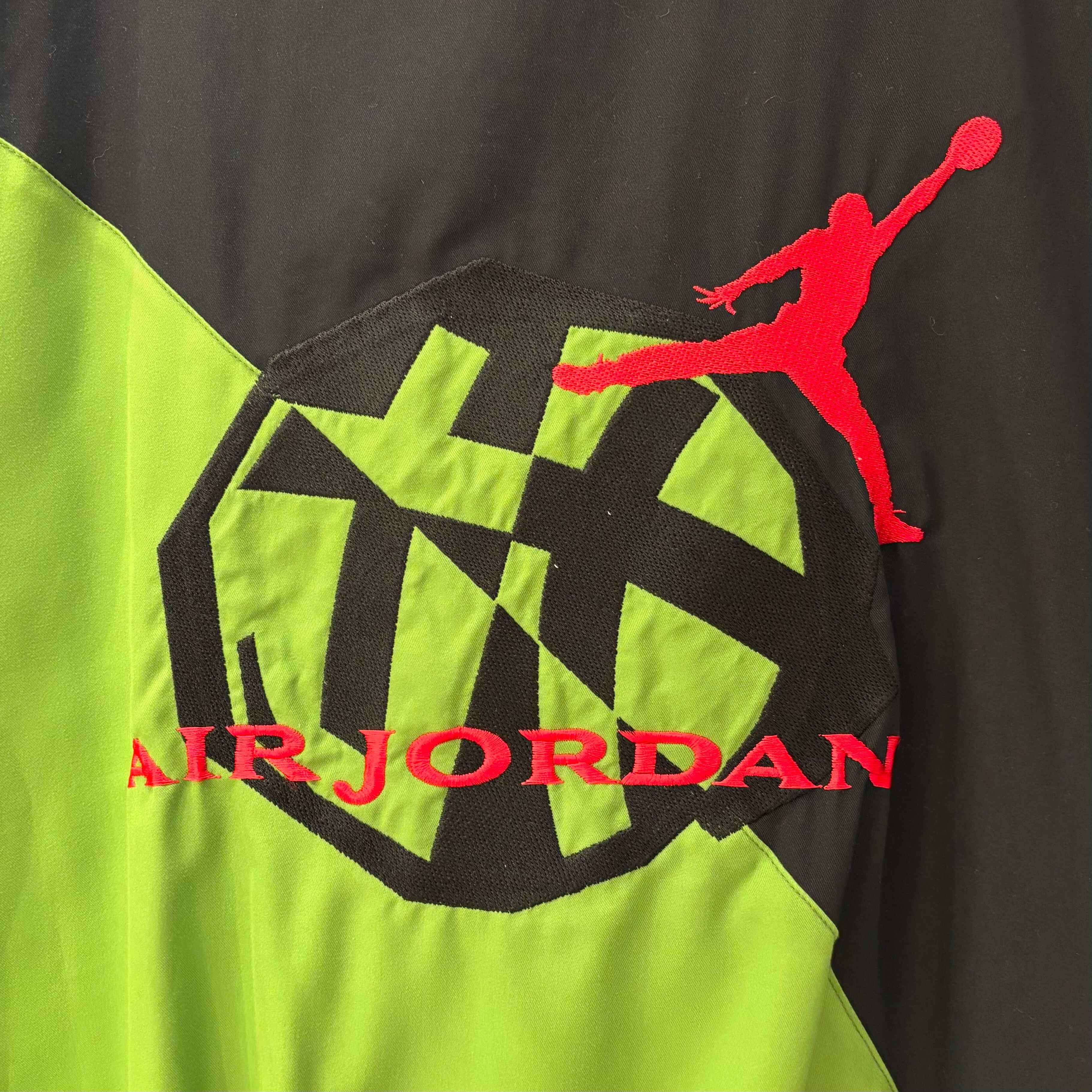 ブラックxグリーンのポリエステル素材、左胸にジャンプマンとロゴ刺繍、バックにジョーダン9のロゴマークとロゴ刺繍、左袖にNIKEロゴ刺繍が入るデザインです。