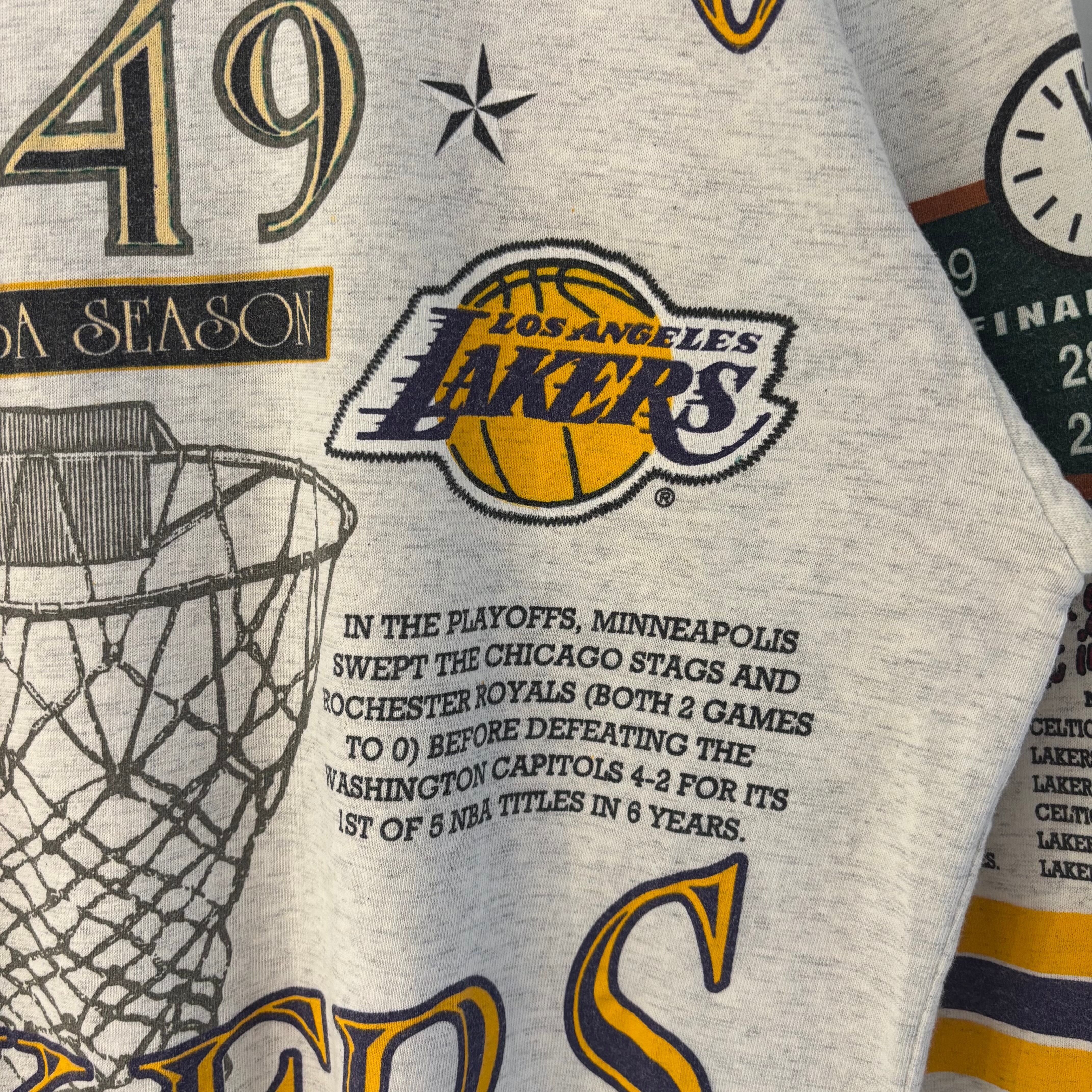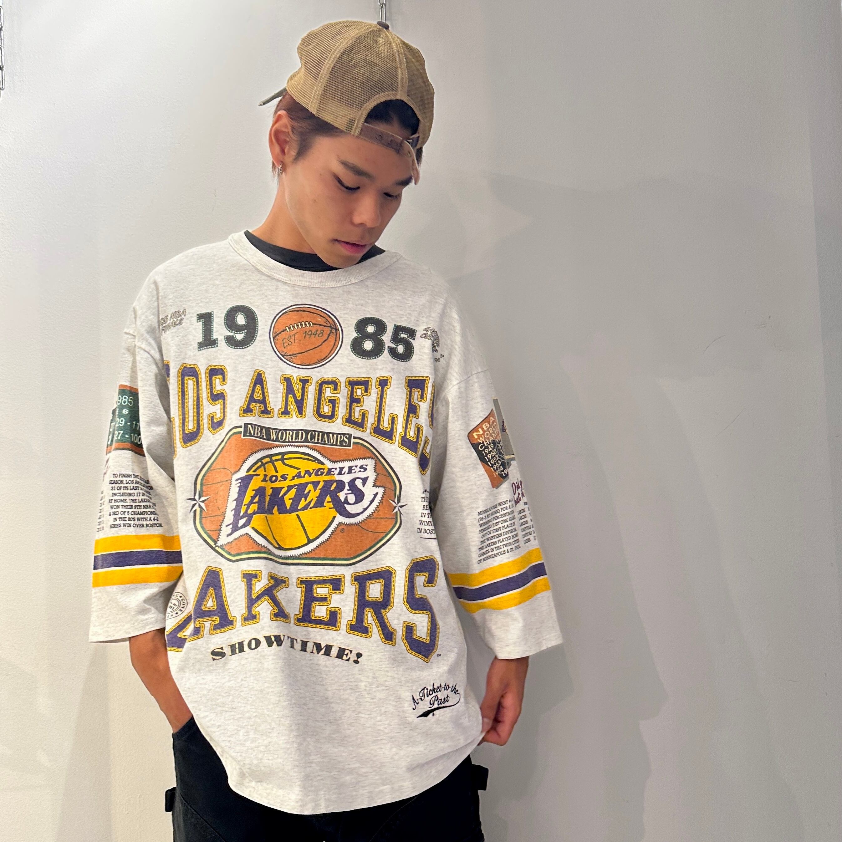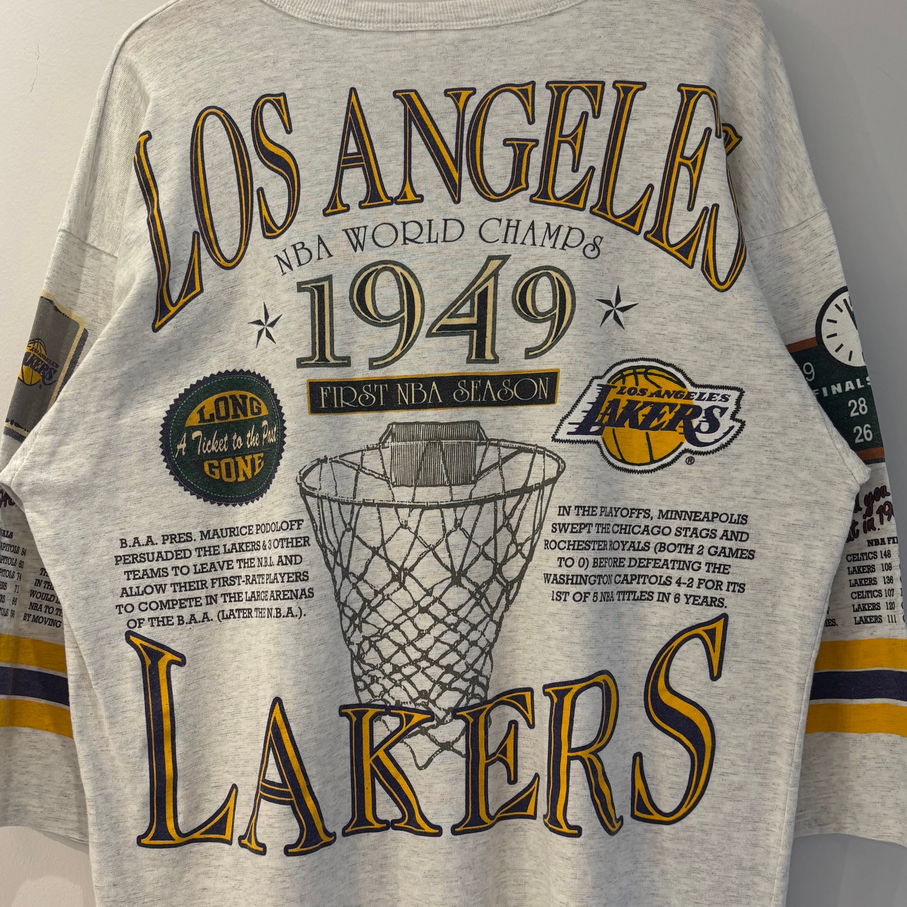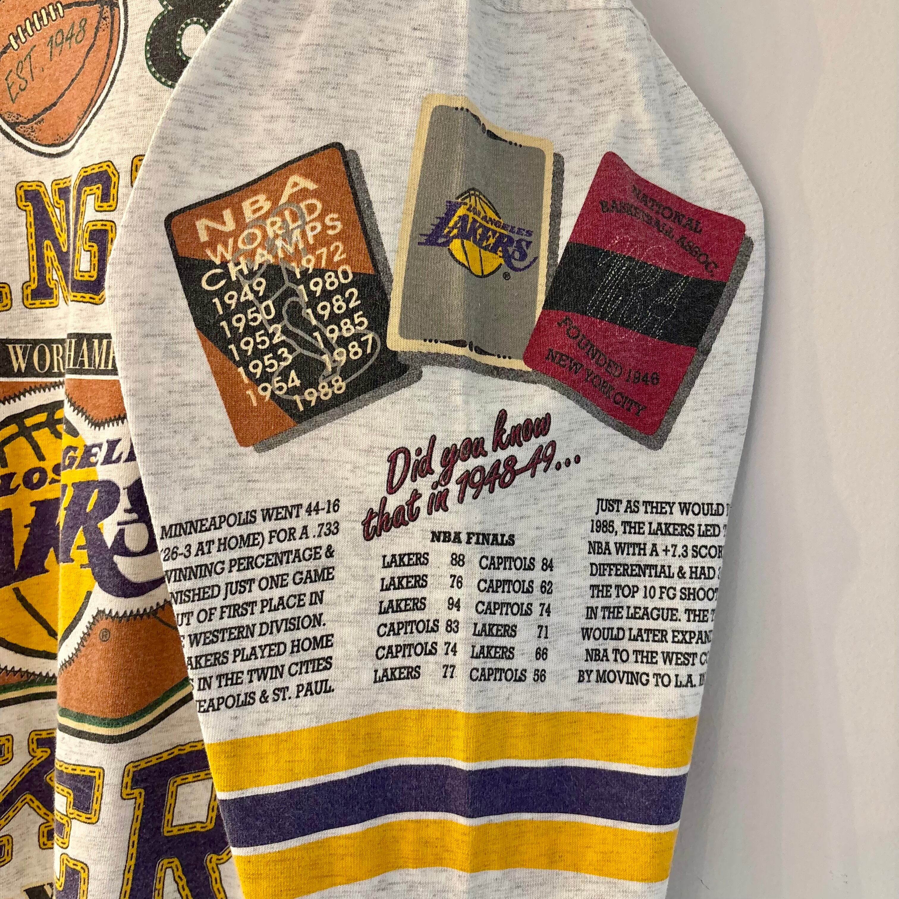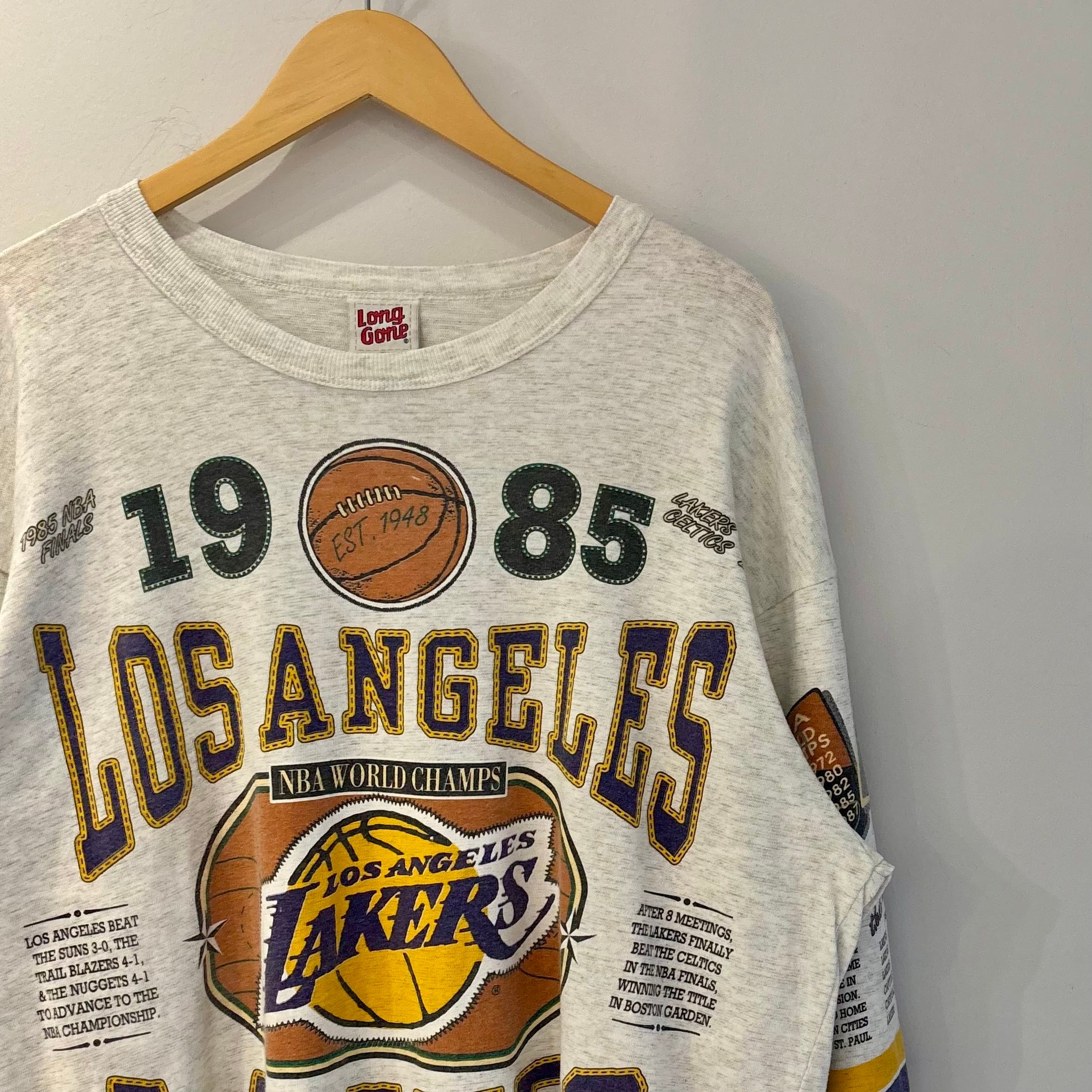 93年のロングゴーン社製、NBAロサンゼルスレイカーズの7分Tシャツになります。