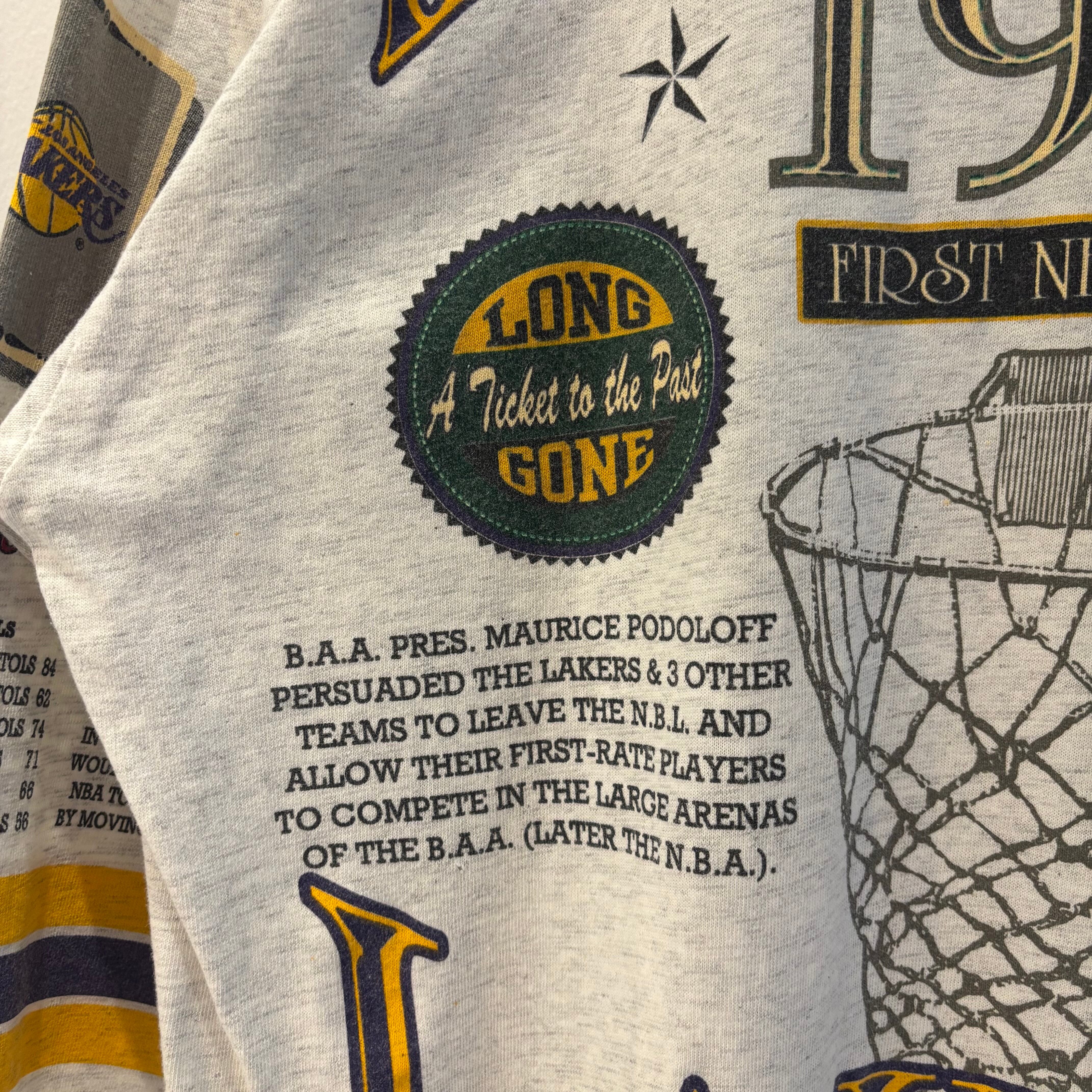 Long GONE NBA LAKERS/ロングゴーン ロサンゼルス レイカーズ 総柄 7分Tシャツ 93年 Made in USA (USED)