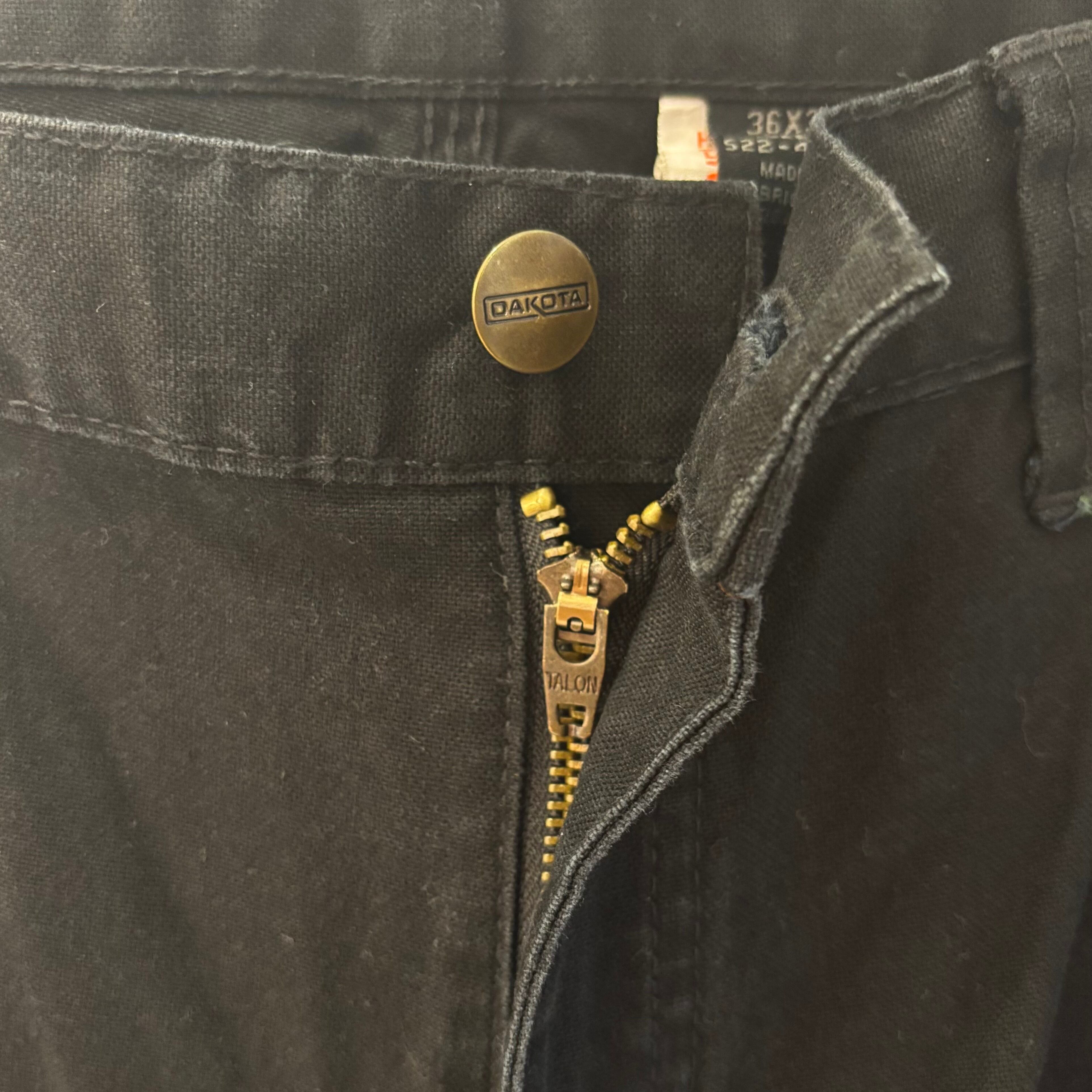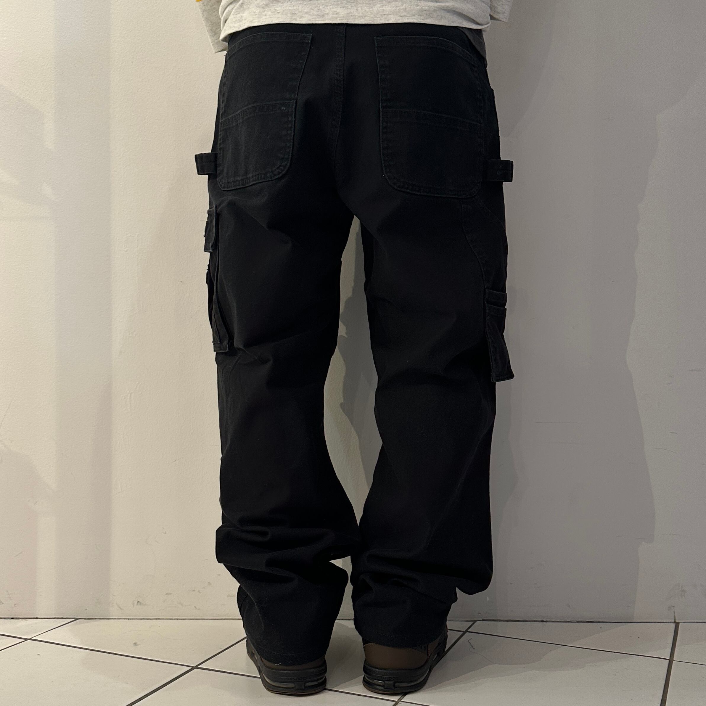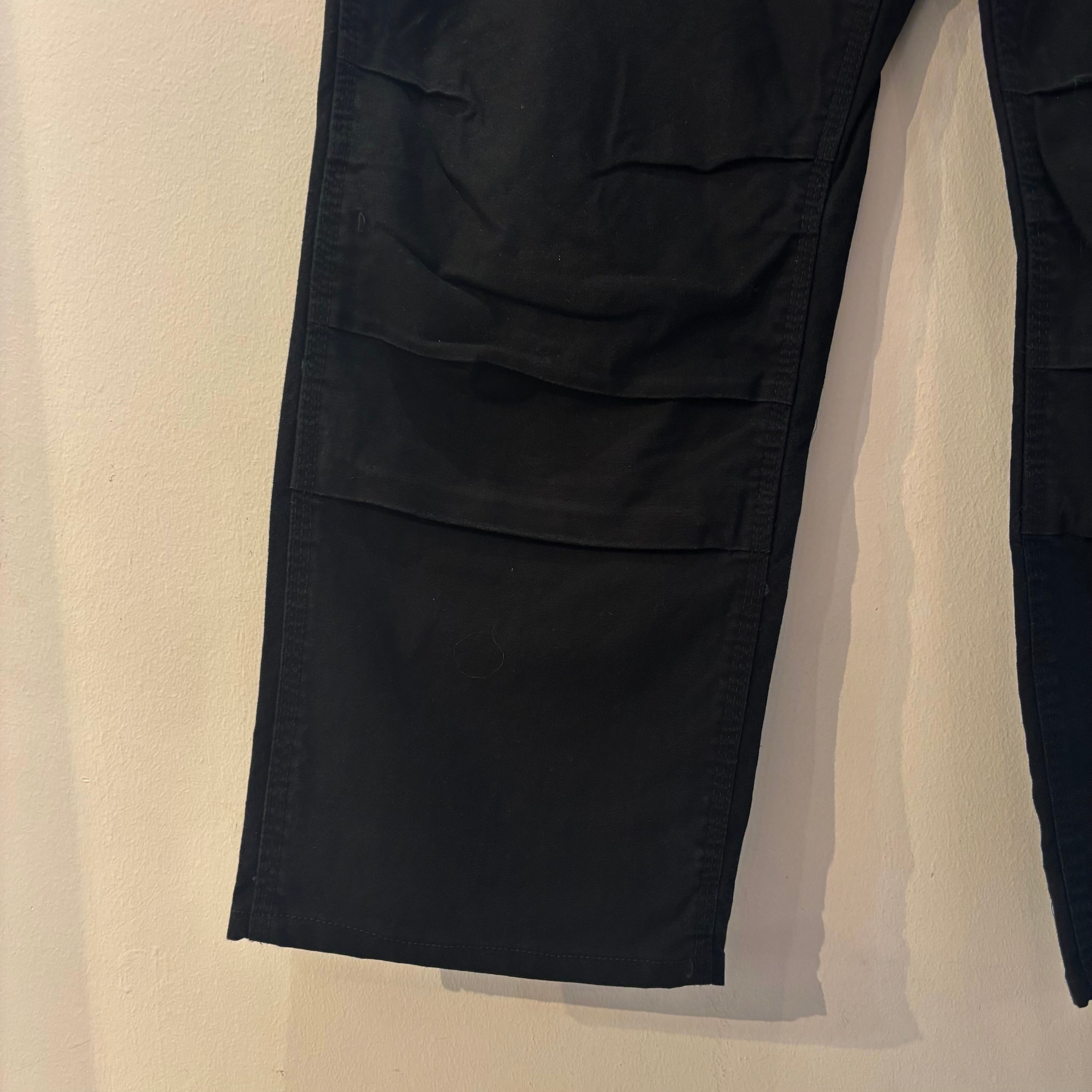 ブラックダック、右足にサイドポケット、左足にカーゴポケット、ロゴ入りボタン、左カーゴポケットにネーム、ダブルニーのデザインです。