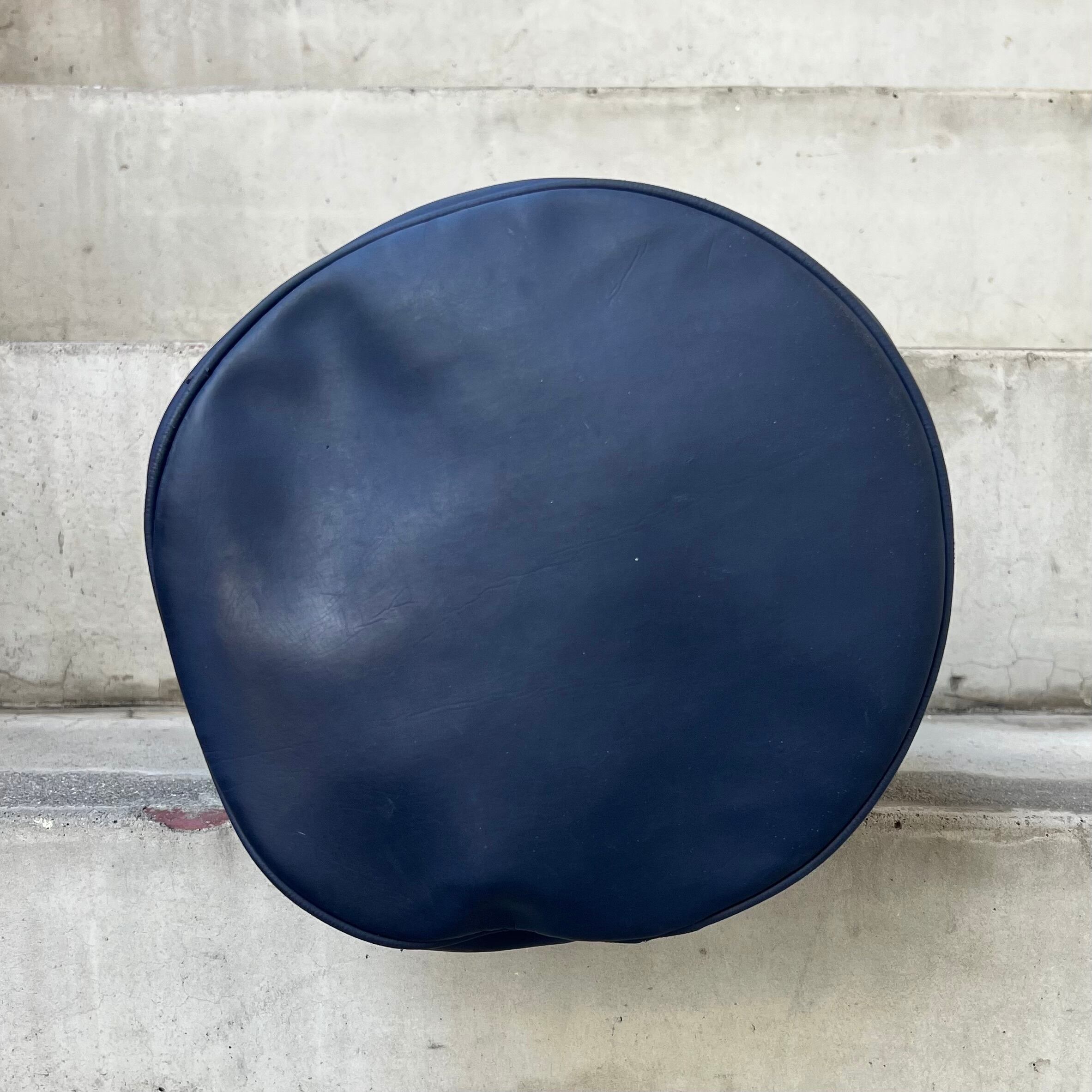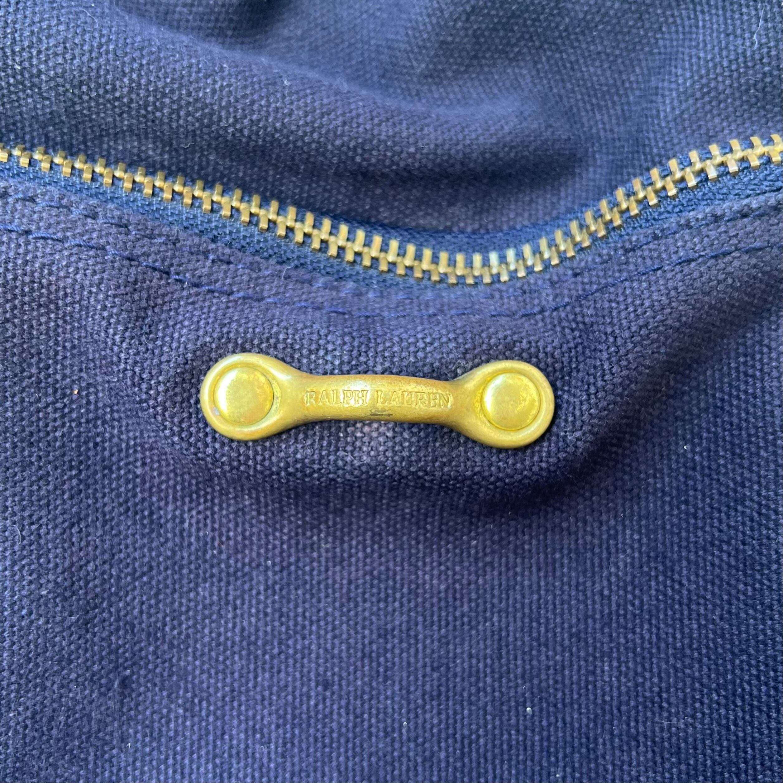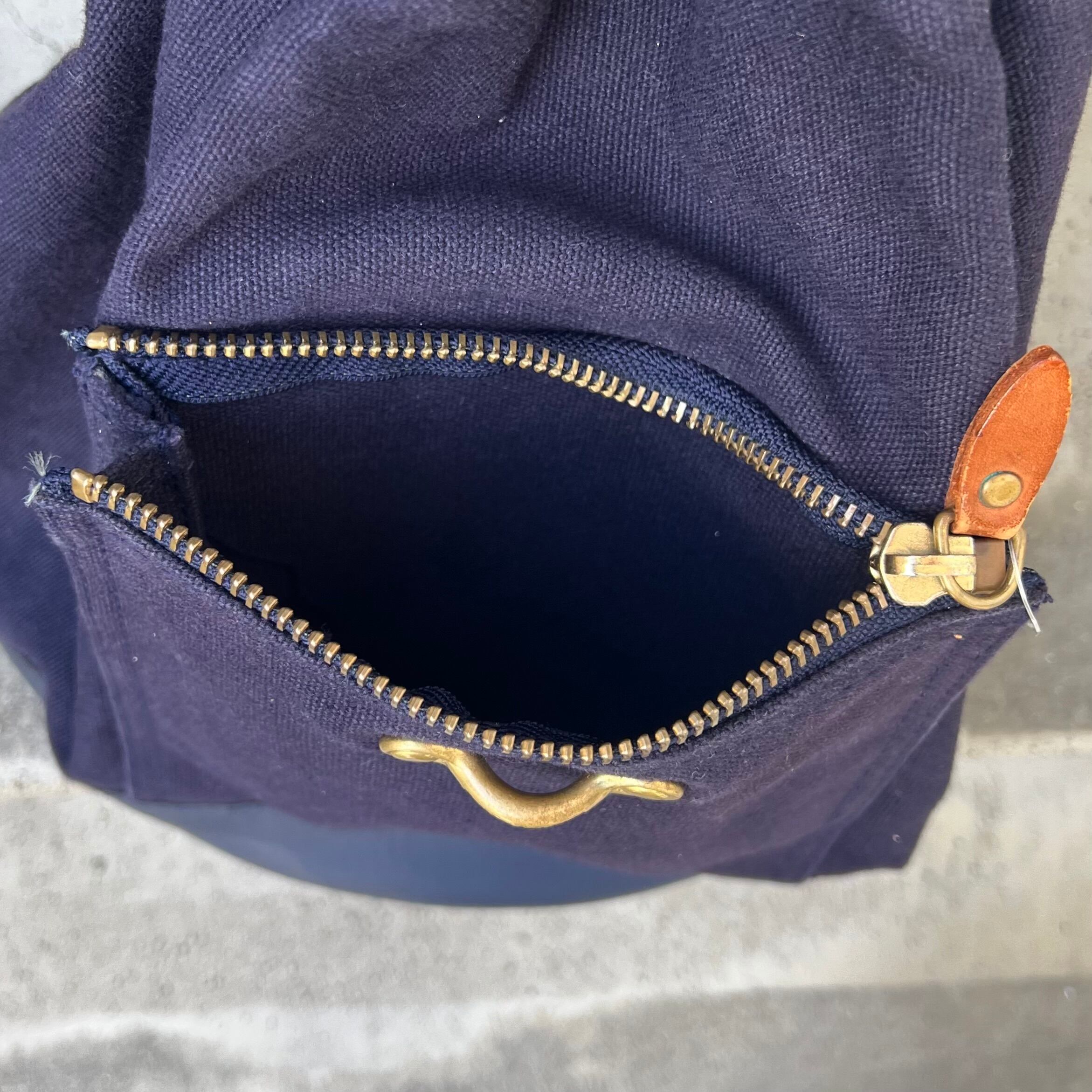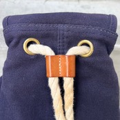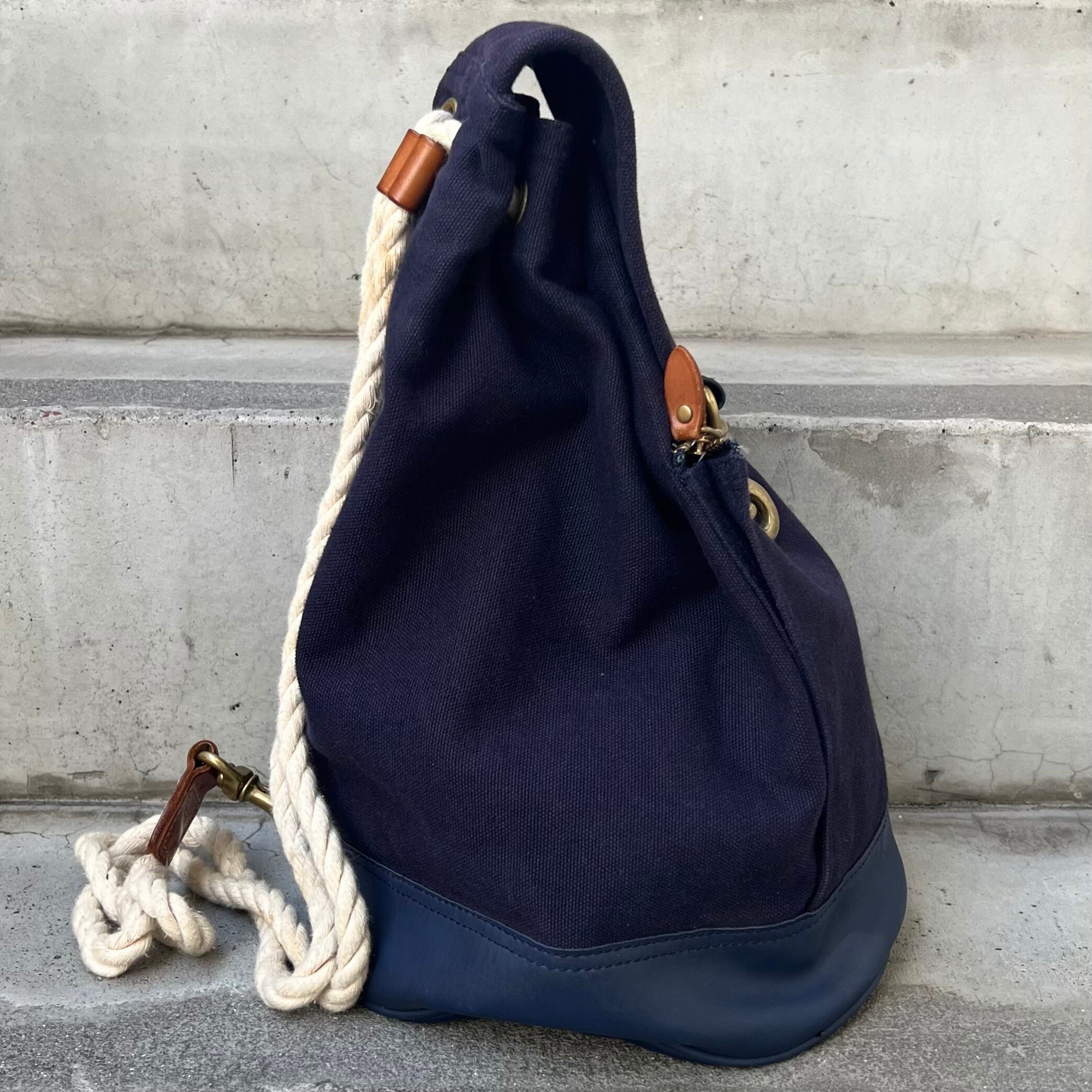 ネイビーのコットン系素材xホワイトストラップ、フロントのフラップにラバーネーム、メインポケットとジッパー付きサブポケット、ジッパー付き内ポケット、レザージッパースライダー、紐で調節するデザインです。