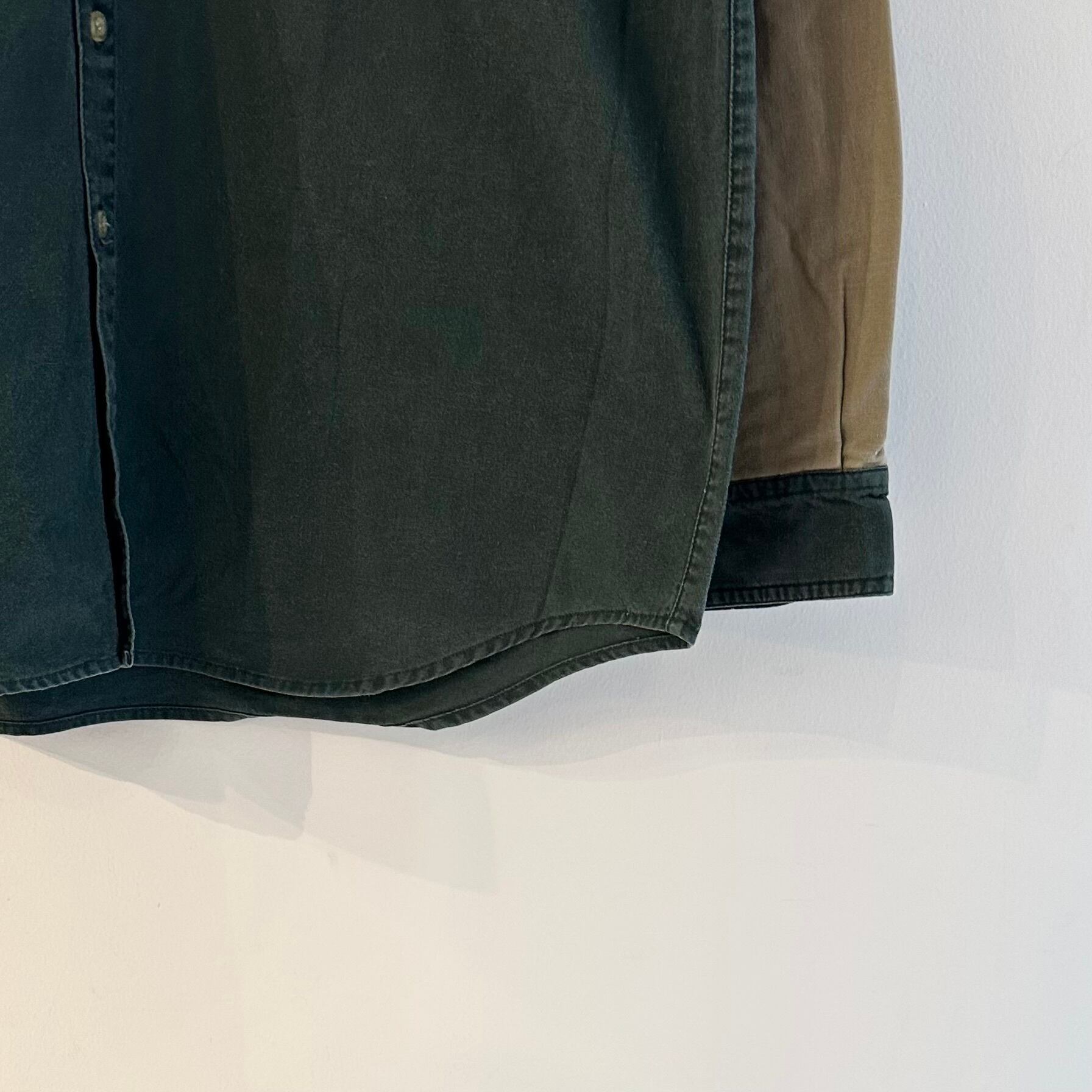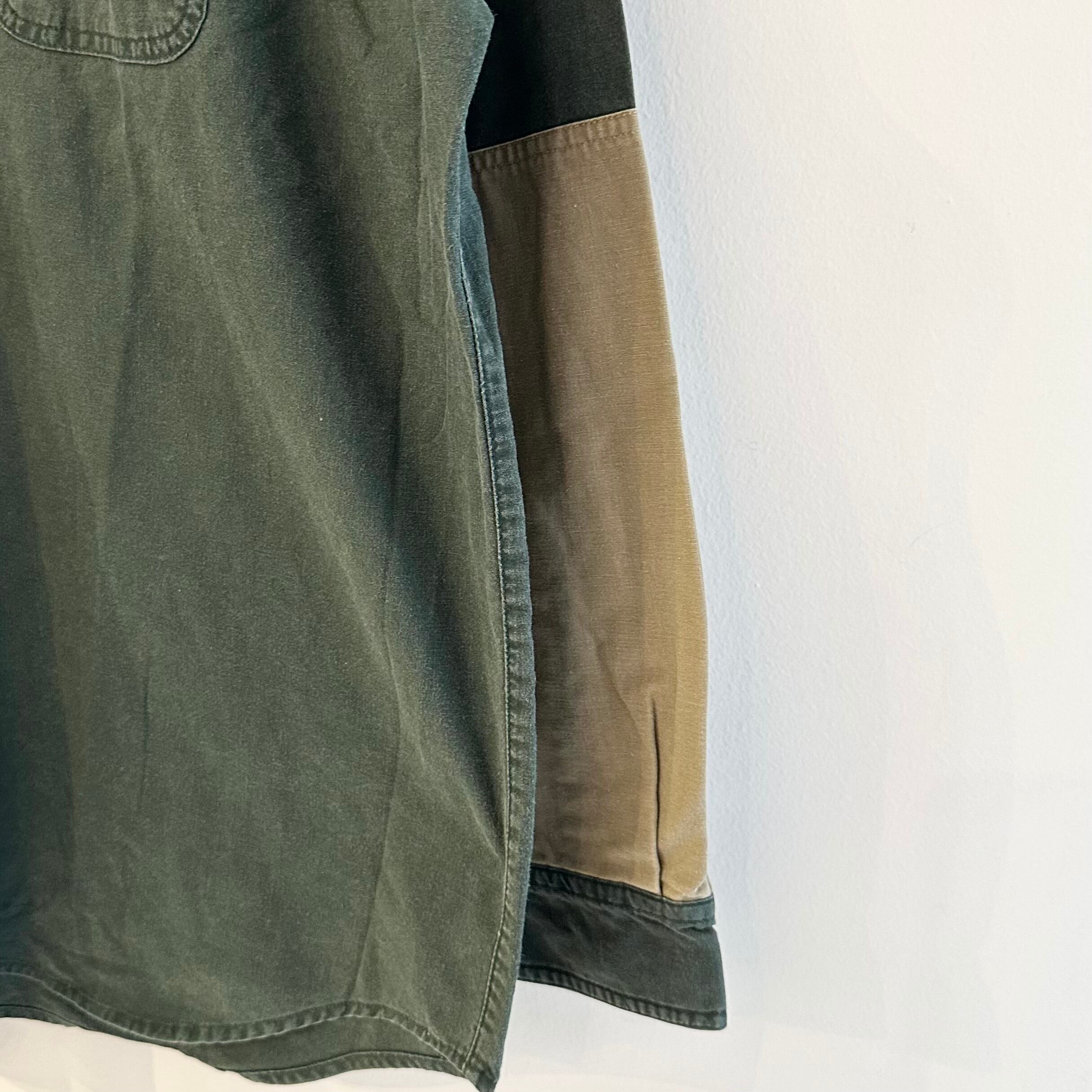 オリーブグリーンxベージュのカラーブロックの切り替え、右肩に補強の当て布が付いたヘビーデューティーなデザインです。