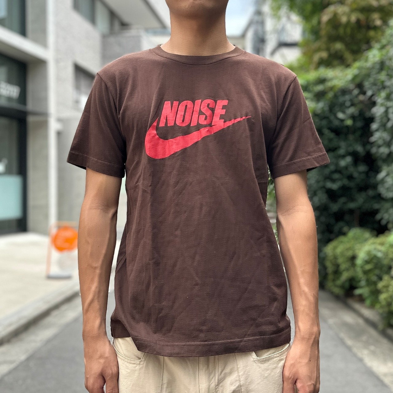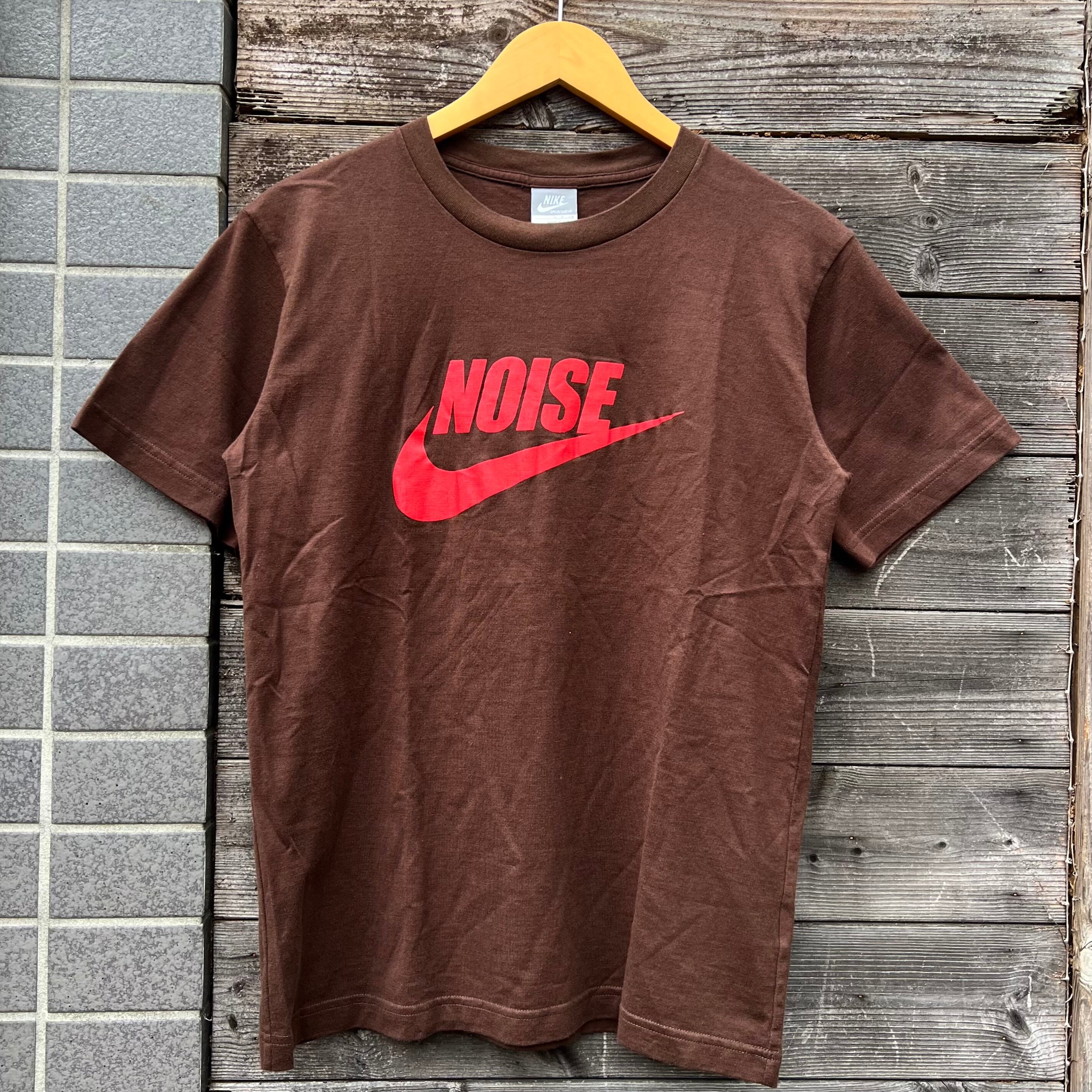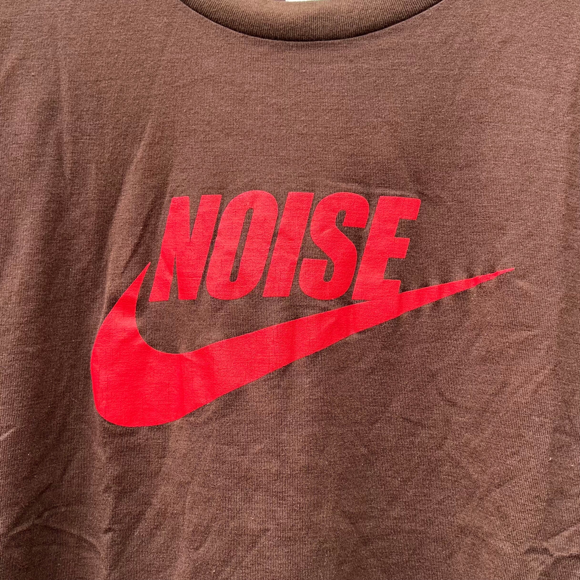 ブラウンのコットン素材、フロントにスウォッシュにNOISEプリント、バック襟元にフラグメントデザインロゴマークプリントが入るデザインです。