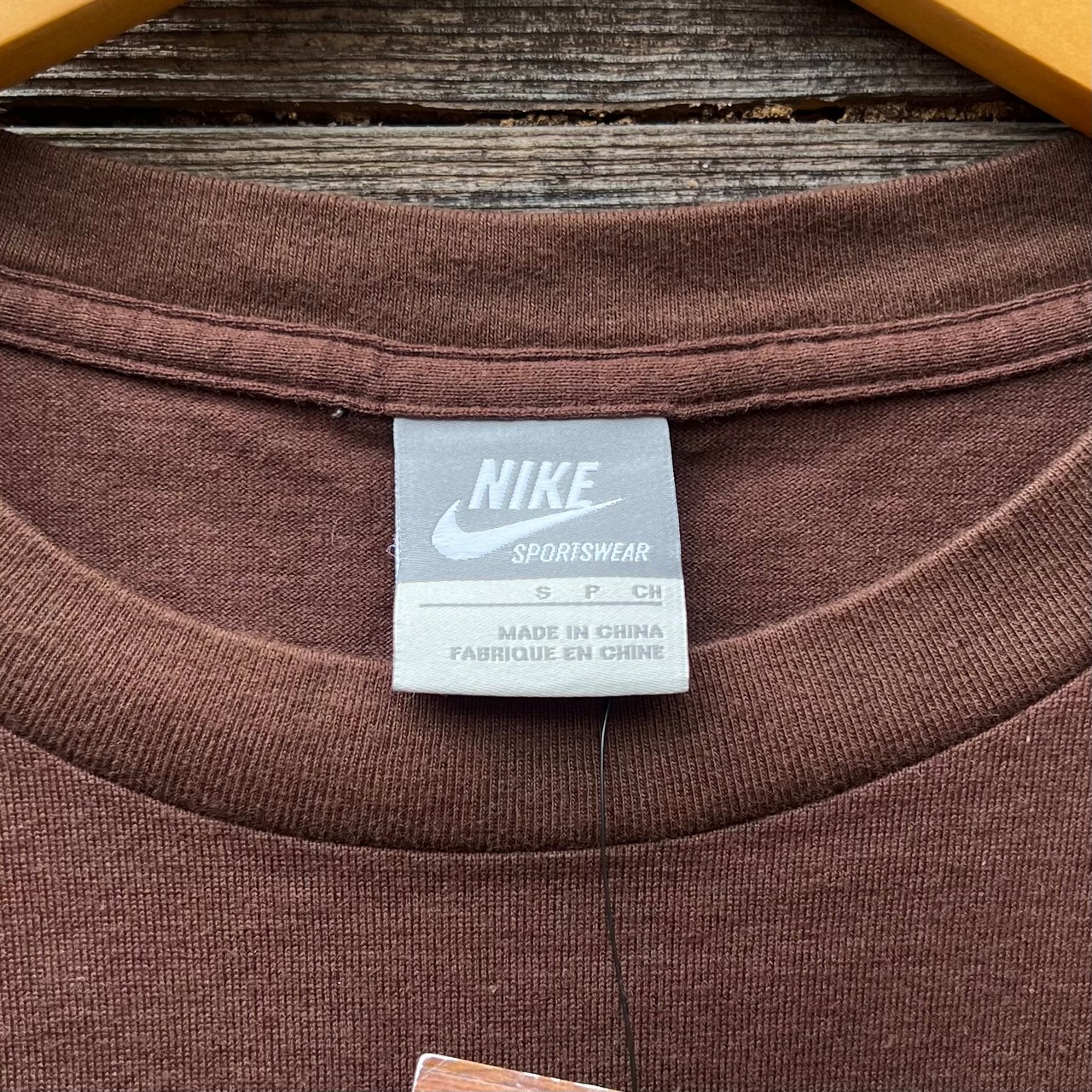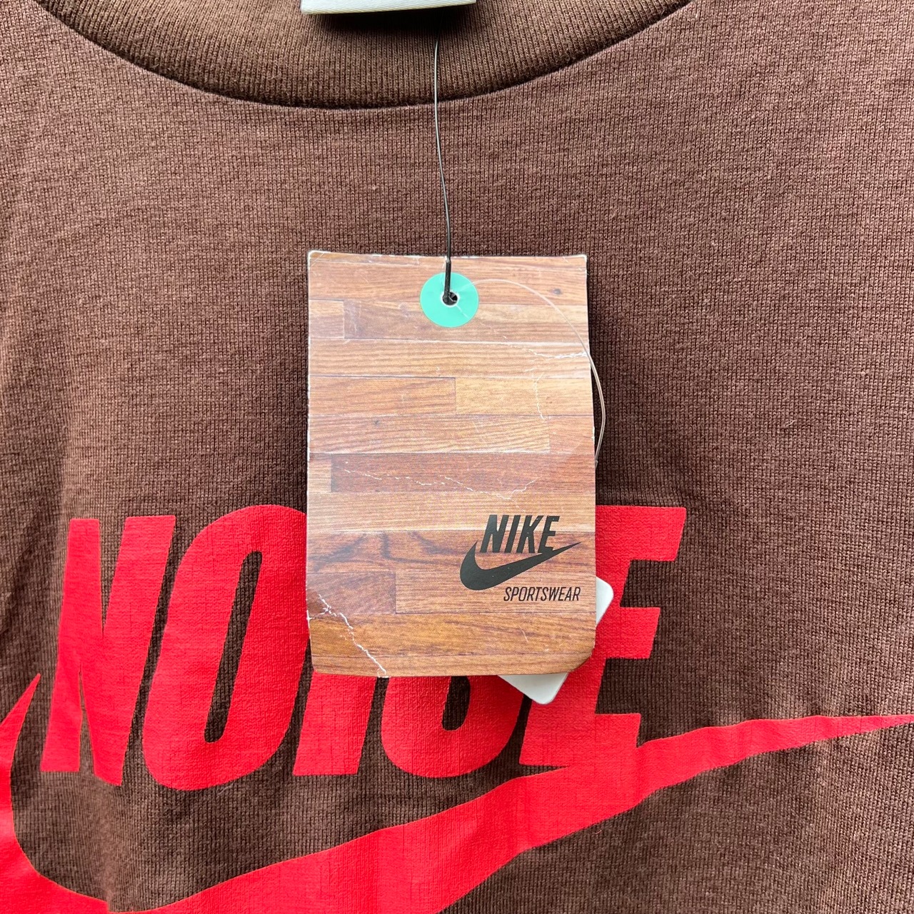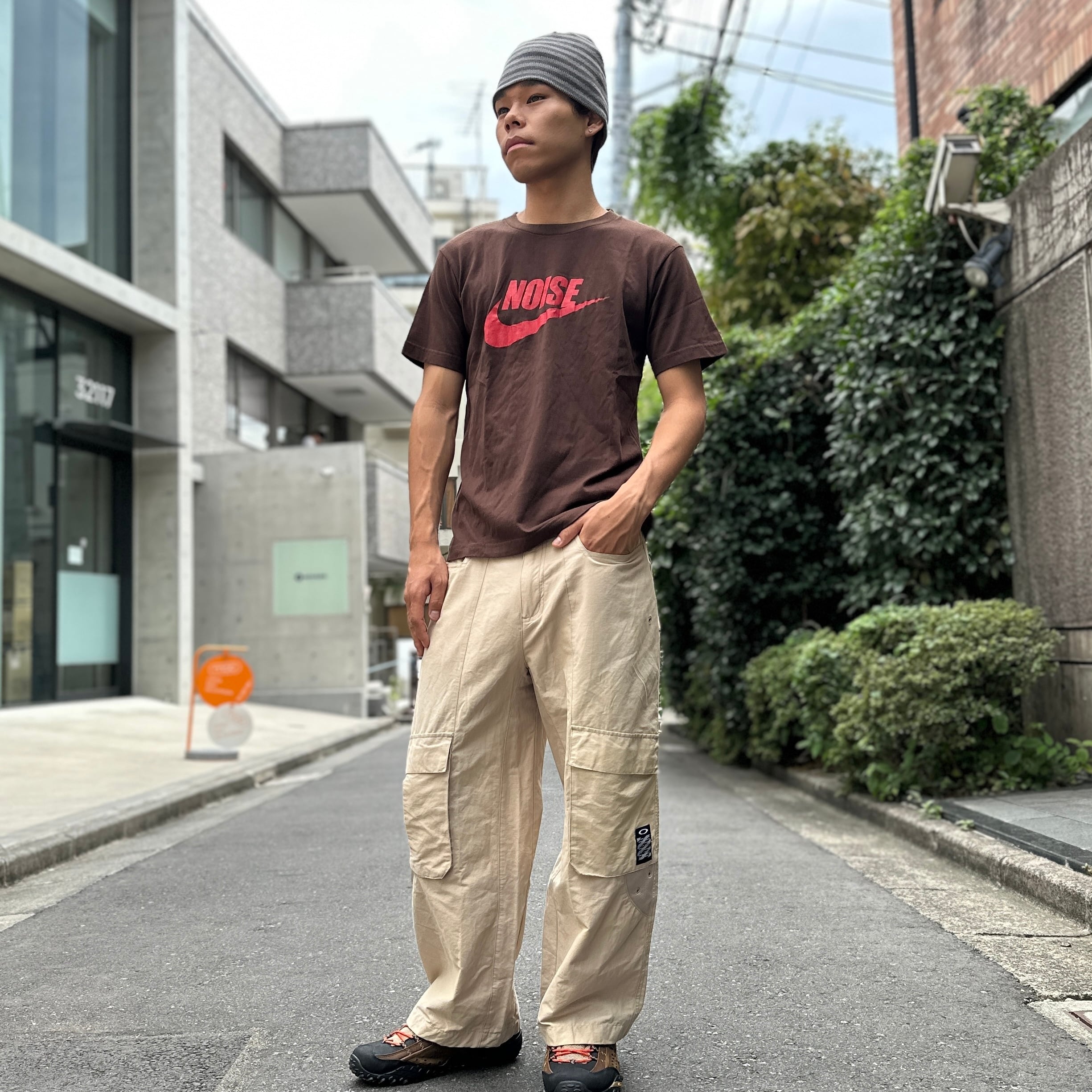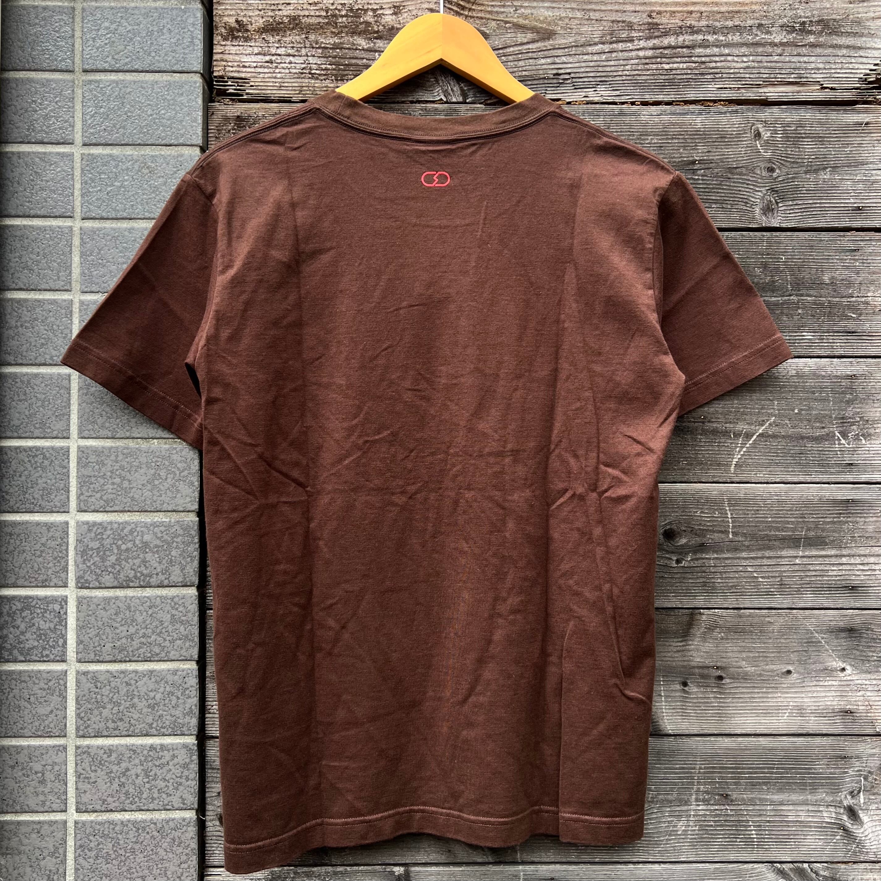 ブラウンのコットン素材、フロントにスウォッシュにNOISEプリント、バック襟元にフラグメントデザインロゴマークプリントが入るデザインです。