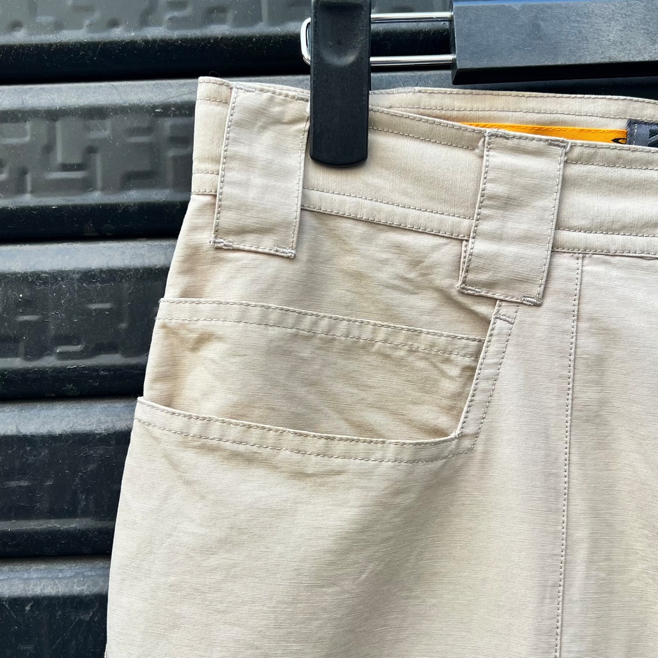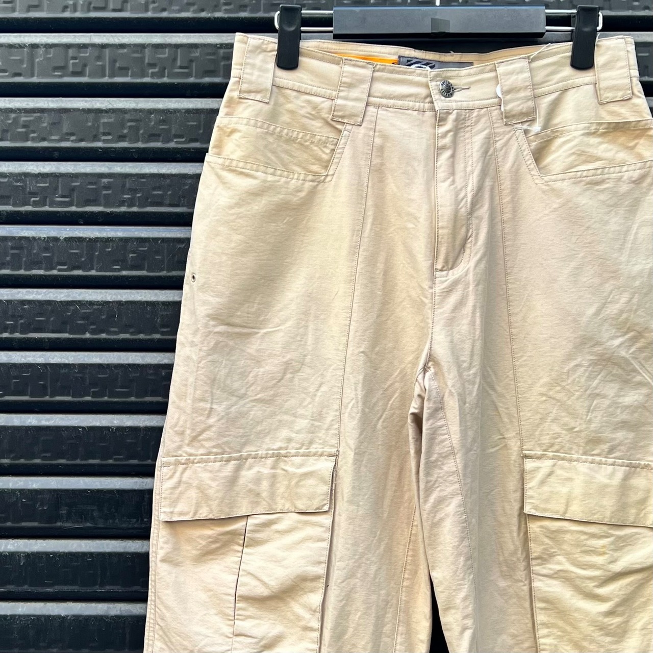 ベージュのポリエステル混素材、左膝のポケットにネーム、両膝にカーゴポケット、2重のハンドウォームポケット、ハンドウォームポケットとフラップ付きサイドポケット、膝下にメッシュ通気口、ロゴ入りボタンを使用したデザインです。