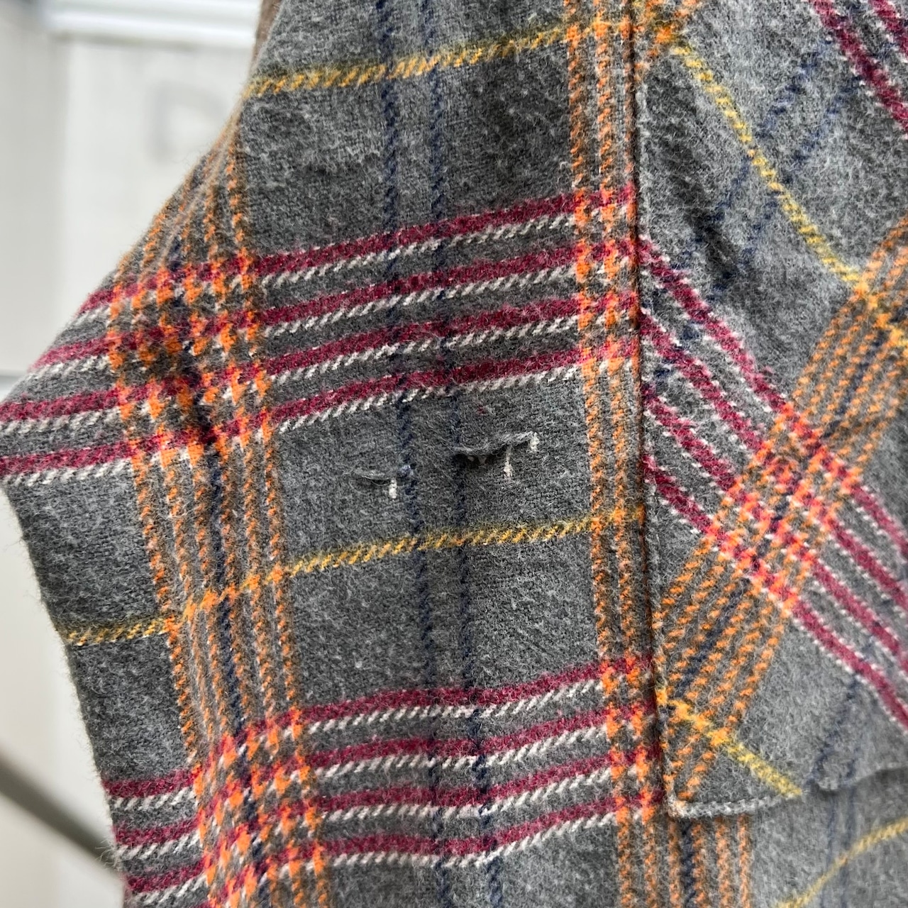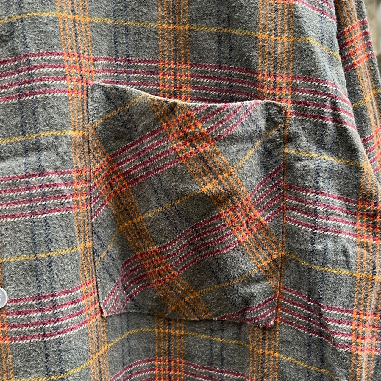 グレー/レッド/オレンジ/ホワイト系の大柄チェック、両胸にバイアスポケット、襟に芯の入るスタンダードデザインです。