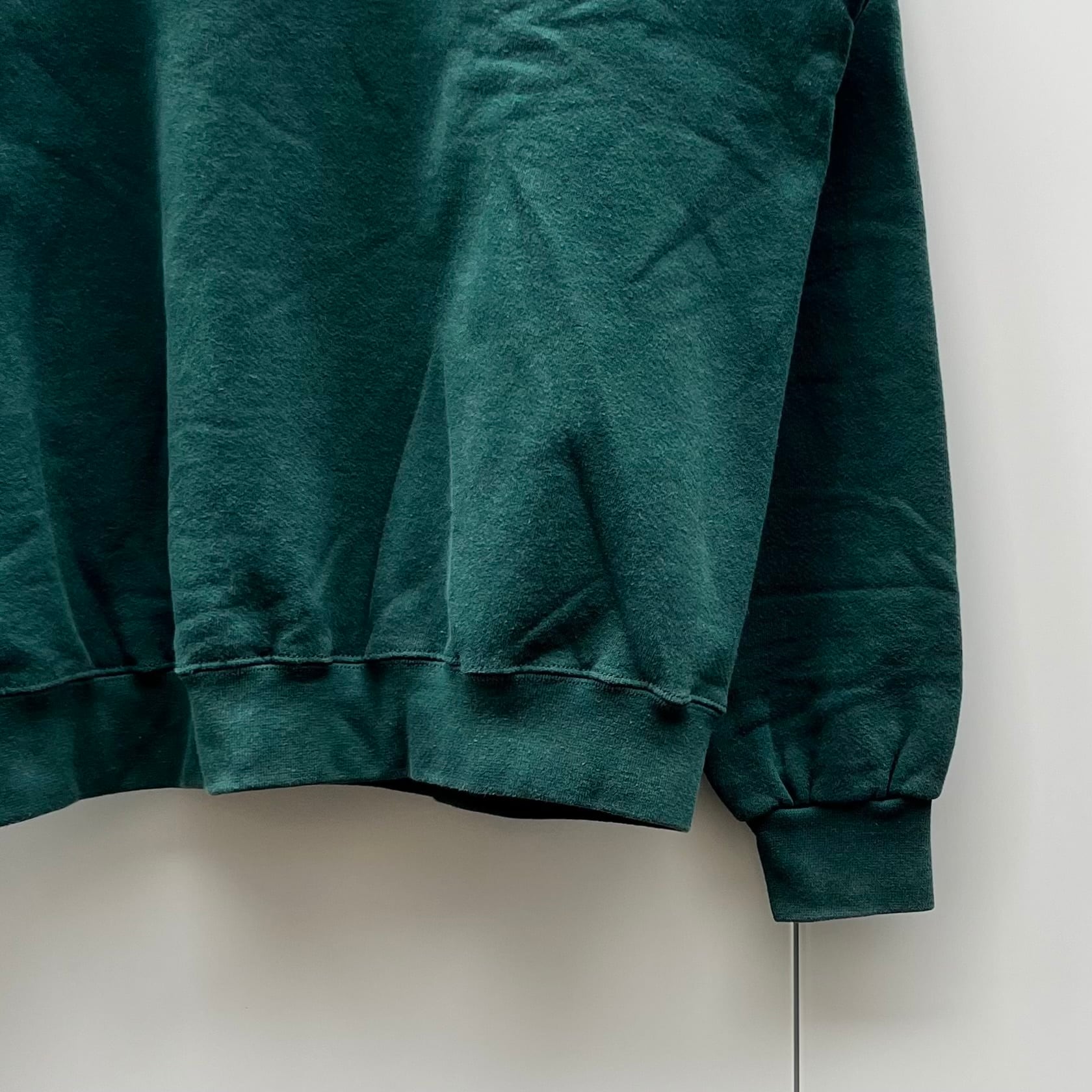 グリーンの裏起毛素材、フロントにビッグスウォッシュプリントが入るシンプルデザインです。