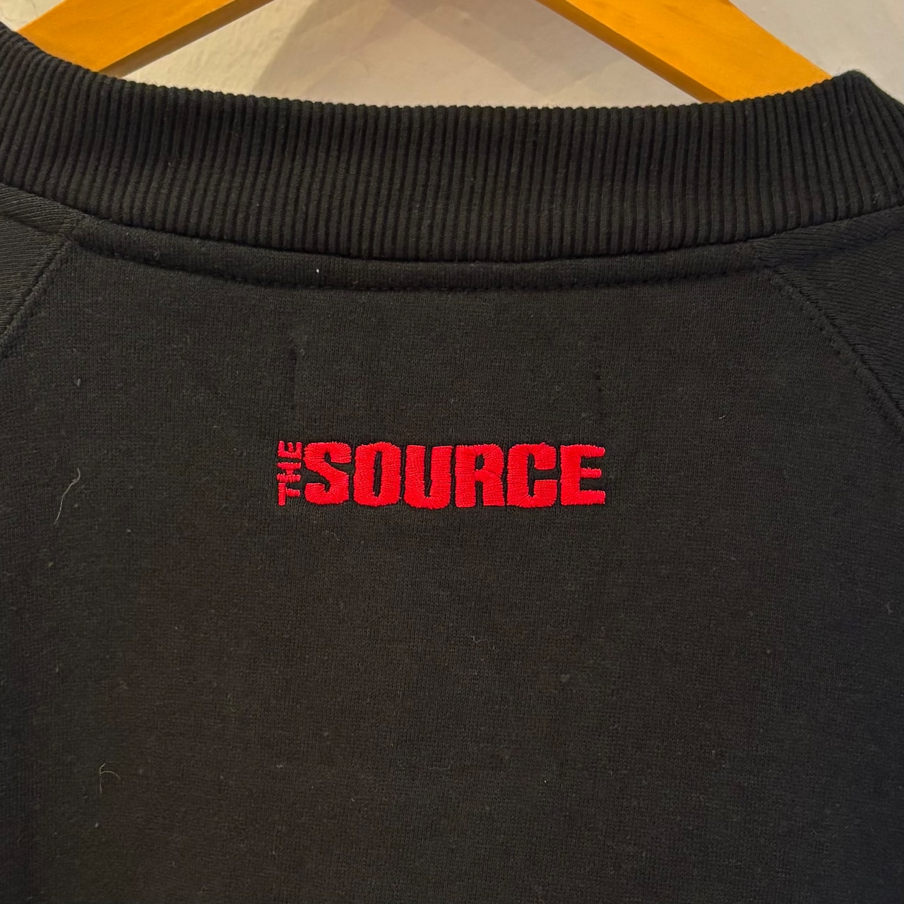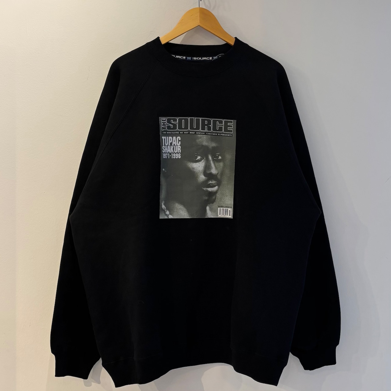 ブラックの裏起毛素材、フロントにTUPACの表紙フォトプリント、バック襟元に小さくTHE SOURCE刺繍、ラグランスリーブのシンプルデザインです。