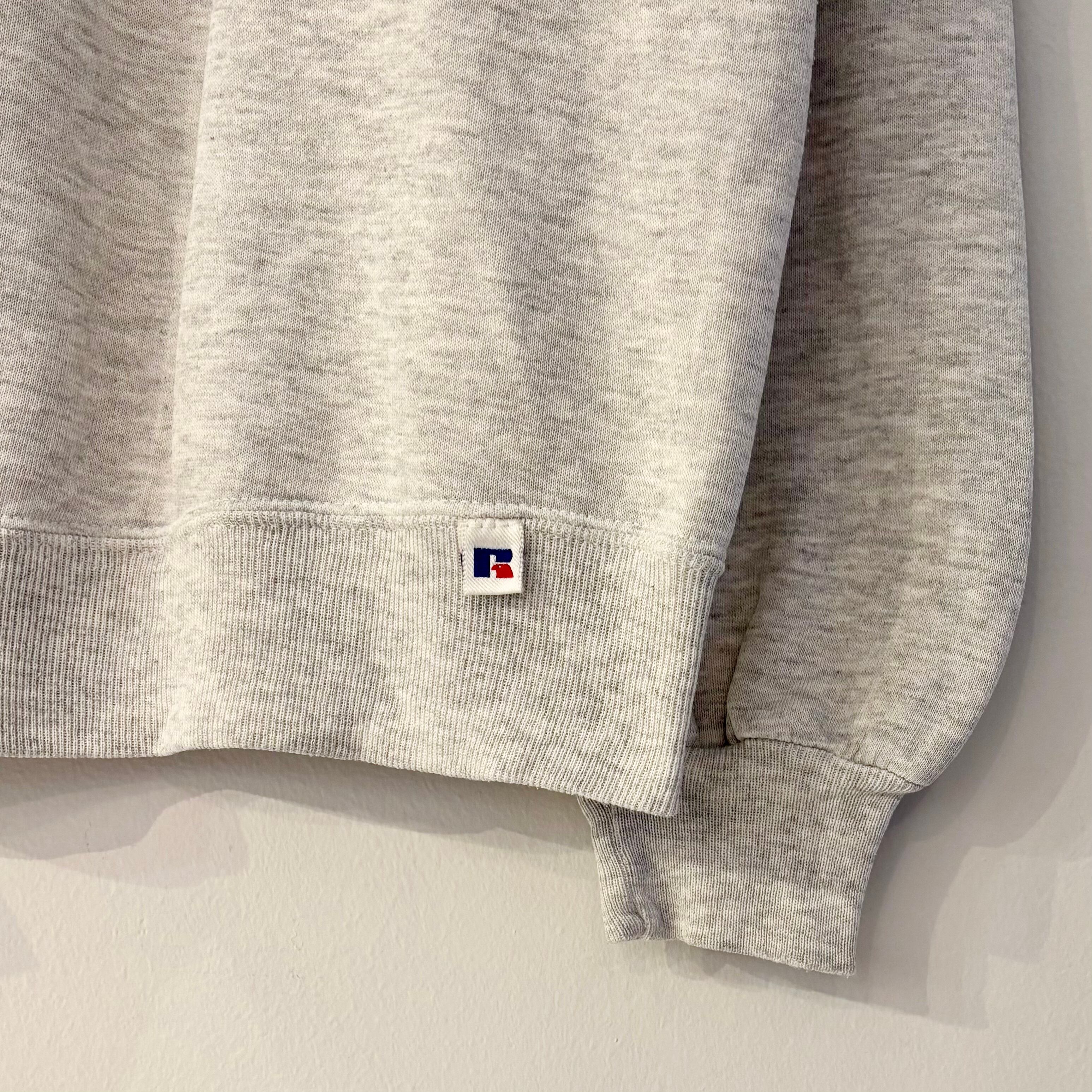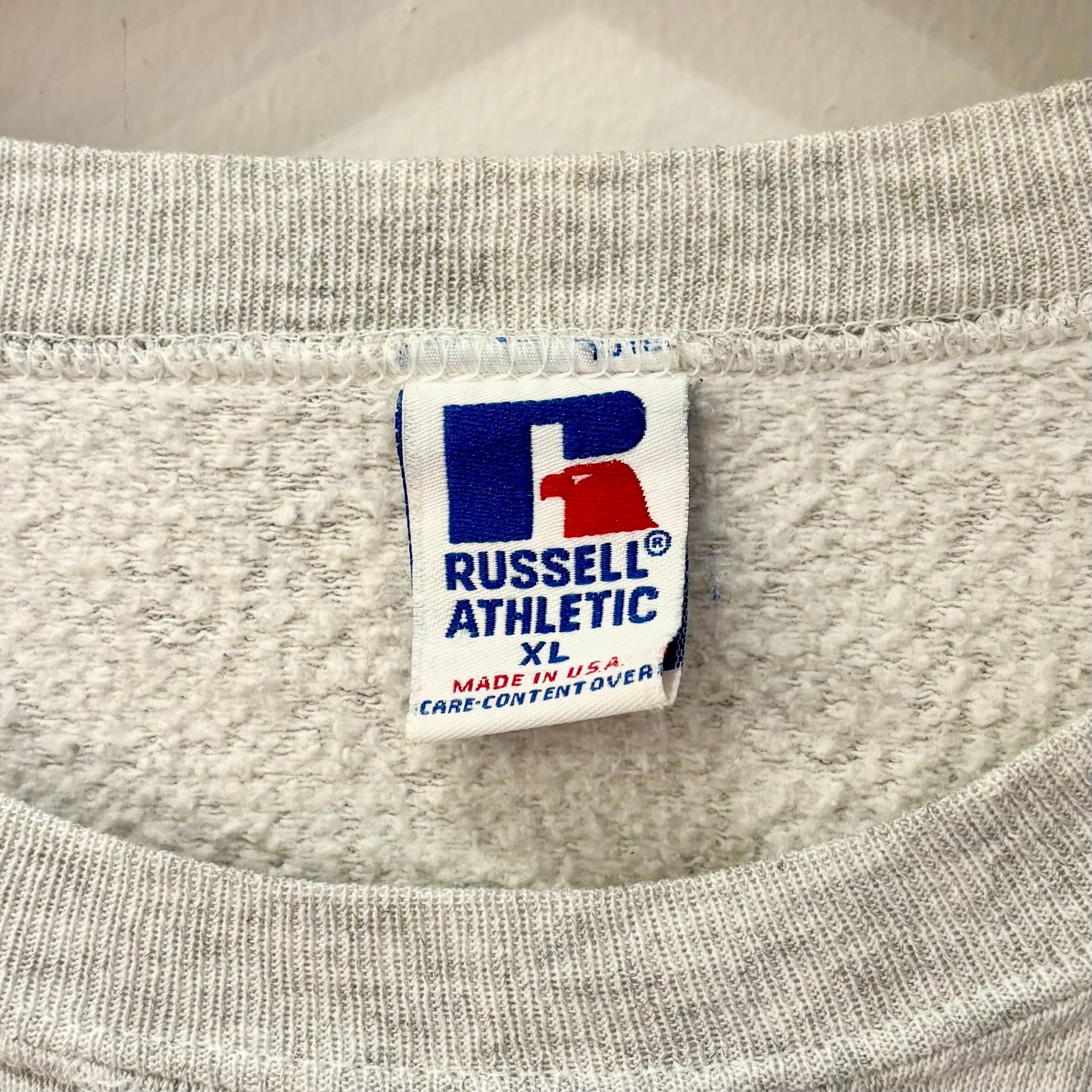 アッシュグレーの裏起毛素材、フロント中央にサークルでNORTH CAROLINA TARHEELSプリント、センターにUNCロゴマークワッペン、フロントリブにガゼット、左裾にRUSSELLネームが付いたデザインです。