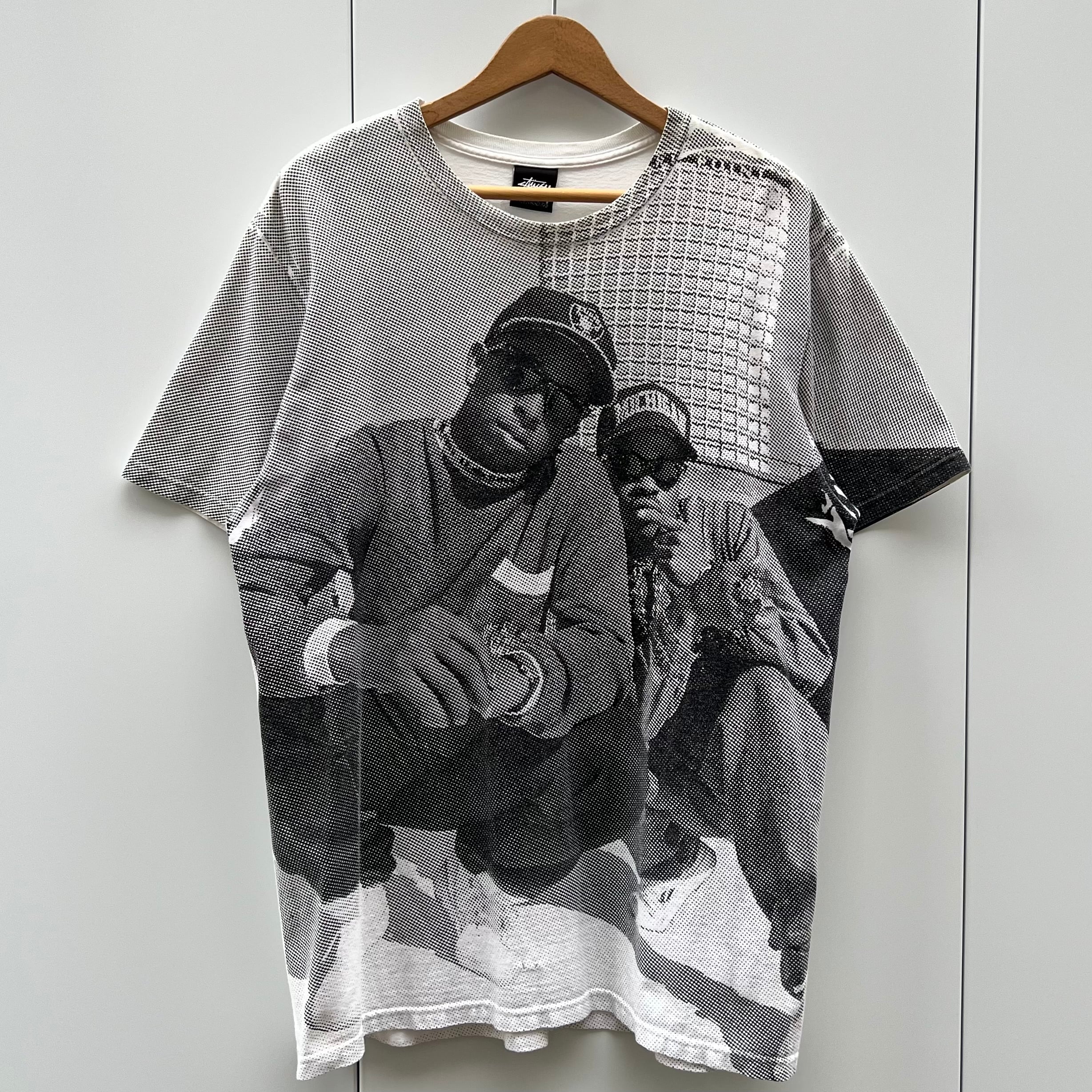 ホワイトのコットンボディ、フロントにメンバー2人の総柄フォトプリント、バックに大きくSTUSSYロゴとGANGSTARRロゴマークがプリントされた豪華デザインです。