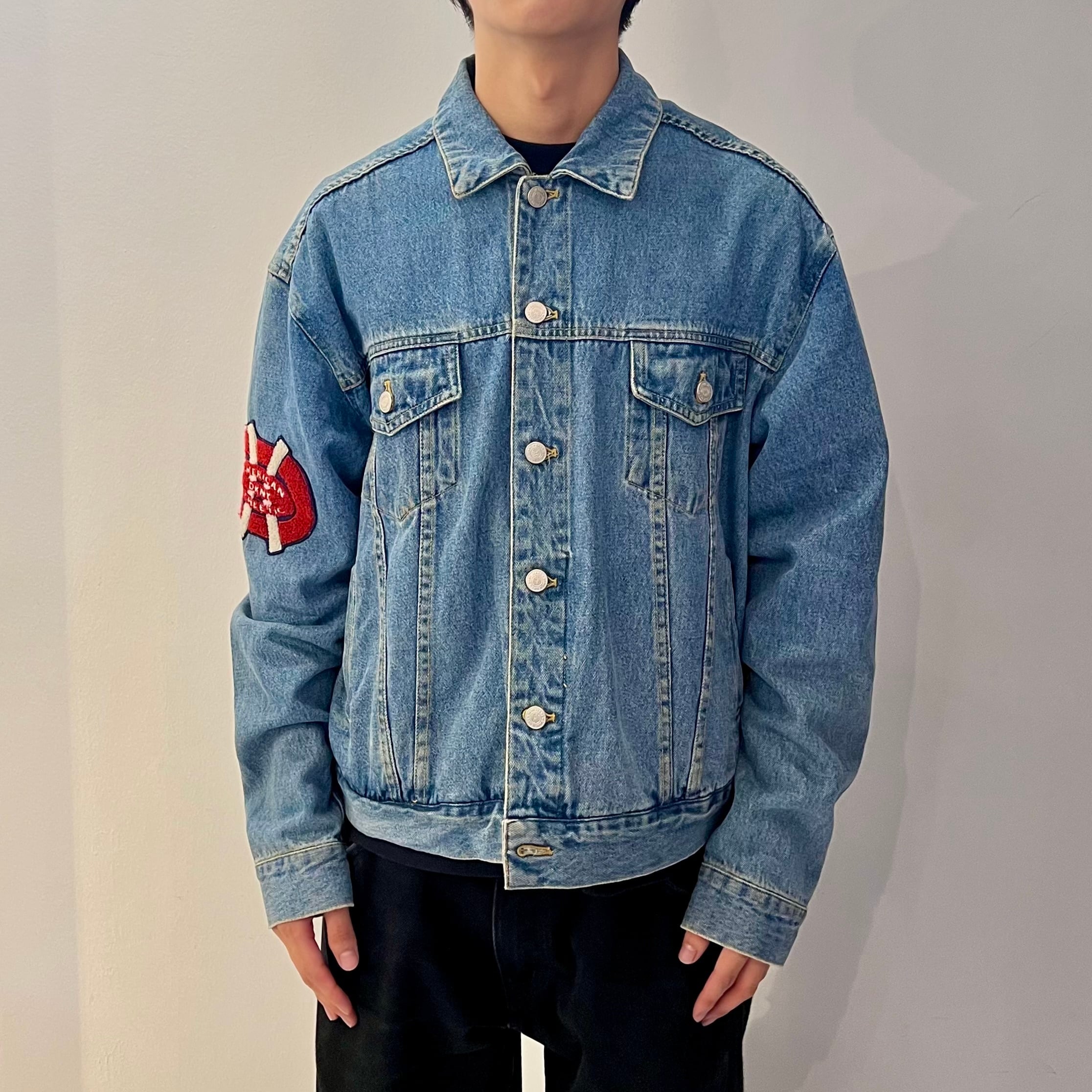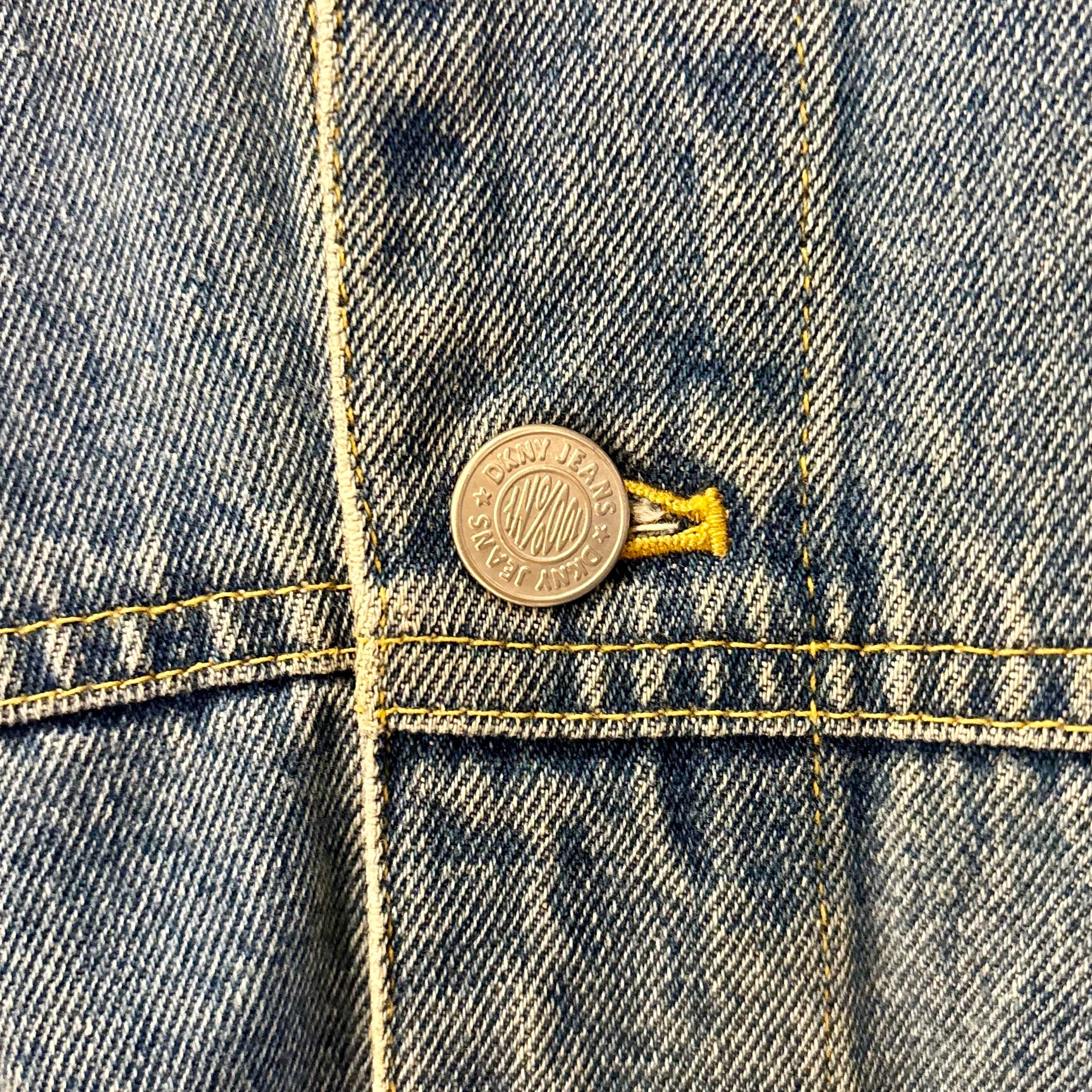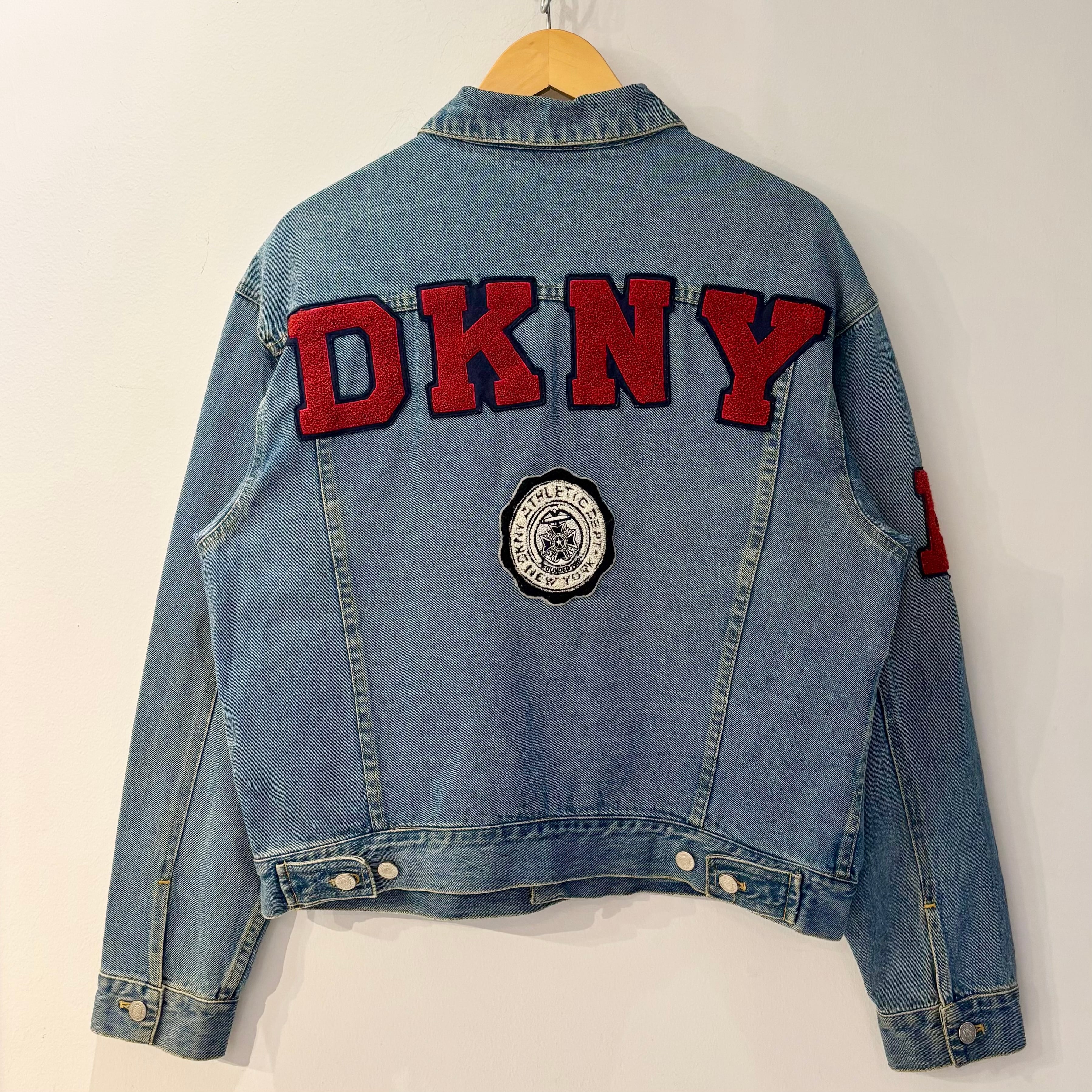ウォッシュドブルーデニム、バックに大きくDKNYとエンブレムのサガラワッペン、右袖にJEANSロゴマークのサガラワッペン、両胸、両サイドにポケット、ロゴ入りのメタルボタンを使用した豪華デザインです。