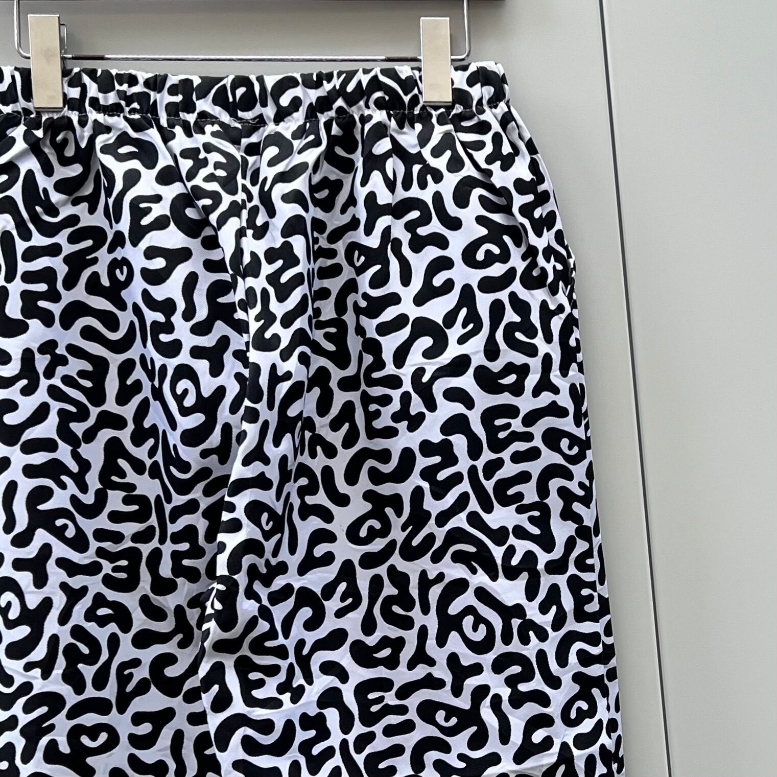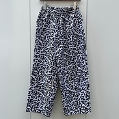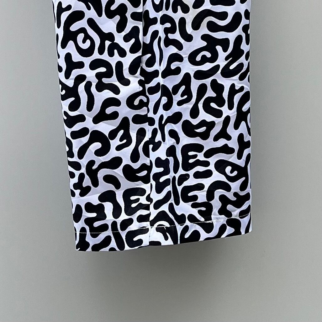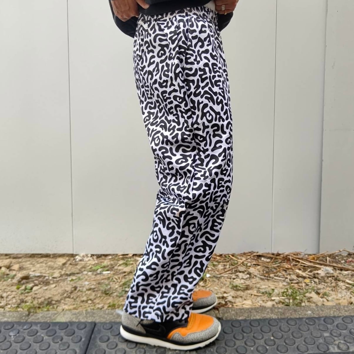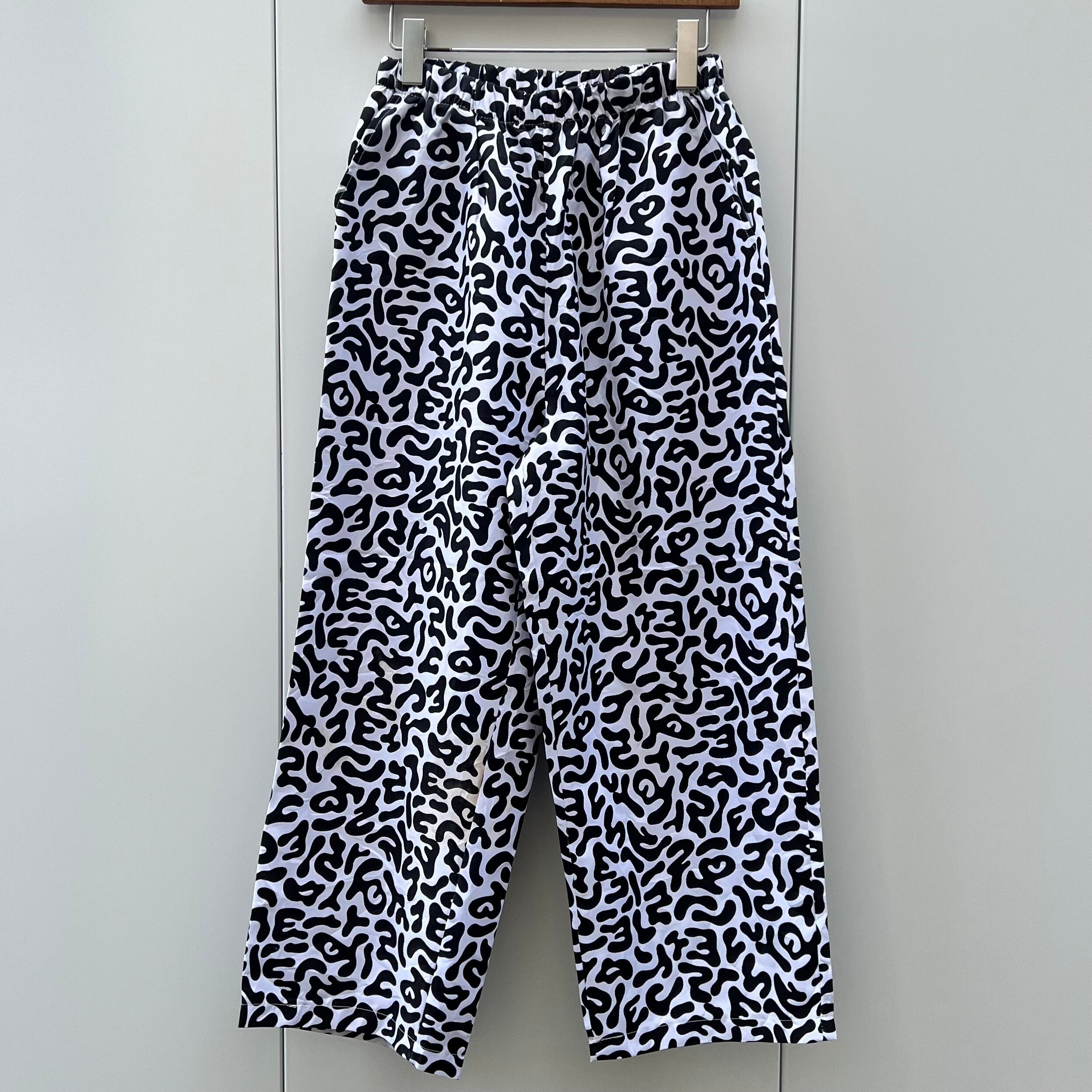 ホワイトxブラックのアメーバカモ柄、ハンドウォームポケット、ウエストをゴムで調節するイージー型デザインです。
