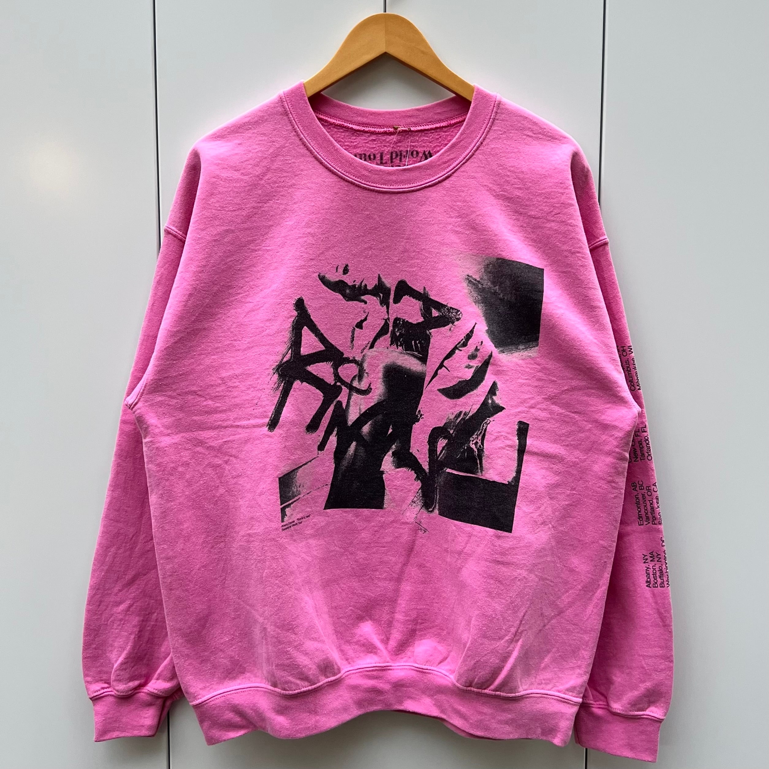 ピンクの裏起毛素材、フロントにアリアナのフォト入りグラフィックプリント、右袖にARIANA GRANDE SWEETENER WORLD TOURプリント、左袖に北米の都市プリント、バックにthank u, nextがプリントされたデザインです。