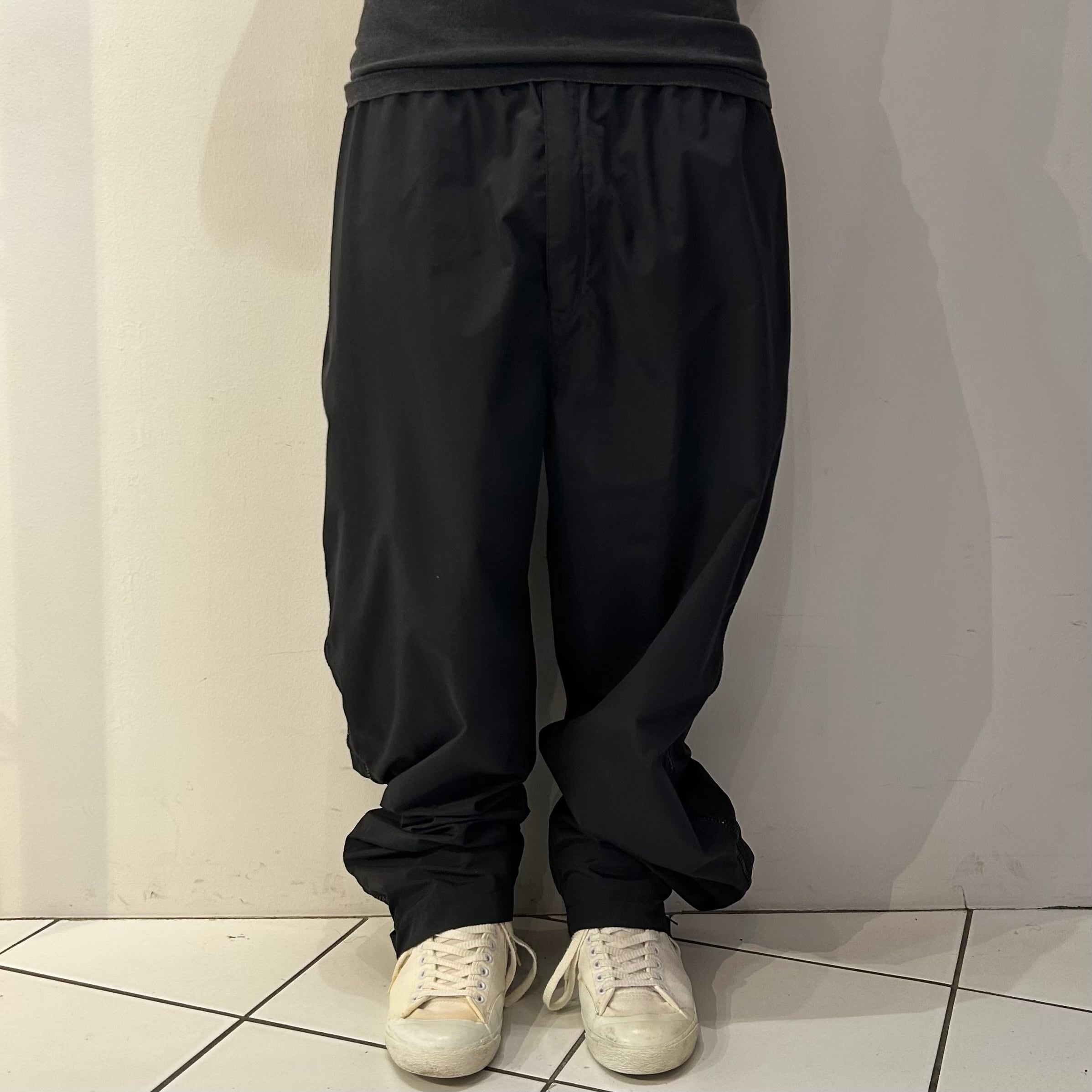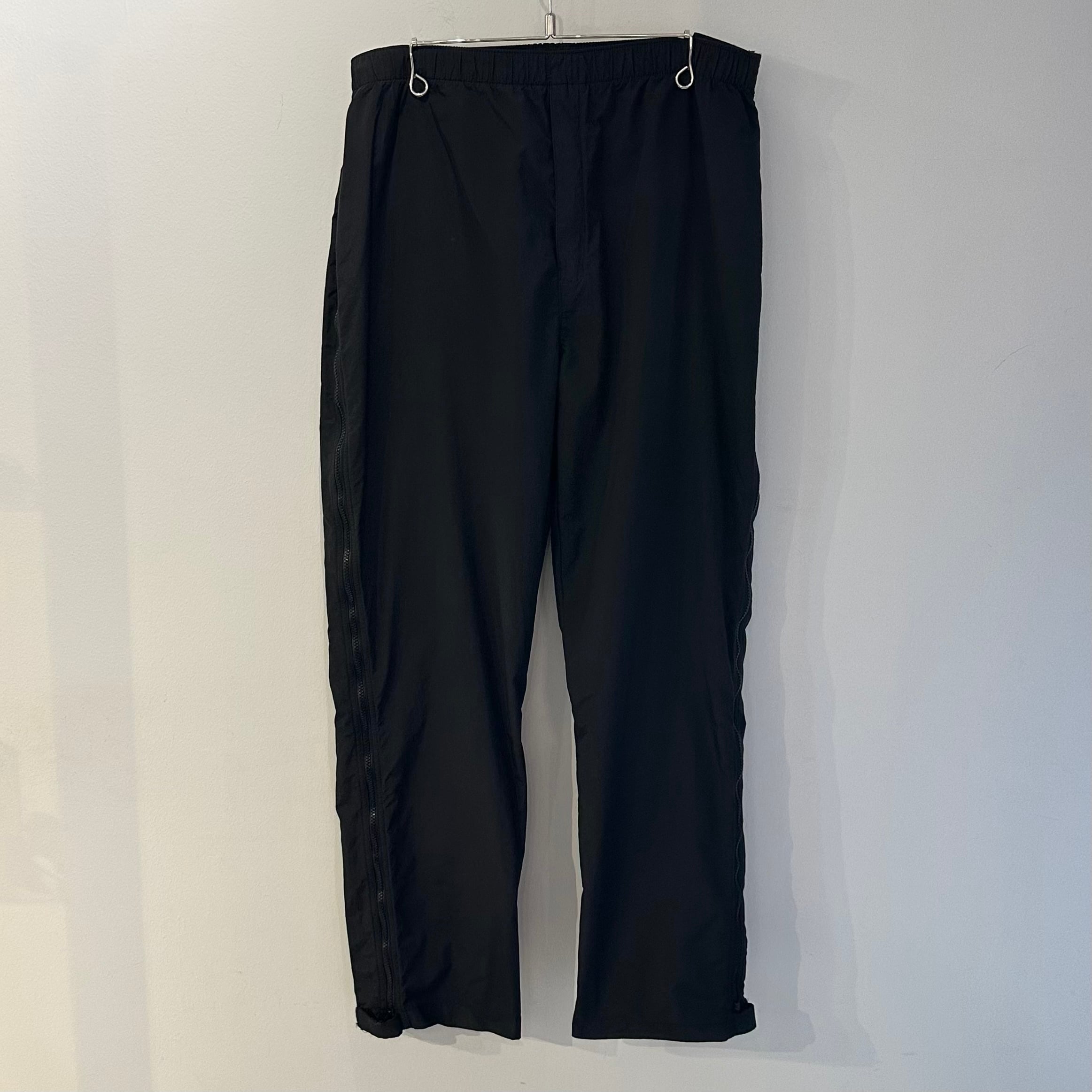 ブラックのナイロン素材、ウエスト右のベロクロアジャスターにネーム、ジッパー付き右バックポケット、ウエストゴムとベロクロアジャスターで調節、両サイドベロクロとジッパーで全て開閉、裾にベロクロアジャスターが付いたデザインです。