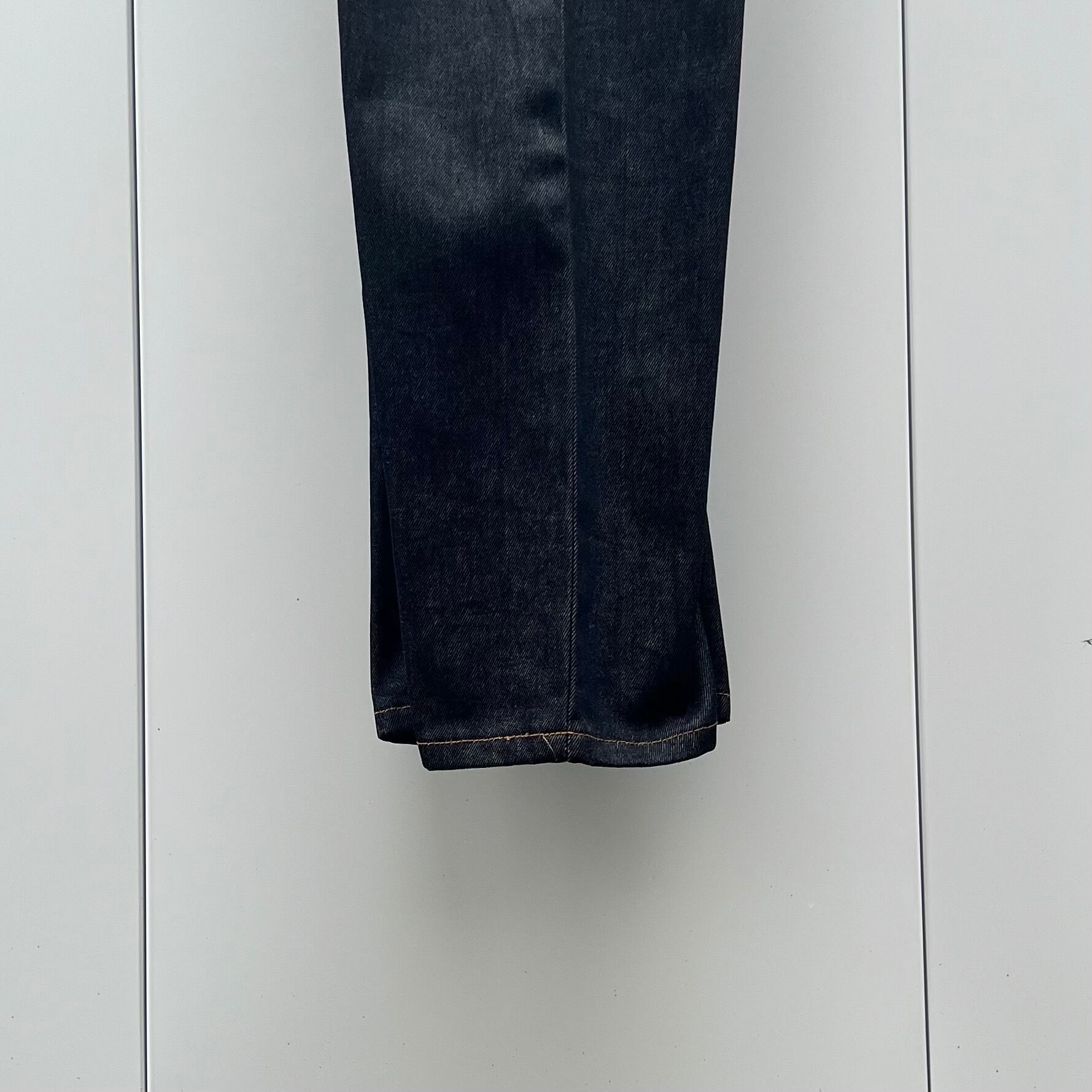 ロゥブルーデニム、コインポケットにロゴ刺繍、両バックポケットにステッチ、ロゴ入りボタン、リベット、紙パッチの付いたシンプルデザインです。