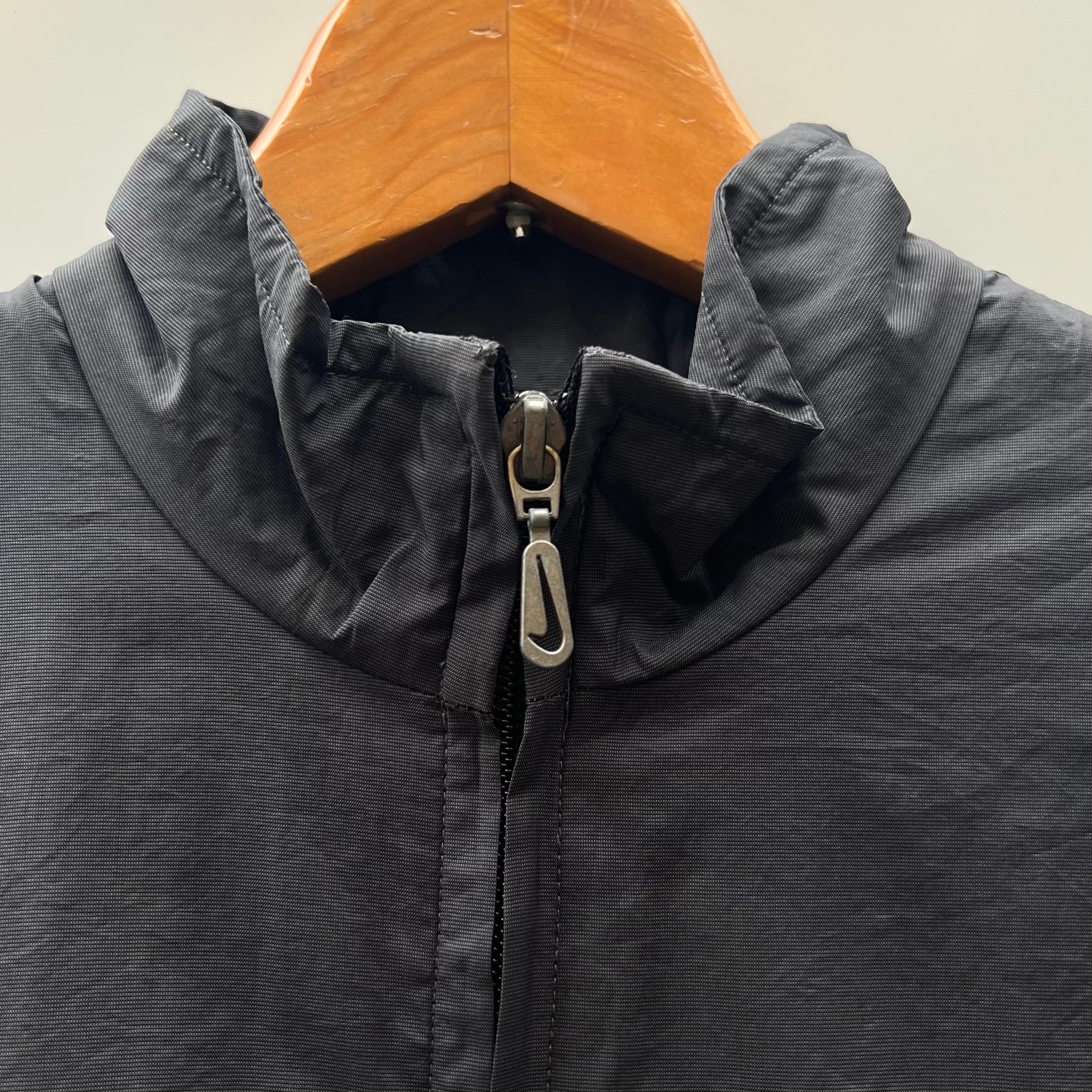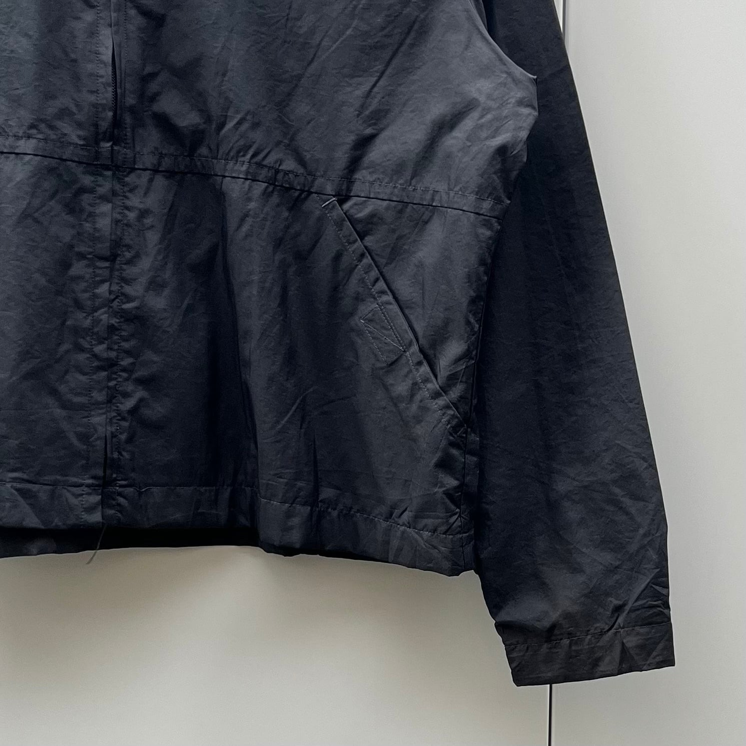 ブラックのナイロン混素材、左胸にスウォッシュ刺繍、スウォッシュプレートのジッパースライダー、ハンドウォームポケットの付いたシンプルデザインです。