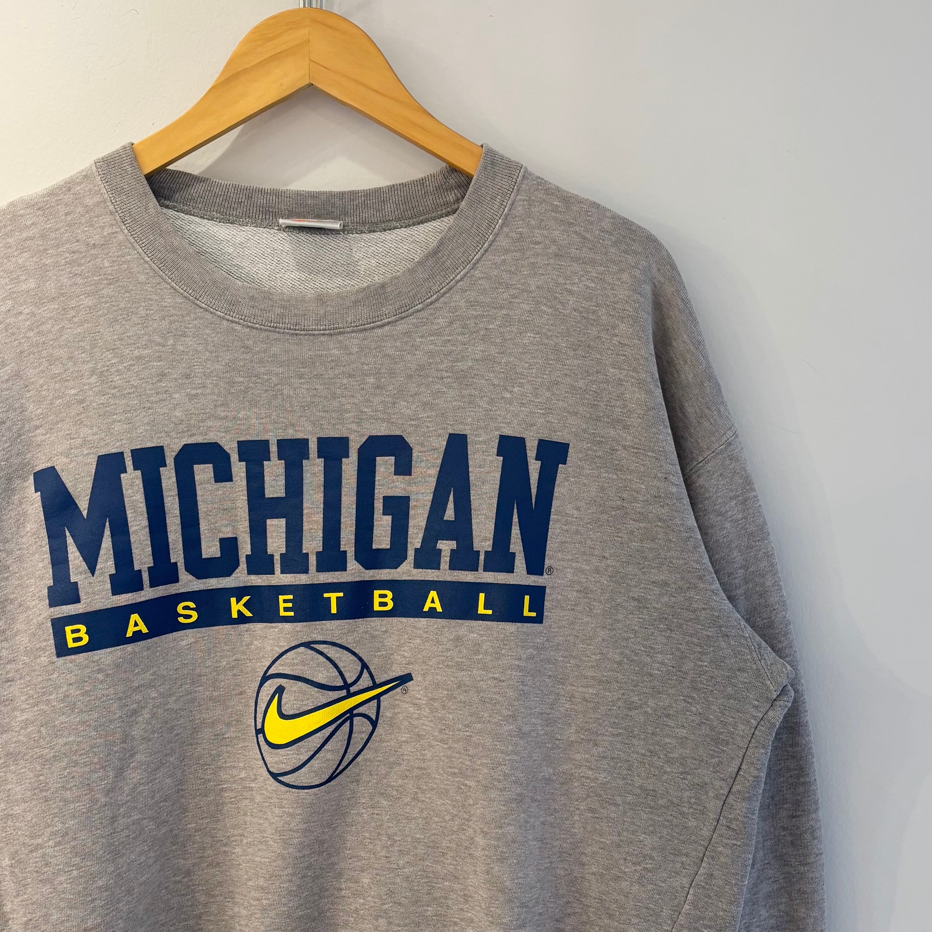 グレーの裏毛素材、フロントにMICHIGAN BASKETBALLとナイキバスケットボールロゴマークプリントが入るシンプルデザインです。