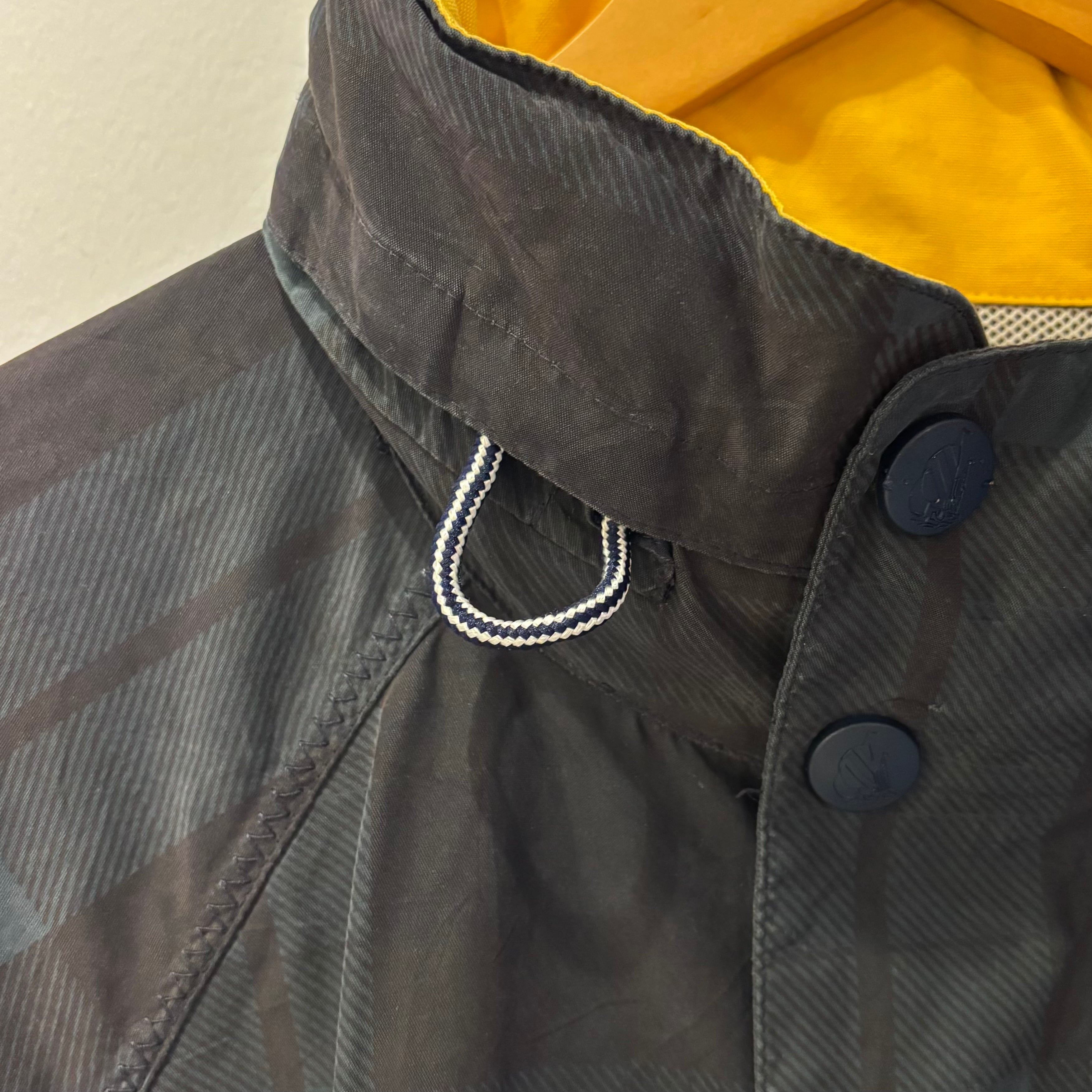 ダークグリーン/ブラックの大柄チェック、左袖にNUSのフラッグとNAUTICA刺繍、バック襟元にネーム、両サイドにポケット、ロゴ入りスナップボタン、襟にフード収納、裾にドローコードが入るデザインです。