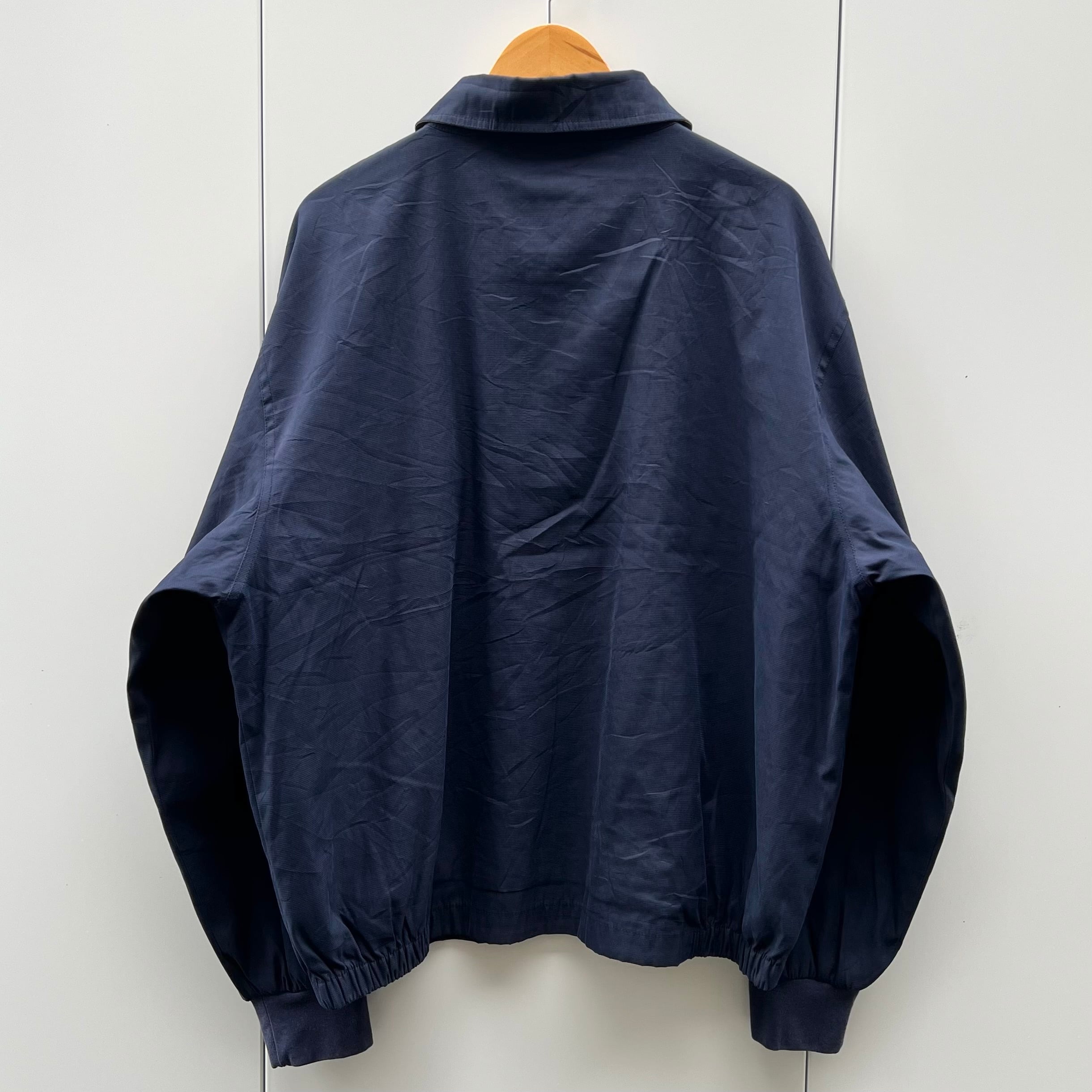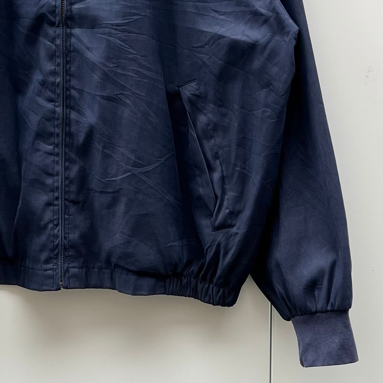 ネイビーのポリエステル混素材、左胸にロゴマーク刺繍、ロゴマーク入りジッパースライダーが付いたスウィングトップ型デザインです。