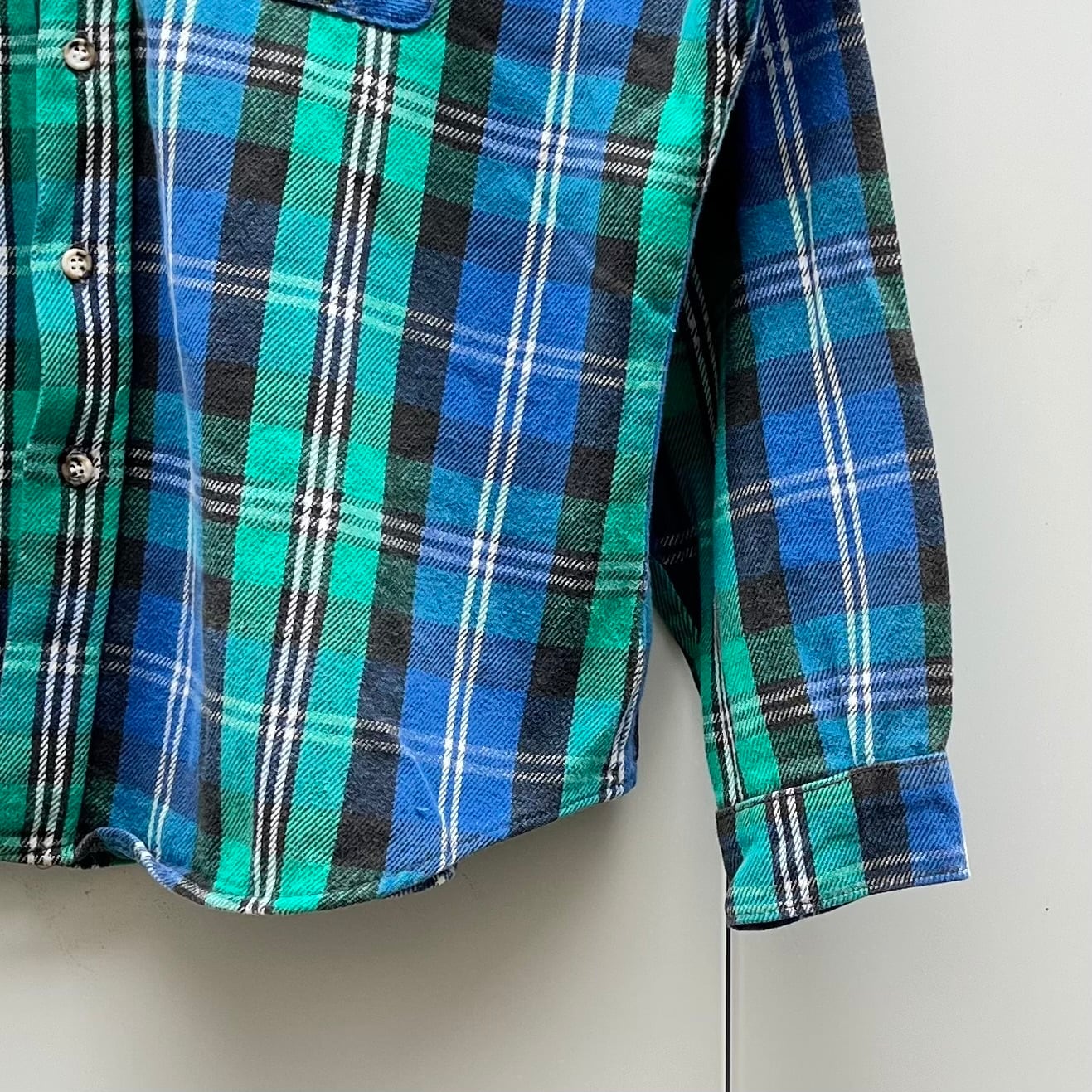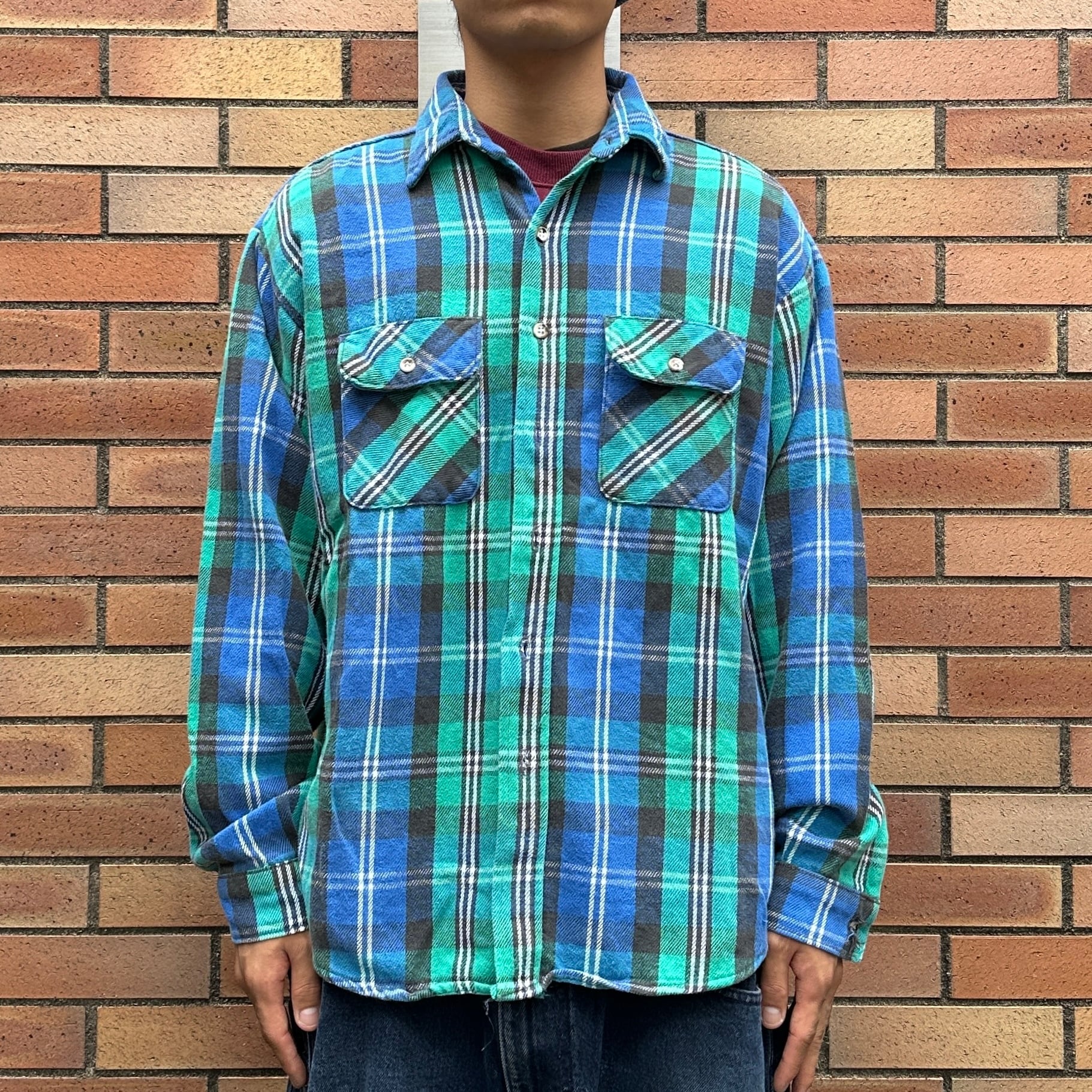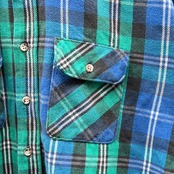 グリーンxブルーxブラック系の大柄チェックのヘビーネル生地、両胸にフラップ付きポケットの付いたワークシャツのスタンダードデザインです。