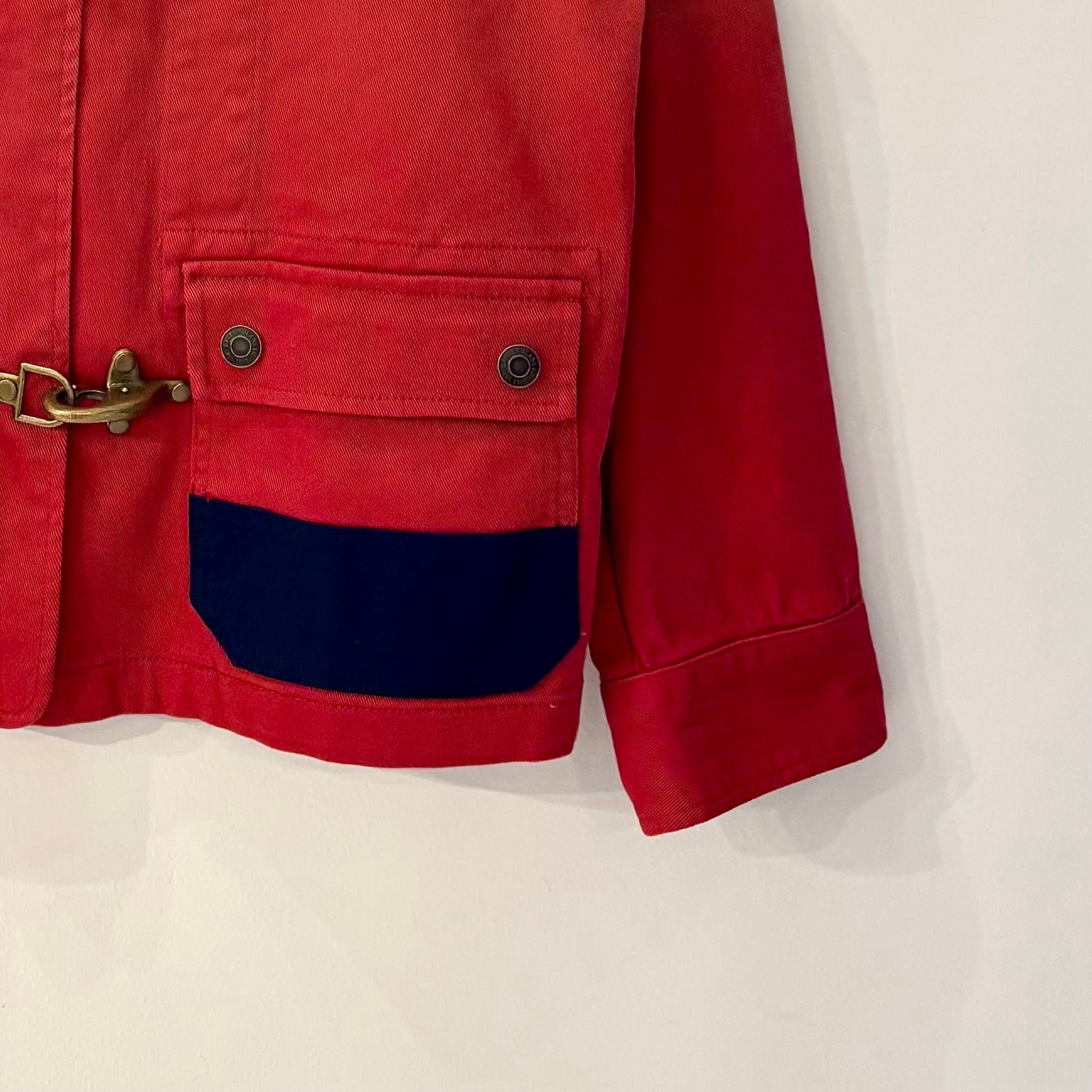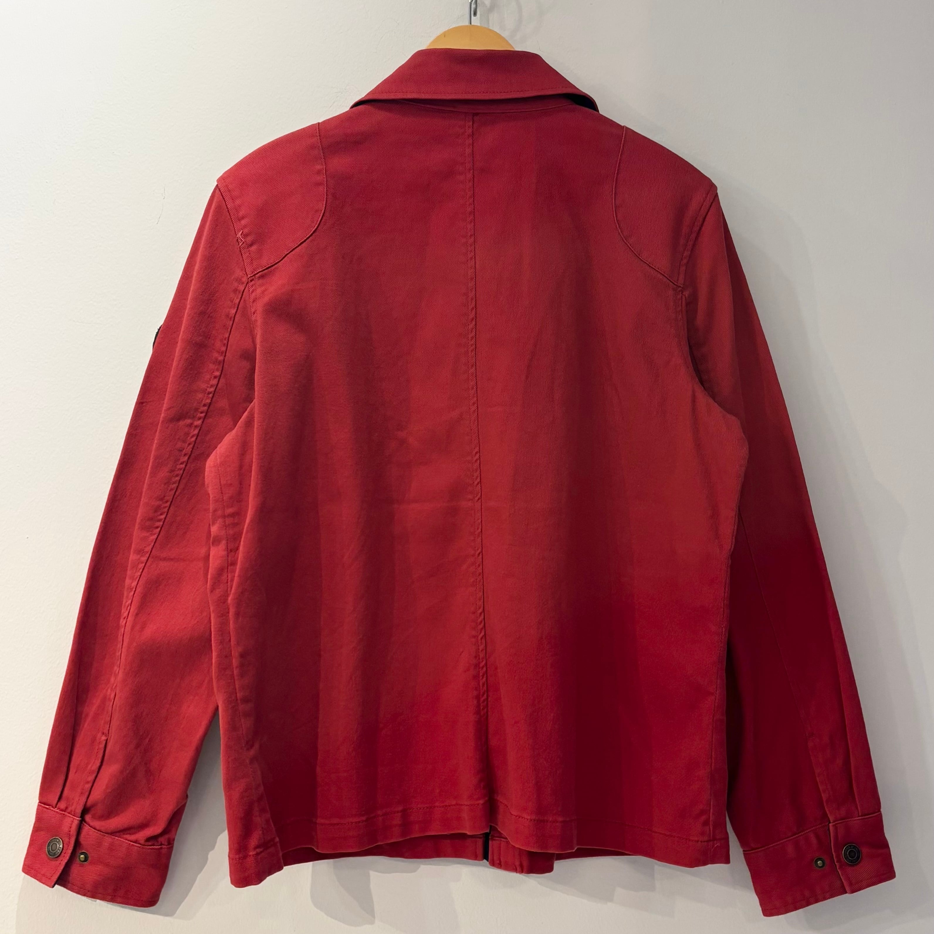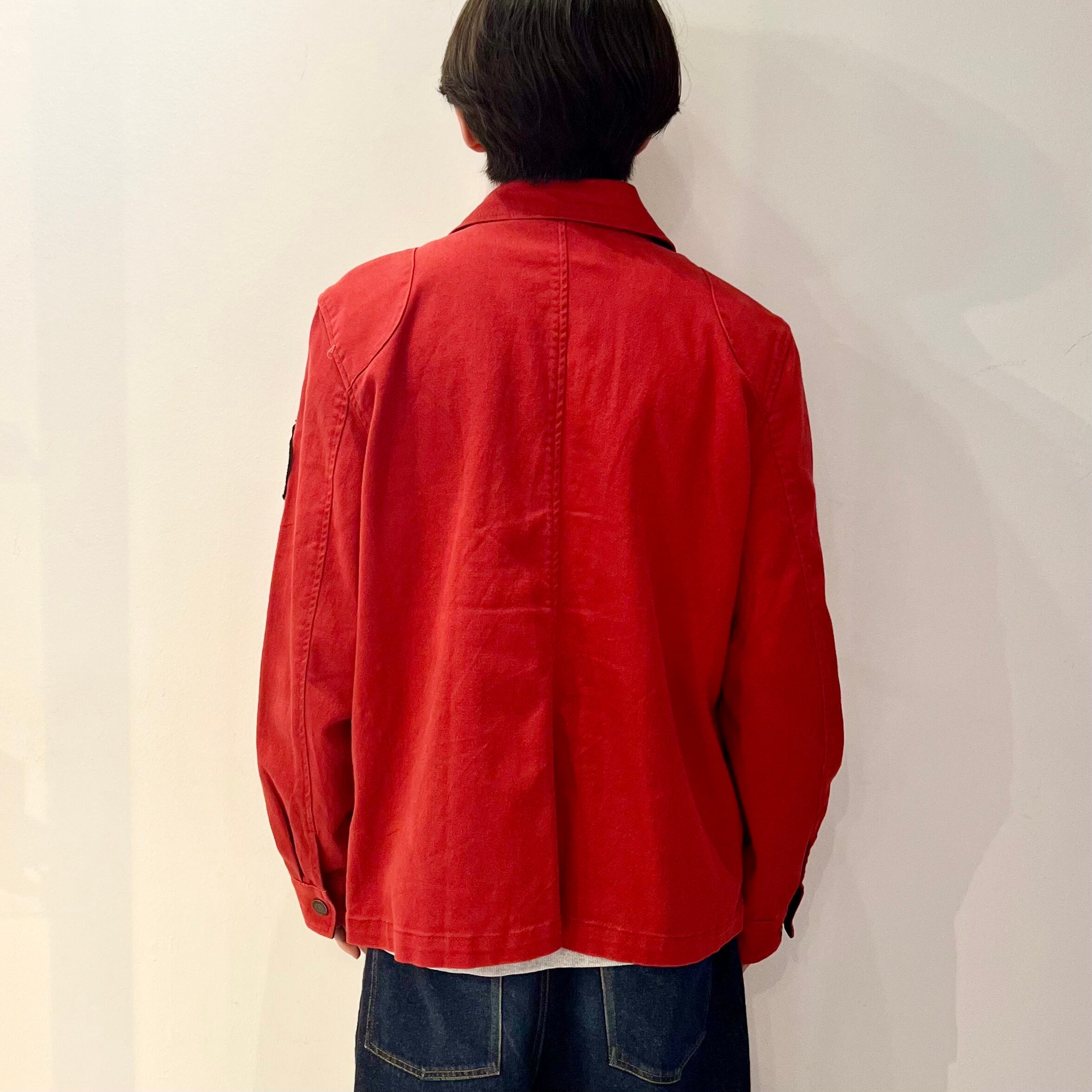 レッドxネイビーのコットン系素材、左腕にフェルトエンブレム、フラップ付きとハンドウォームポケットのダブルポケット、ジッパーとフックで開閉するデザインです。