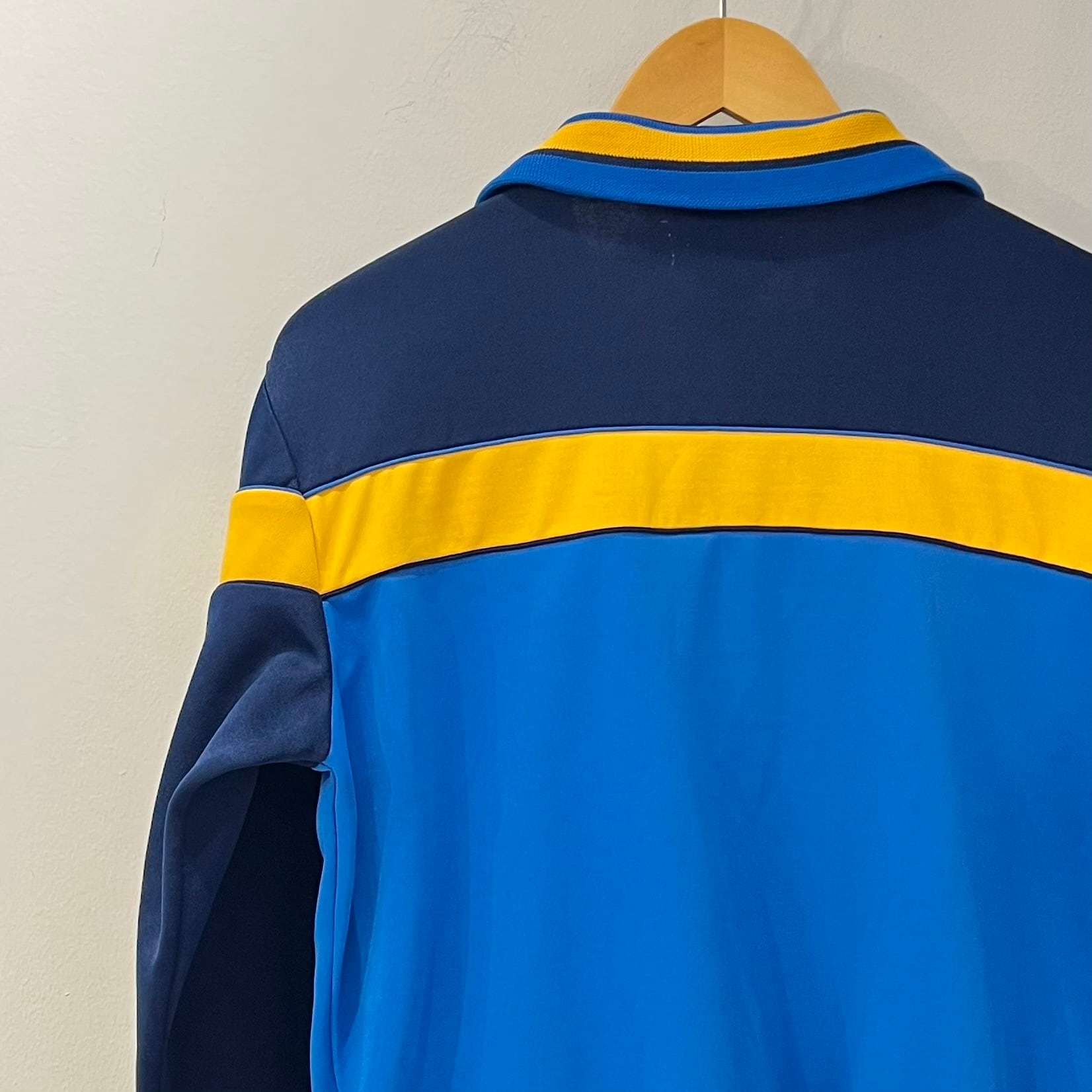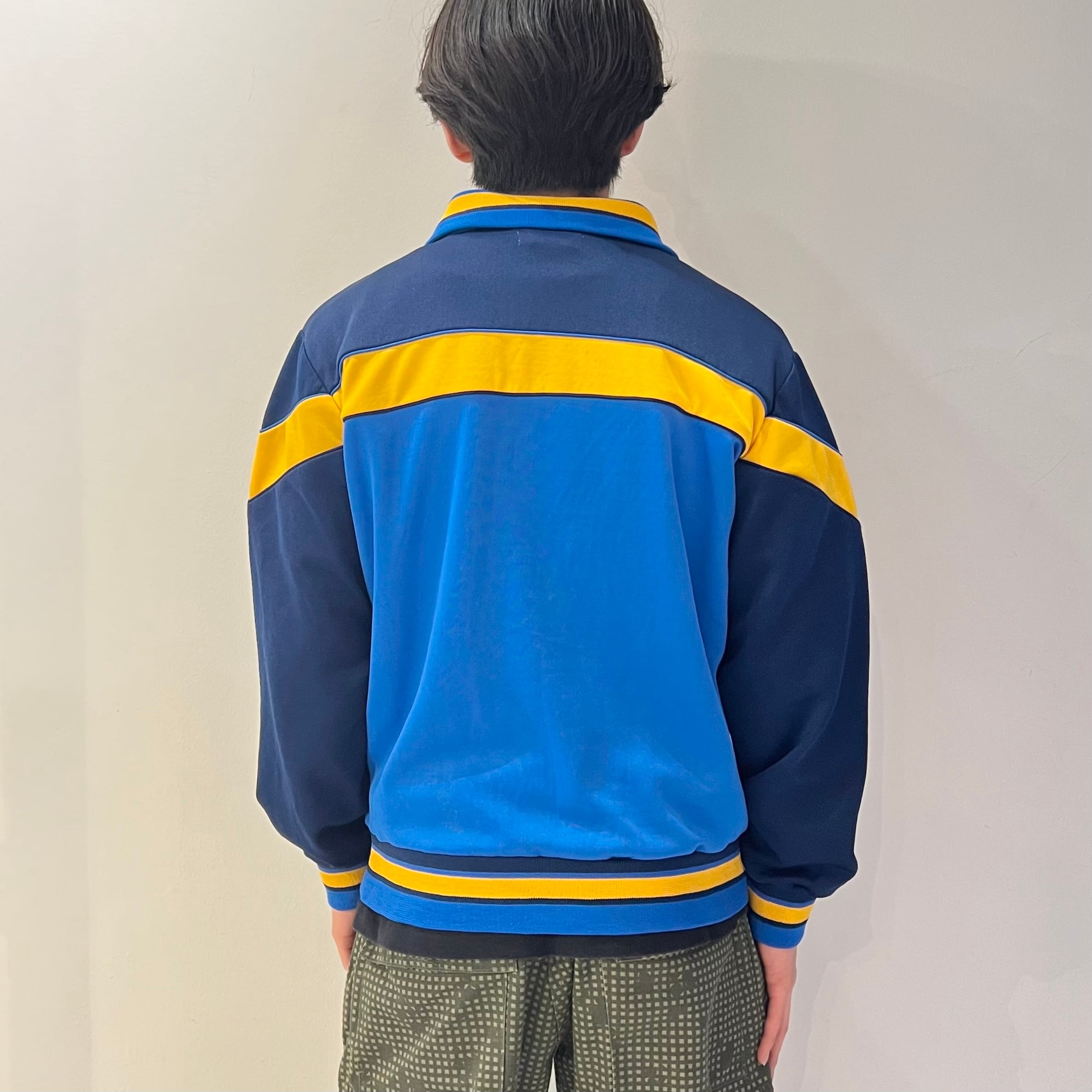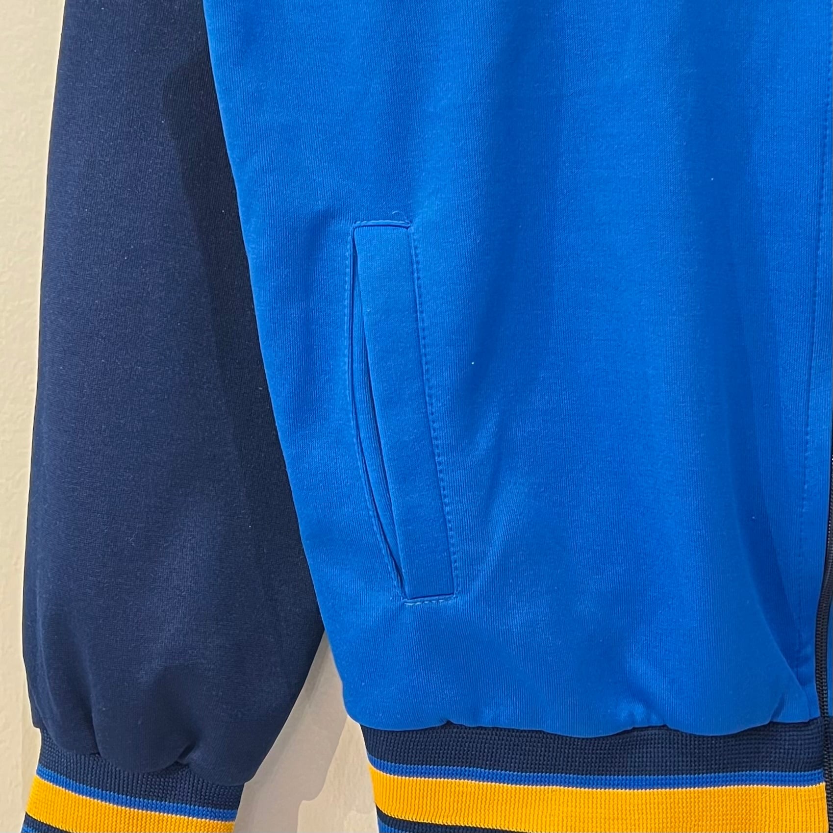 ブルーxネイビーxイエロージャージ素材、左胸にロゴ刺繍、ハンドウォームポケットの付いたスタンダードデザインです。