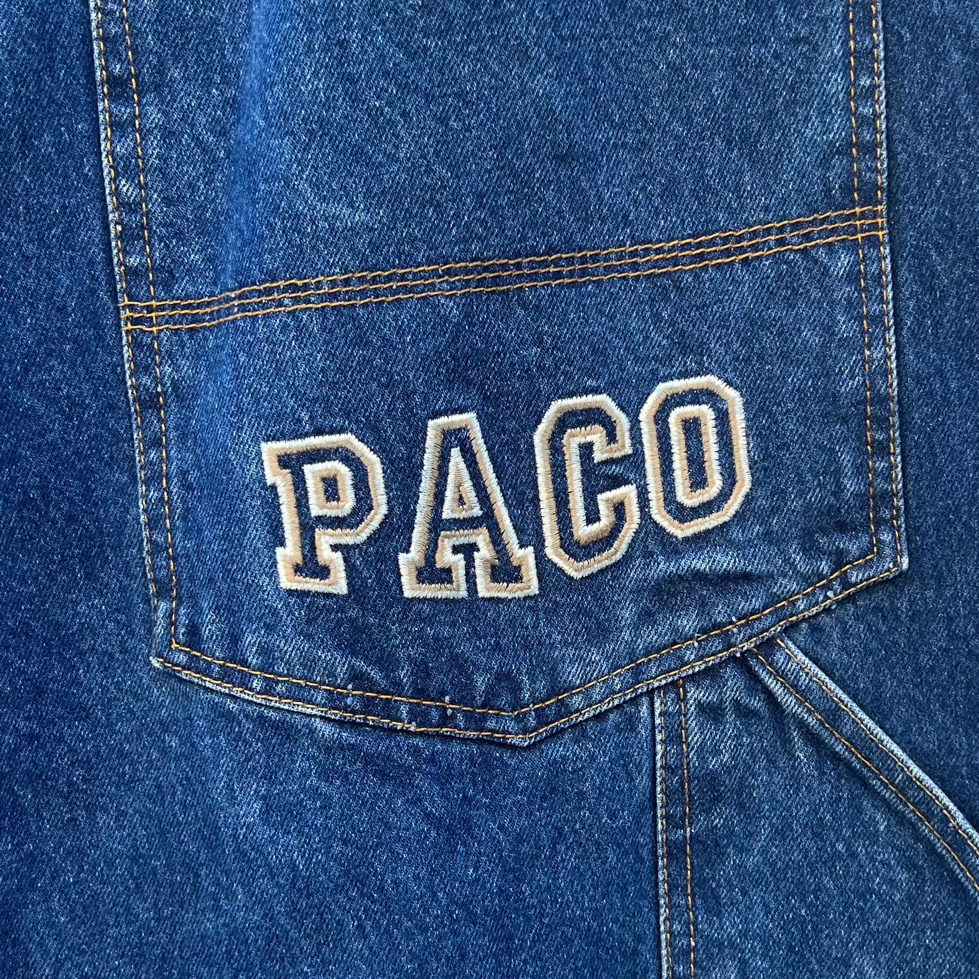ウォッシュドブルーデニム、右バックポケットにPACO刺繍、コインポケットにネーム、膝に来栖ステッチ、左バックポケットのメタルチャーム、ロゴ入りボタン、リベットの付いたデザインです。