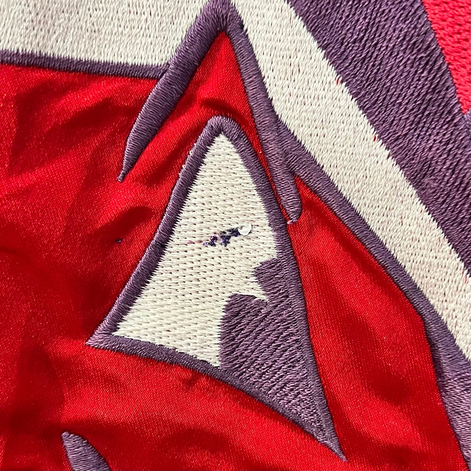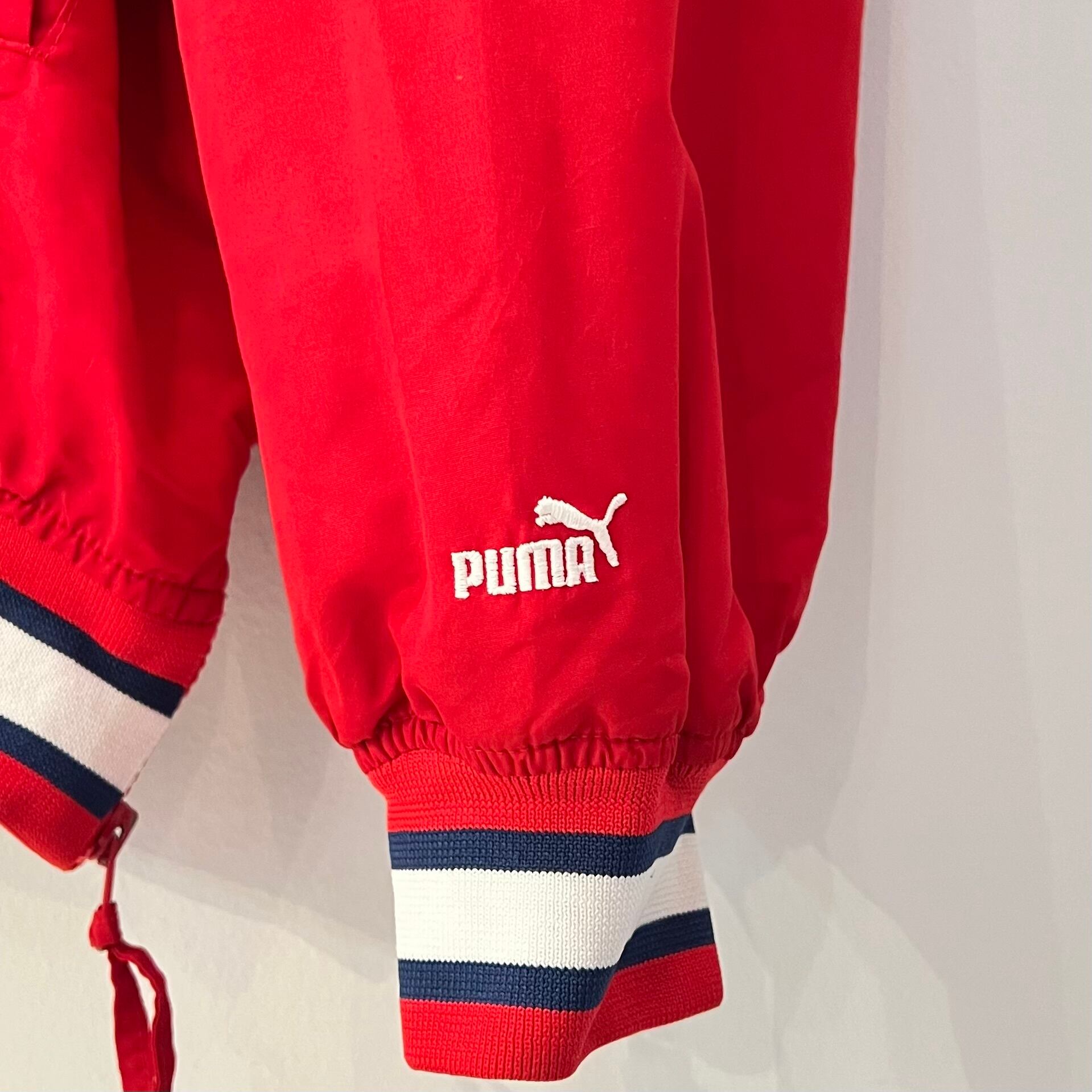 レッドのポリエステル素材xホワイト/ネイビーライン、フロントに大きくワフー酋長刺繍、左袖にJACOBS FIELD HONE OF THE Indians刺繍、先にpuma ロゴマーク刺繍、ハンドウォームポケット、裾の左サイドにジッパーで開閉するデザインです。