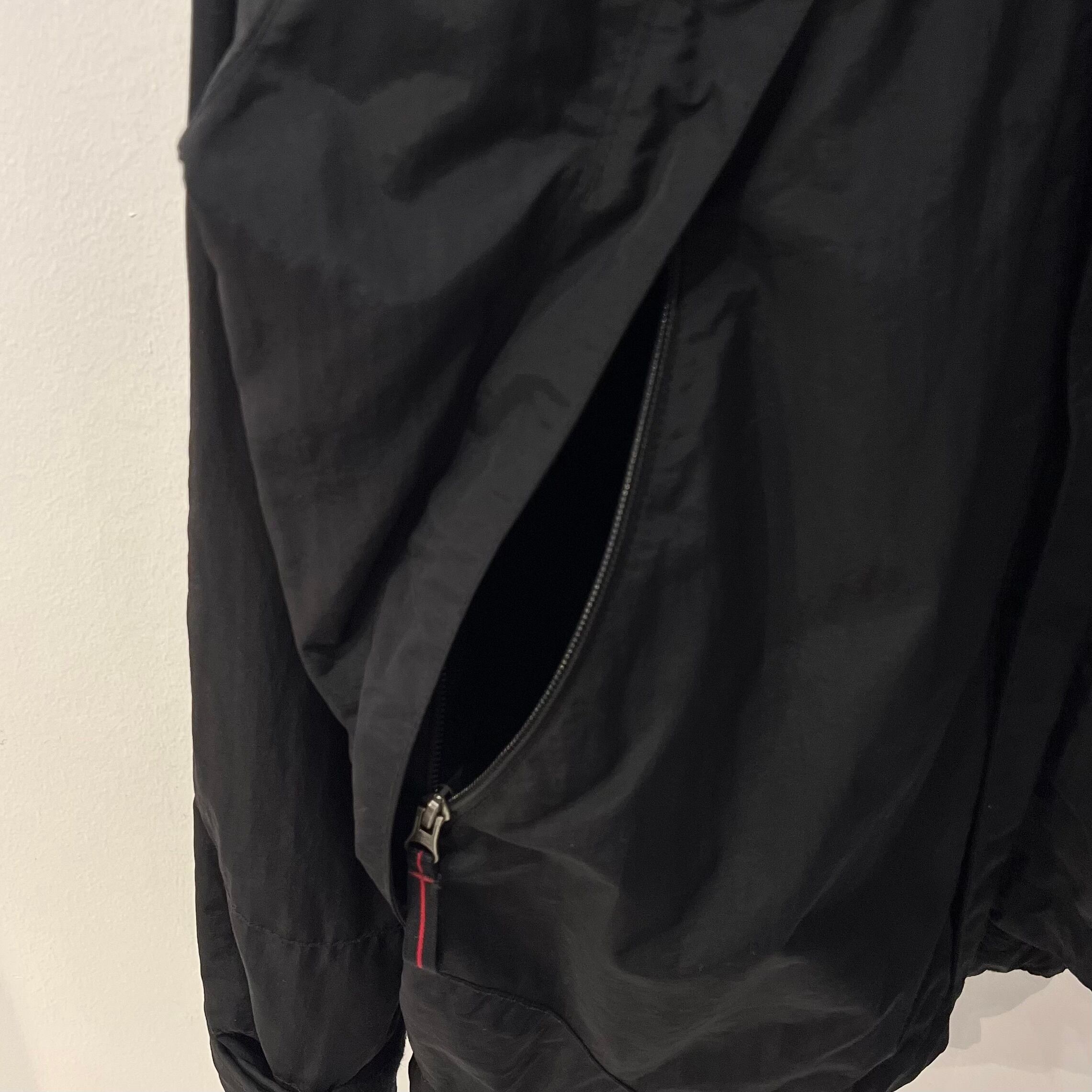 ブラックのナイロン素材、左のポケットにロゴ刺繍、左袖のカフスにネーム刺繍入りテープ、ロゴ入りラバーのドローコードアジャスター、ジッパー付きハンドウォームポケット、フードにドローコードが入るデザインです。