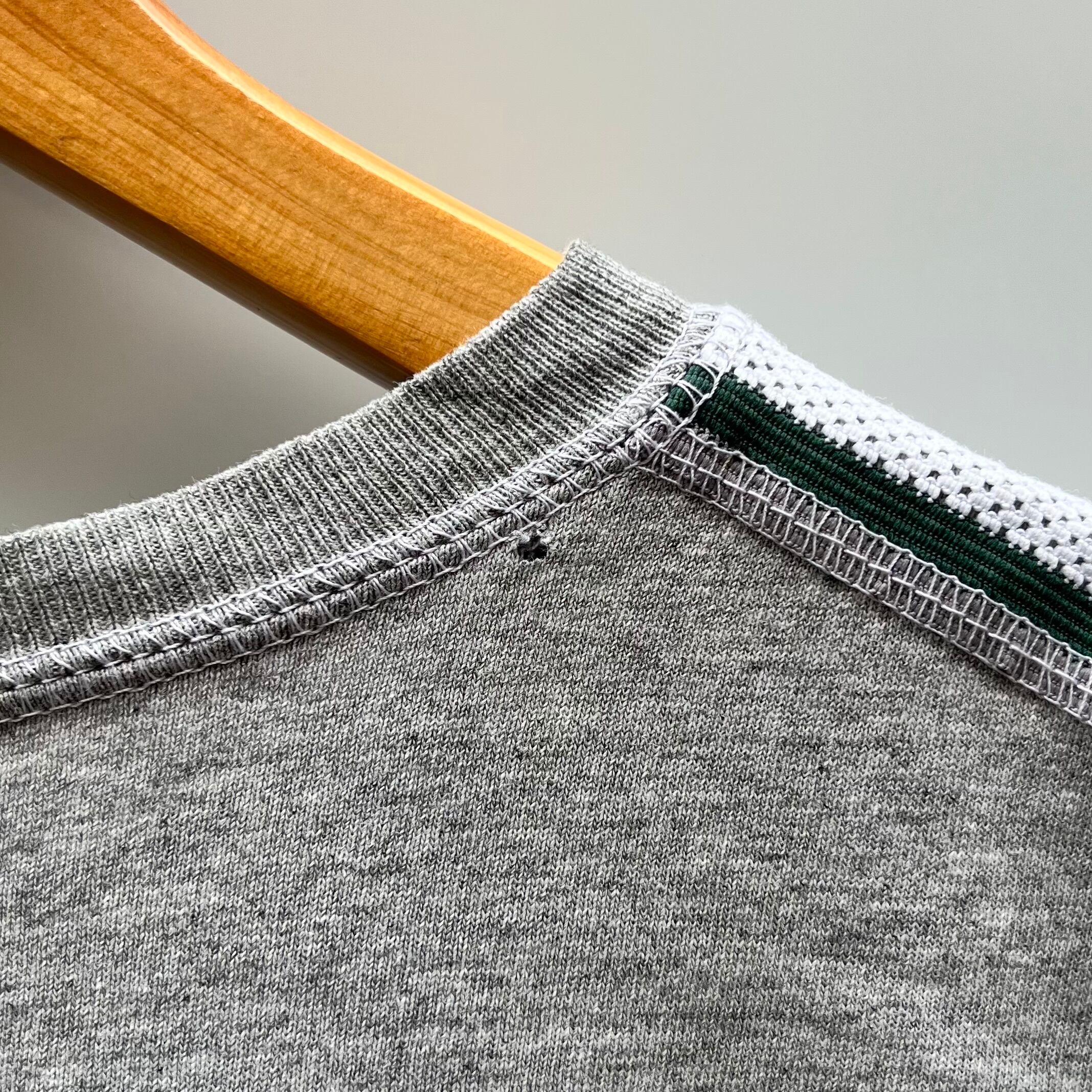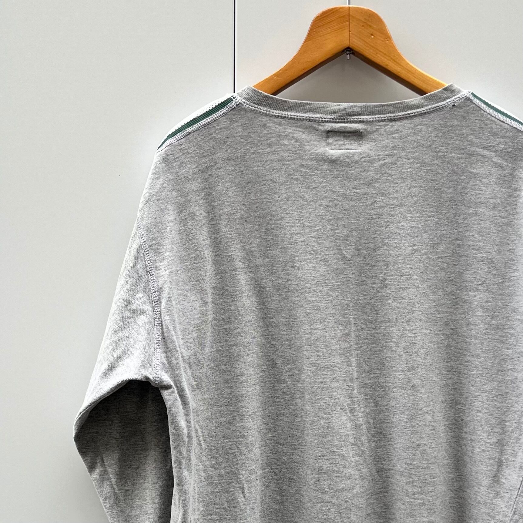 グレーのコットンボディxグリーン/ホワイトメッシュライン、左裾にロゴ刺繍が入るデザインです。