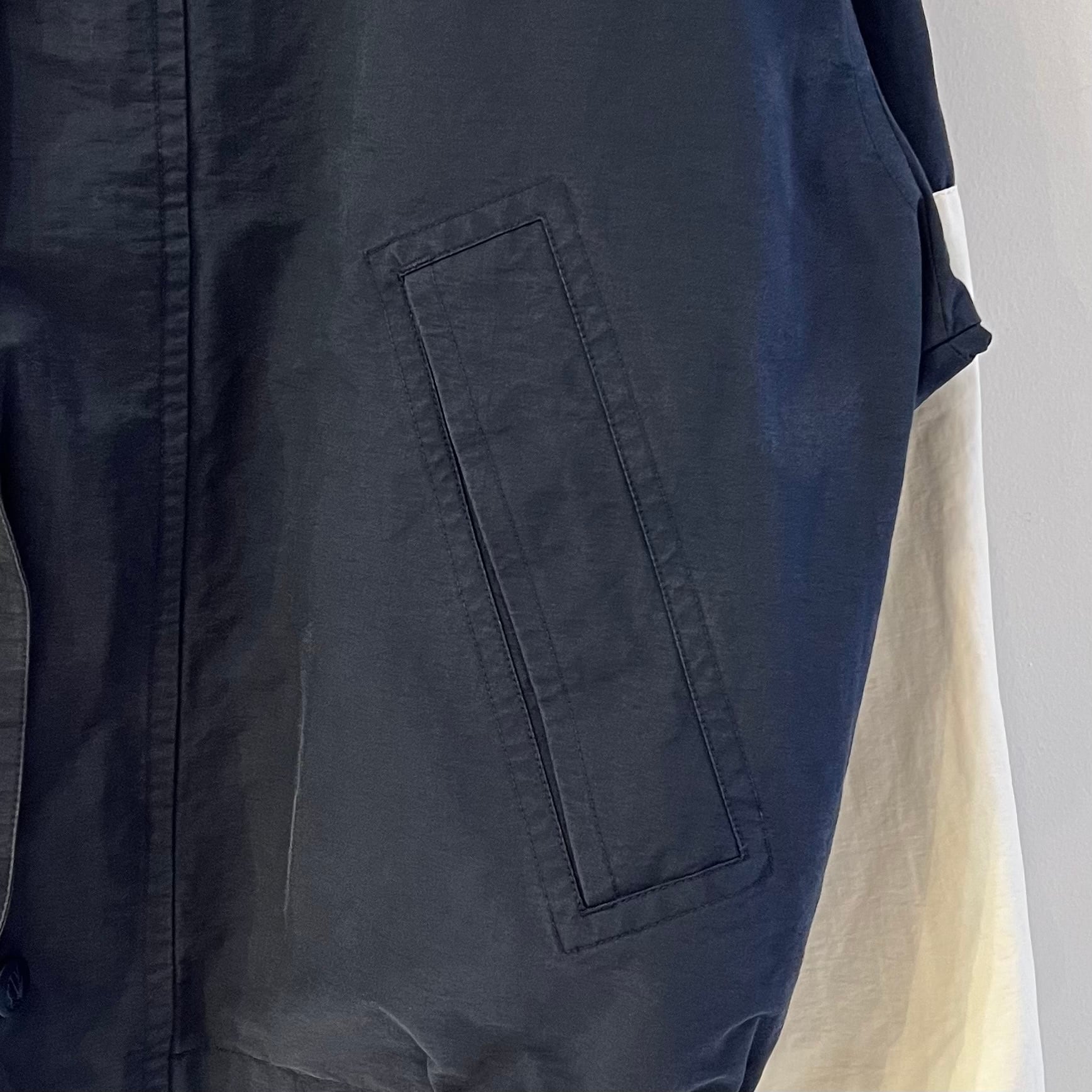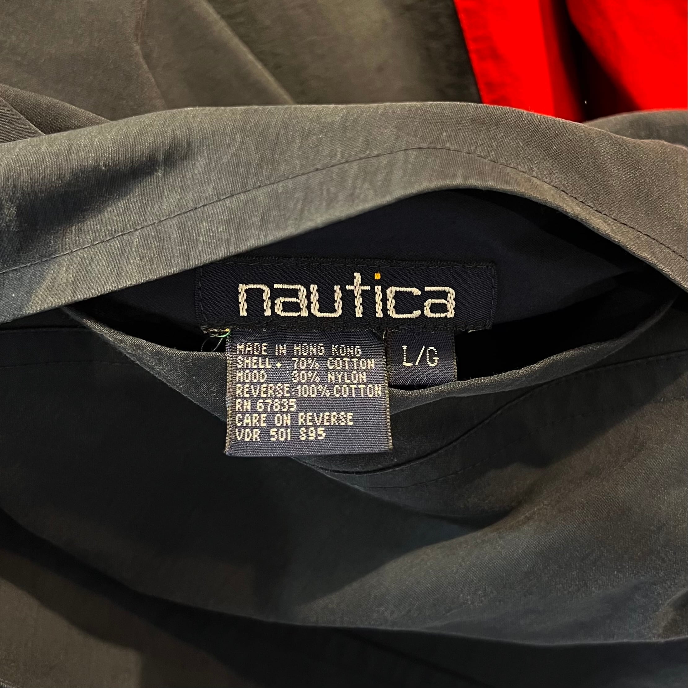 ネイビーxレッドxホワイト/グリーンのリバーシブル、ネイビー面の左袖にXCVのフラッグとNAUTICA刺繍、グリーン面の左胸にロゴマーク刺繍、バック襟元にネーム、両サイドにポケット、ロゴ入りスナップボタン、襟にフードが収納するデザインです。