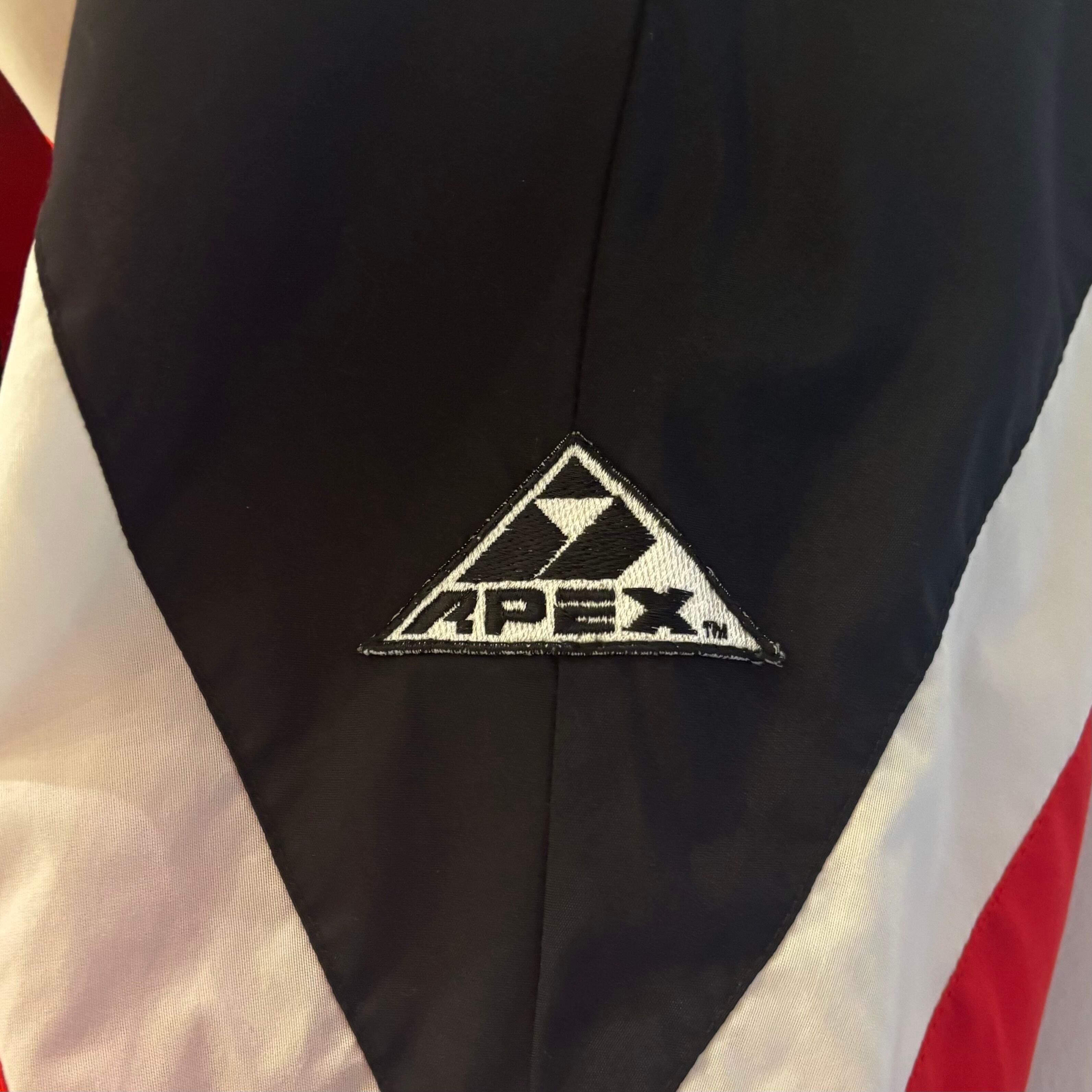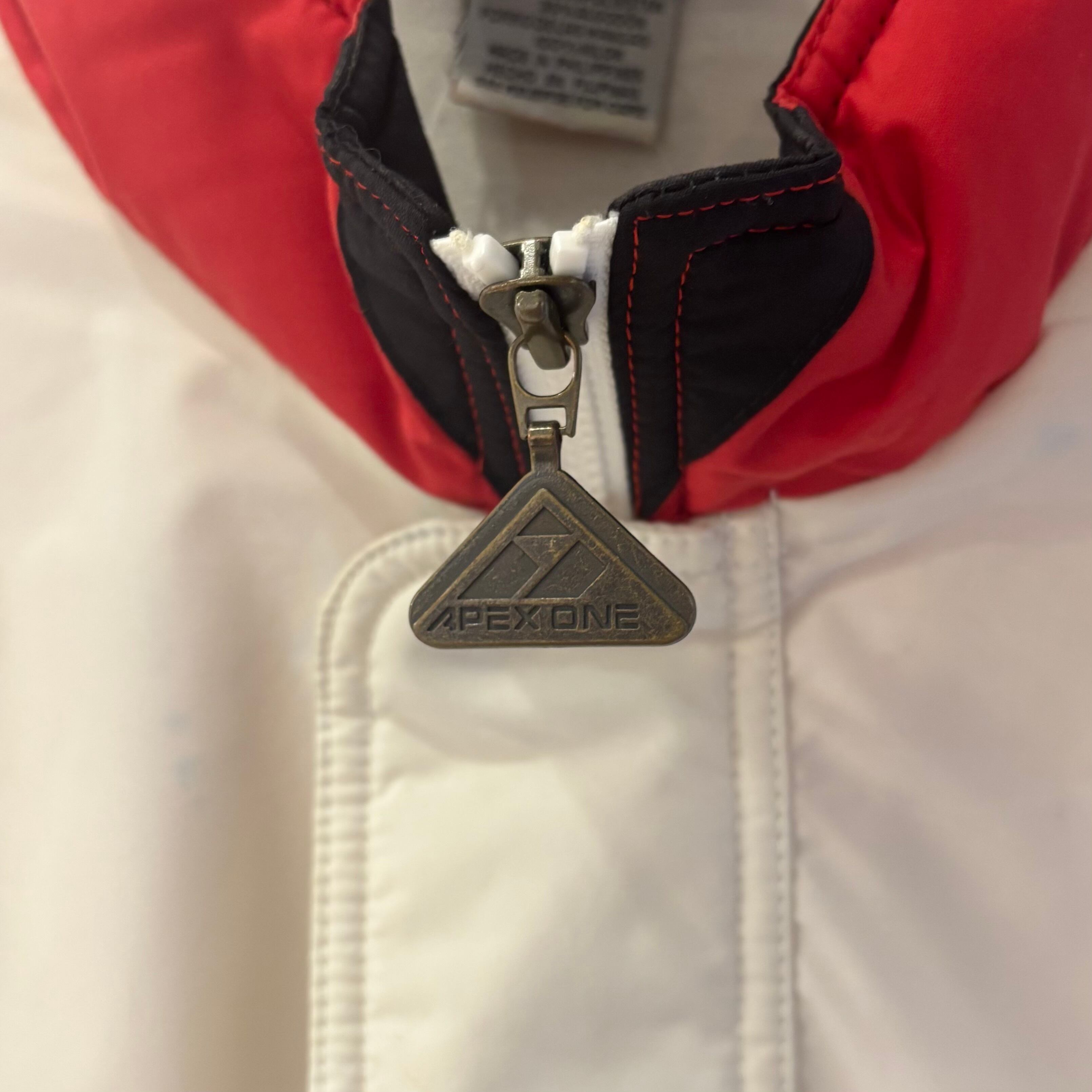 ホワイトxレッドxブラックのナイロン素材、両肩に大きくロゴマーク刺繍、ハンドウォームポケット、APEX ONEロゴマークのメタルジッパースライダーを使用したデザインです。