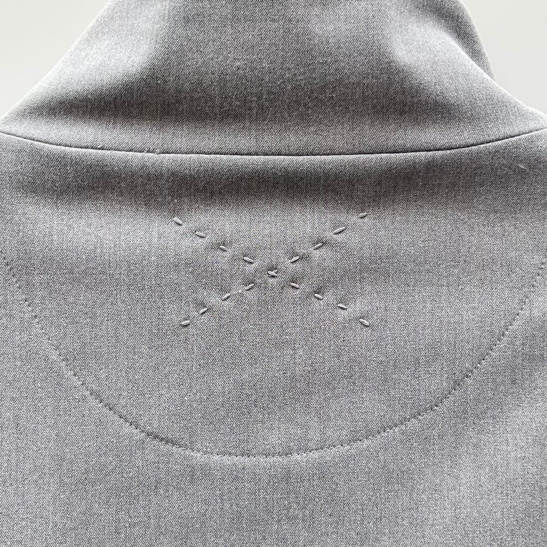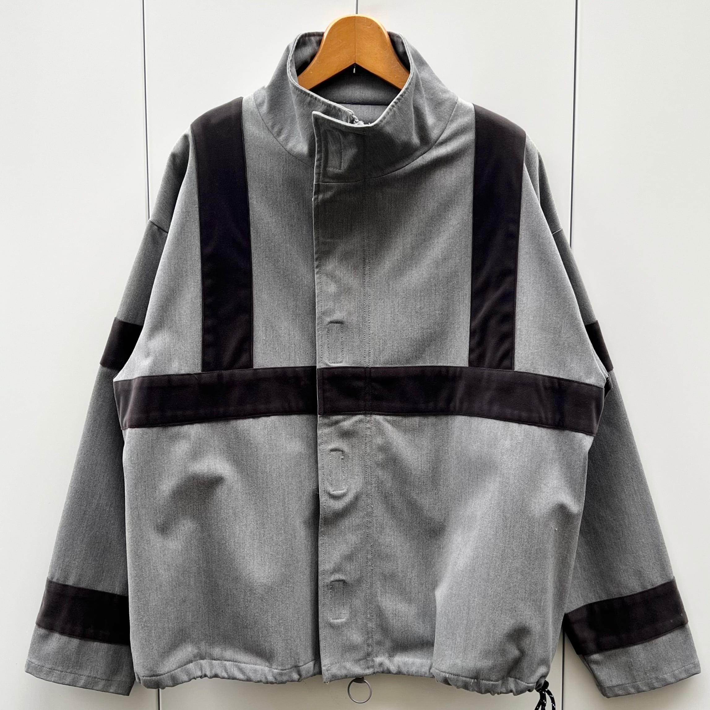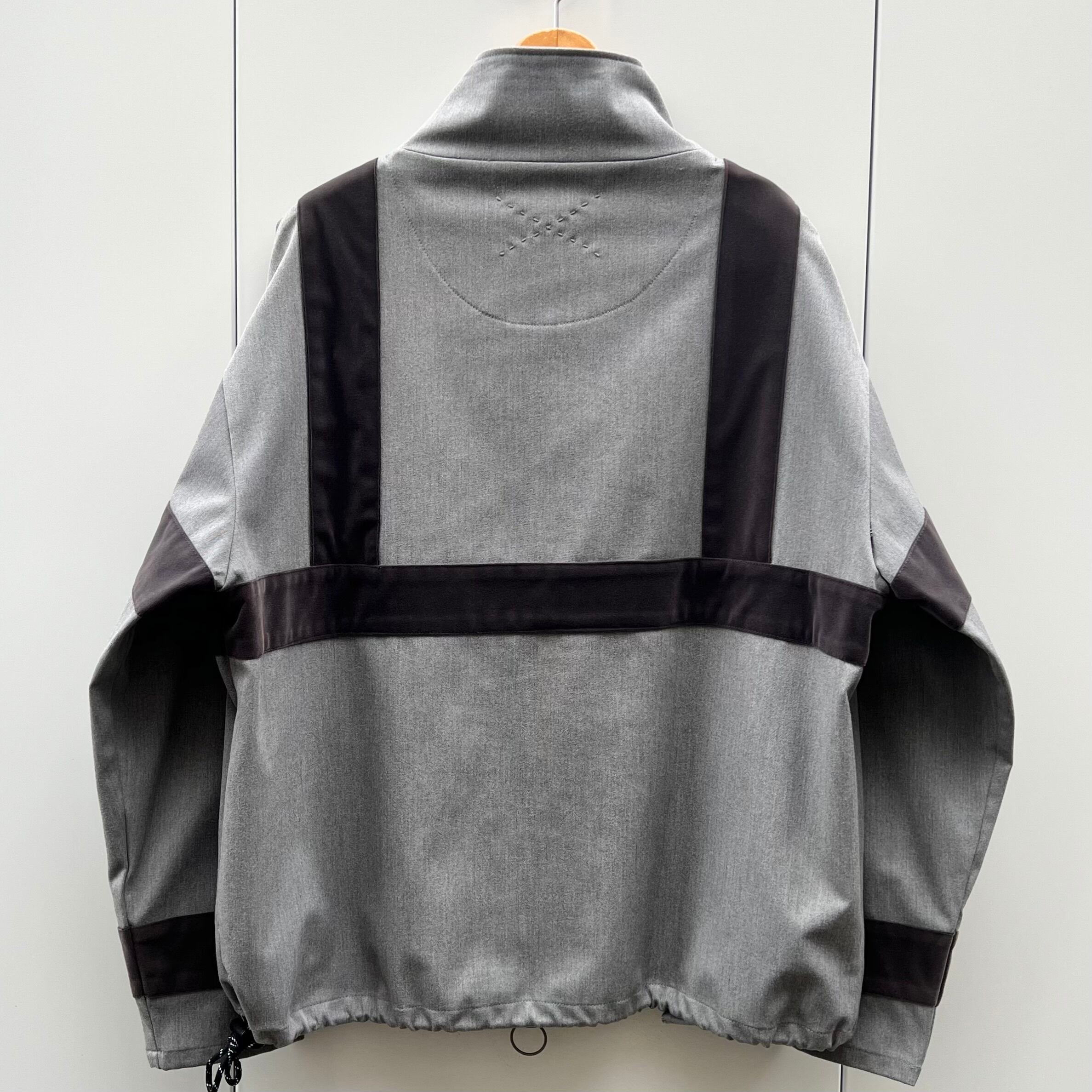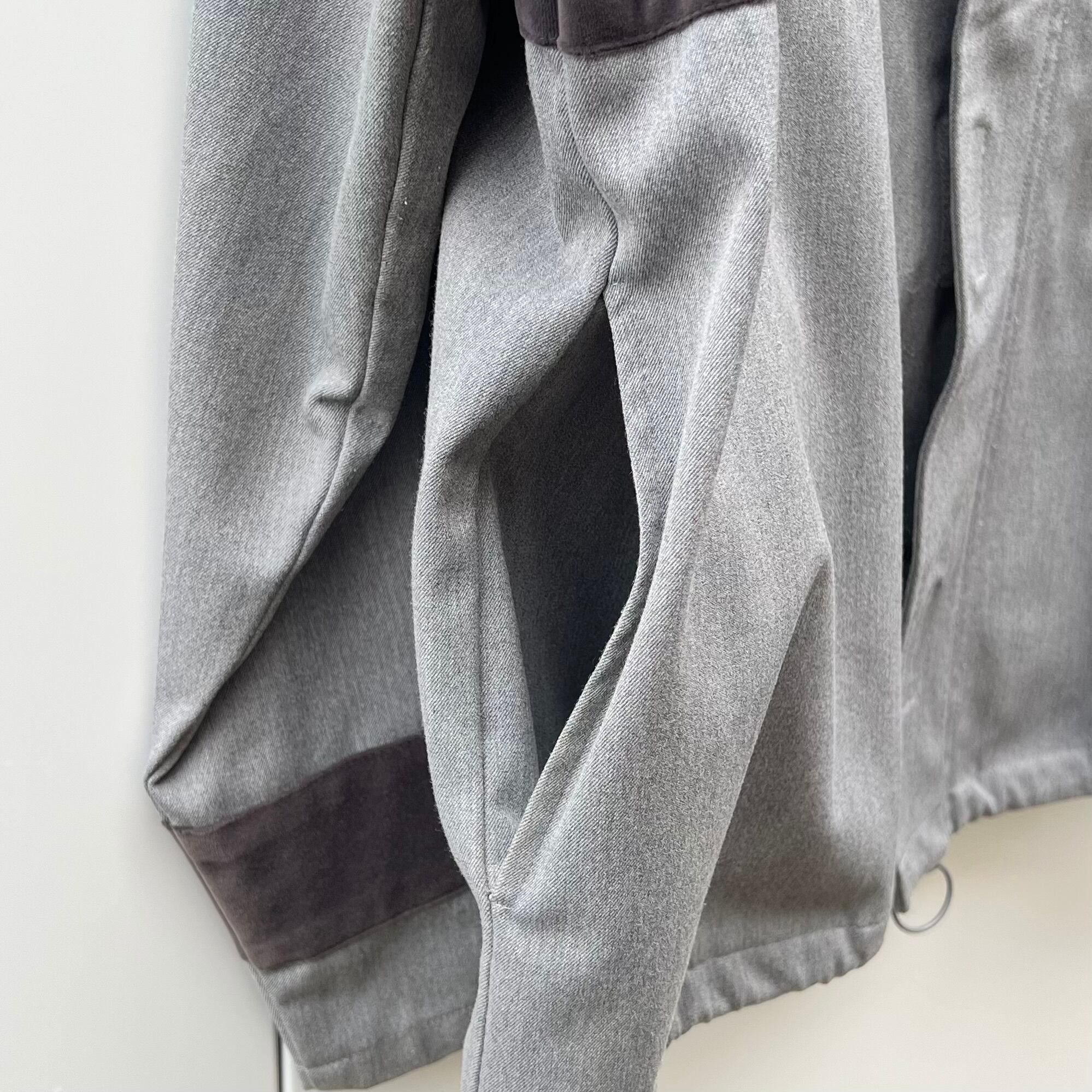 グレーのストレッチ素材xチャコールグレーのベロア素材、フロントベロクロとダブルジッパーで開閉、裾にドローコードの入るシンプルデザインです。