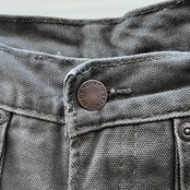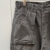 オリーブグリーンのダック素材、左バックポケットにネーム、左にハンマーループ、右にサイドポケット、フロントにマチ付きのパッチポケット、ダブル仕様のバックポケットの付いたペインター型デザインです。