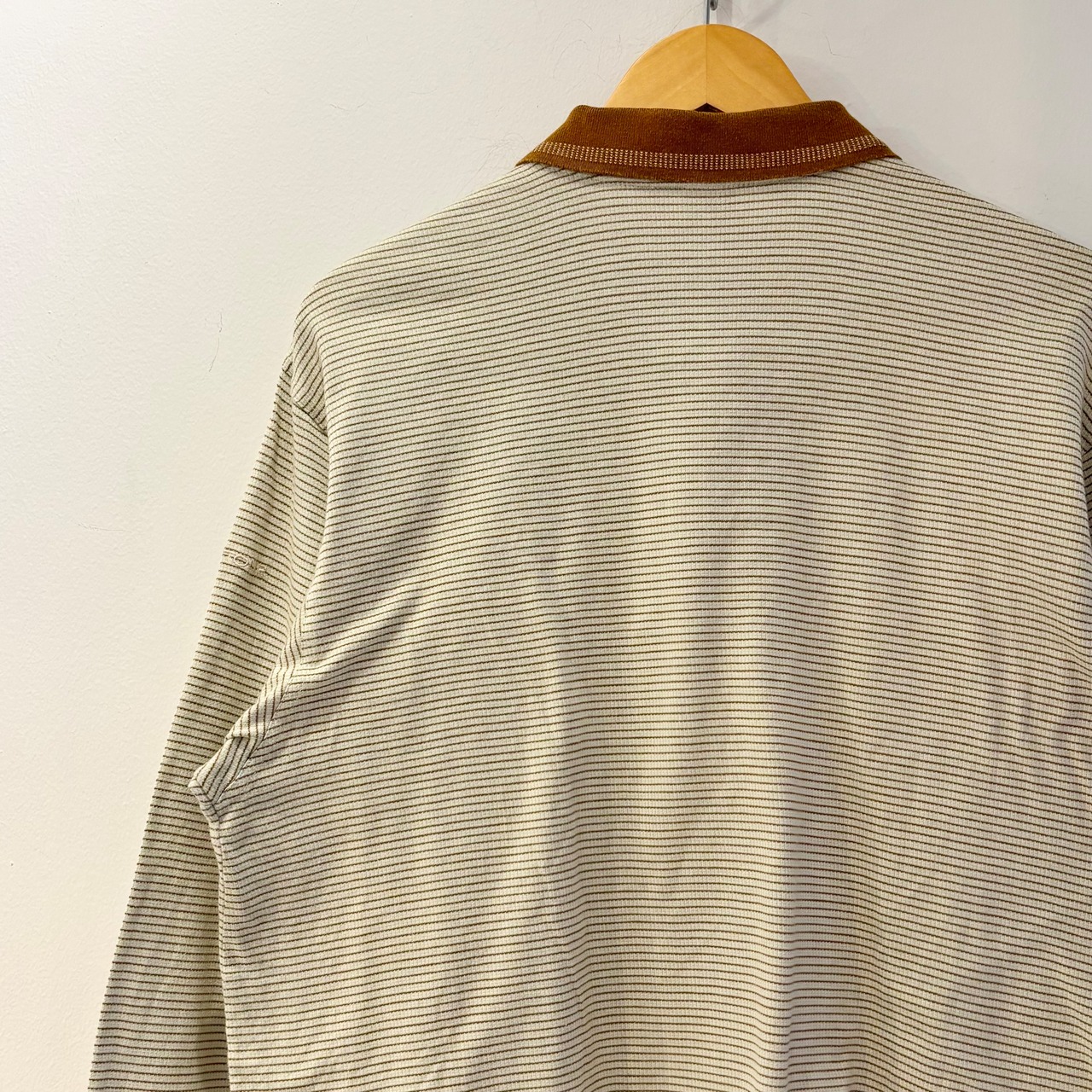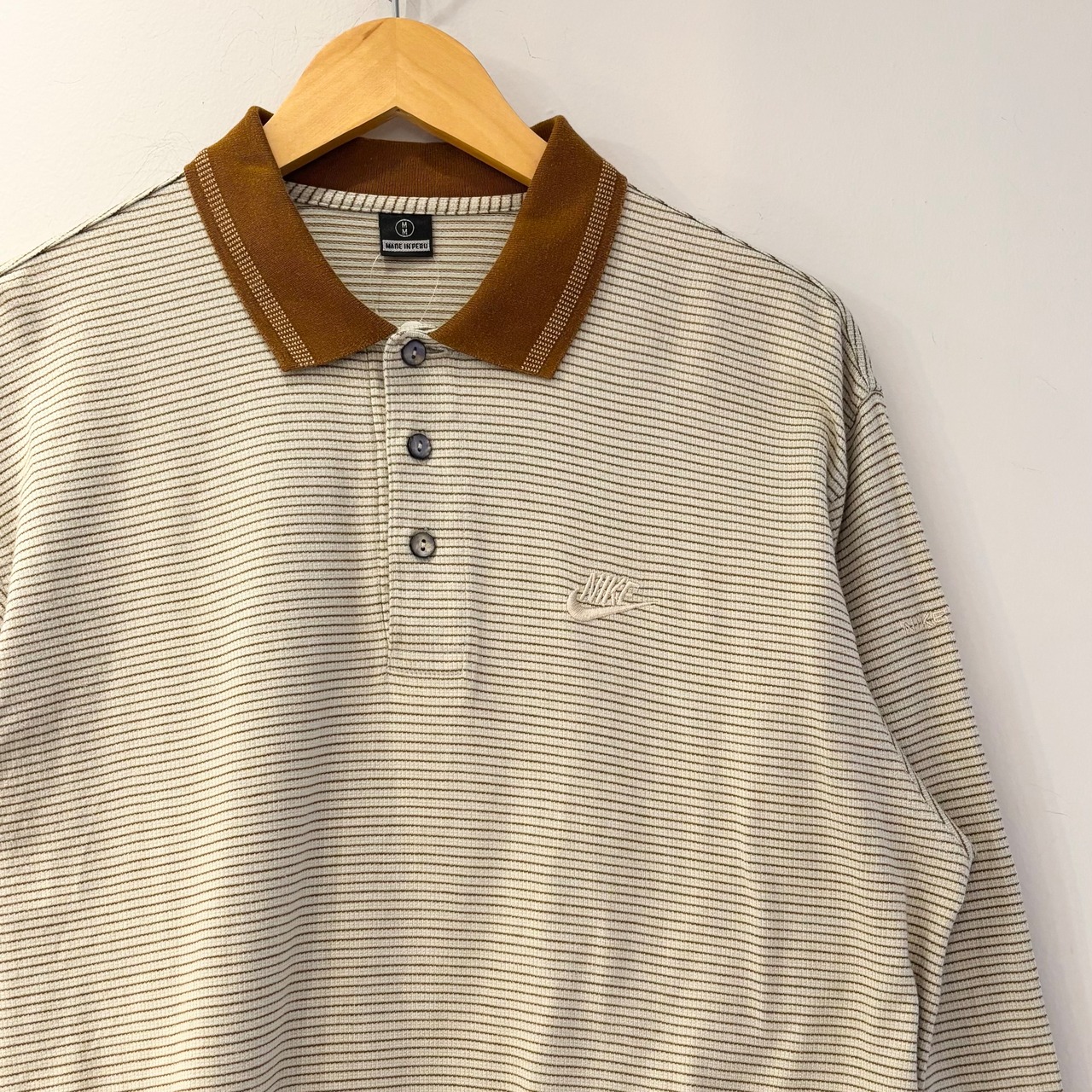 ベージュxブラウンの細ボーダーのコットン素材、左胸にナイキロゴ刺繍、左腕にNIKE TOUR刺繍、3ボタンで開閉のポロ襟のデザインです。