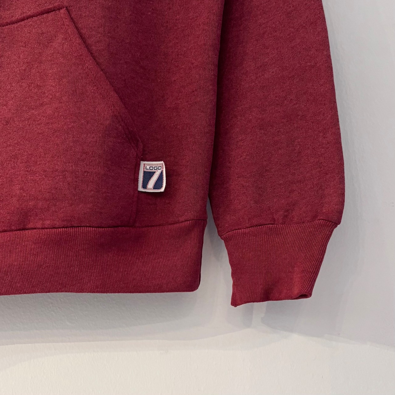 マルーンの裏起毛素材、フロントにロゴとロゴマークが刺繍されたスタンダードデザインです。