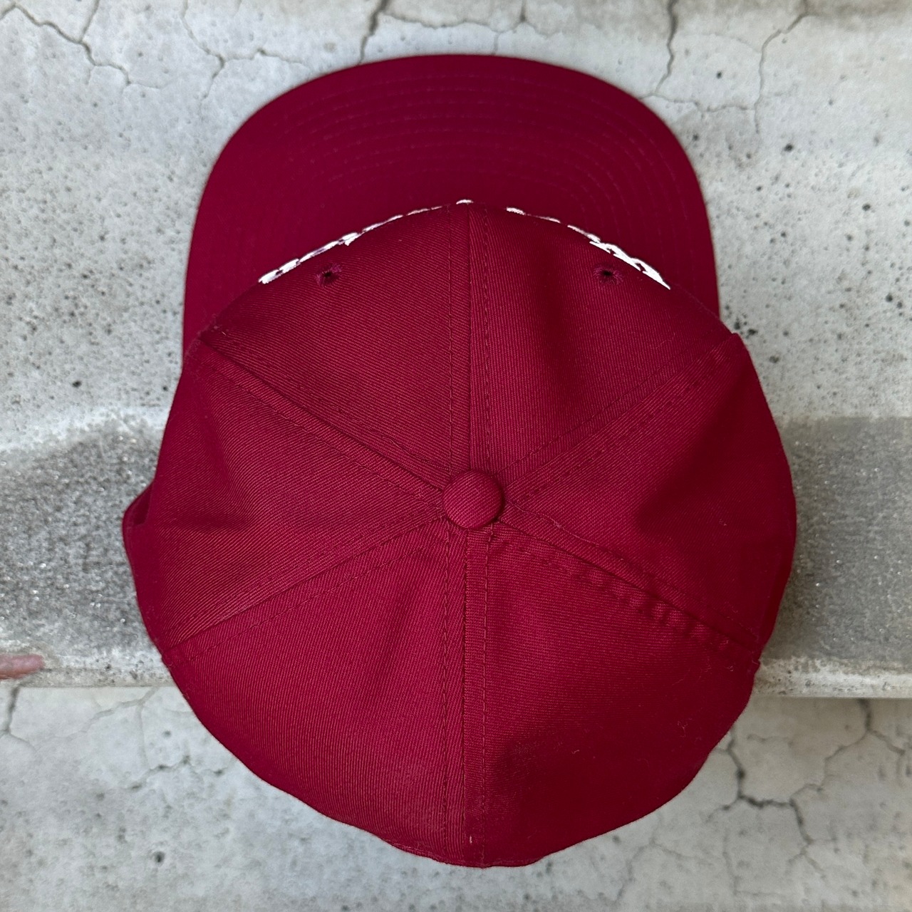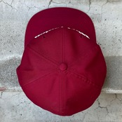 バーガンディのコットン系素材、フロントにロゴとロゴマーク刺繍、スナップバックアジャスターのシンプルデザインです。