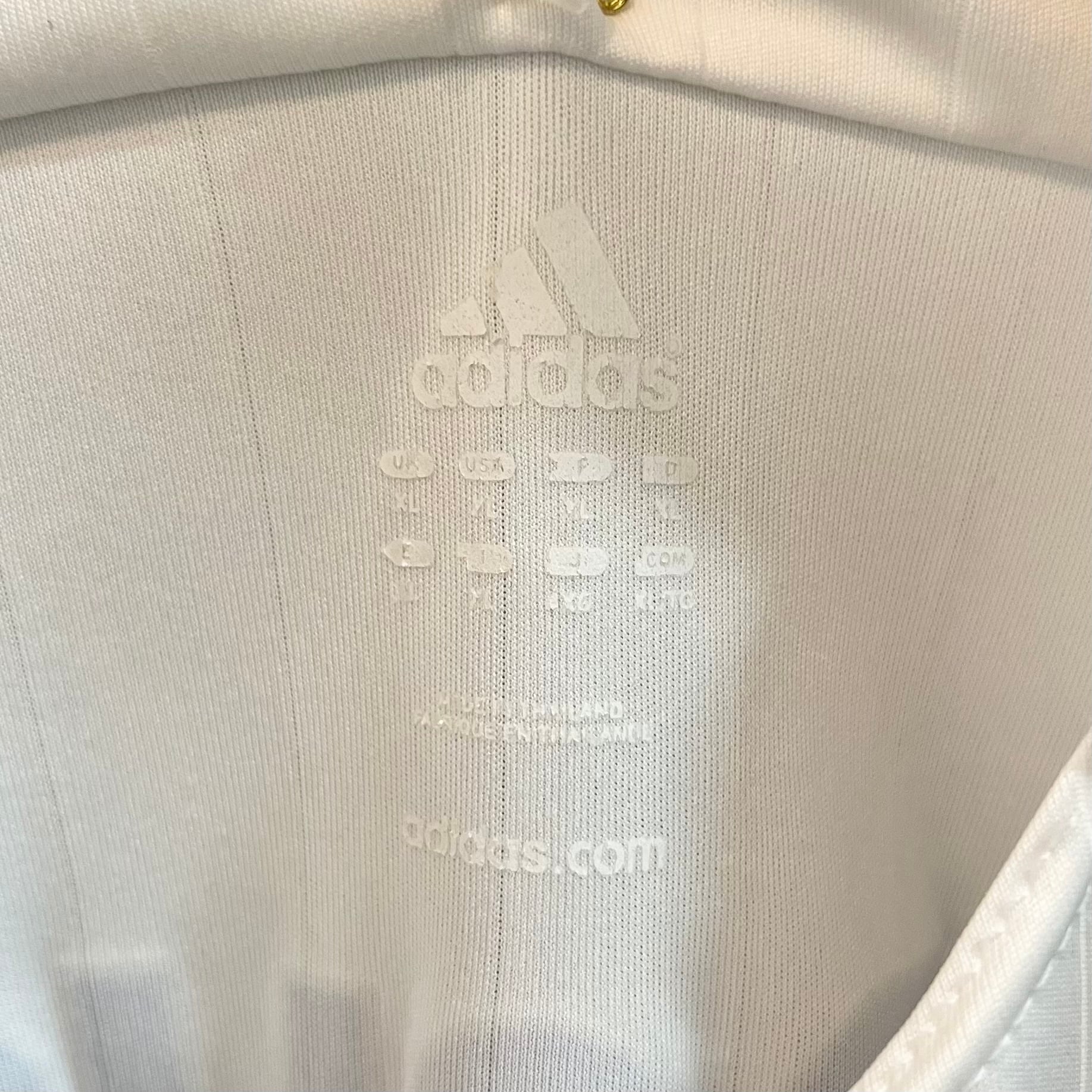 ホワイトxネイビーの3ストライプスxグレーメッシュ、左胸にチームロゴマーク刺繍、中央にアディダスのパフォーマンスロゴ刺繍、右胸にFIFA AWARDプリント、腹部にスポンサープリント、バックにCANNNAVARO5プリント、襟元にReal Madrid刺繍が入るデザインです。
