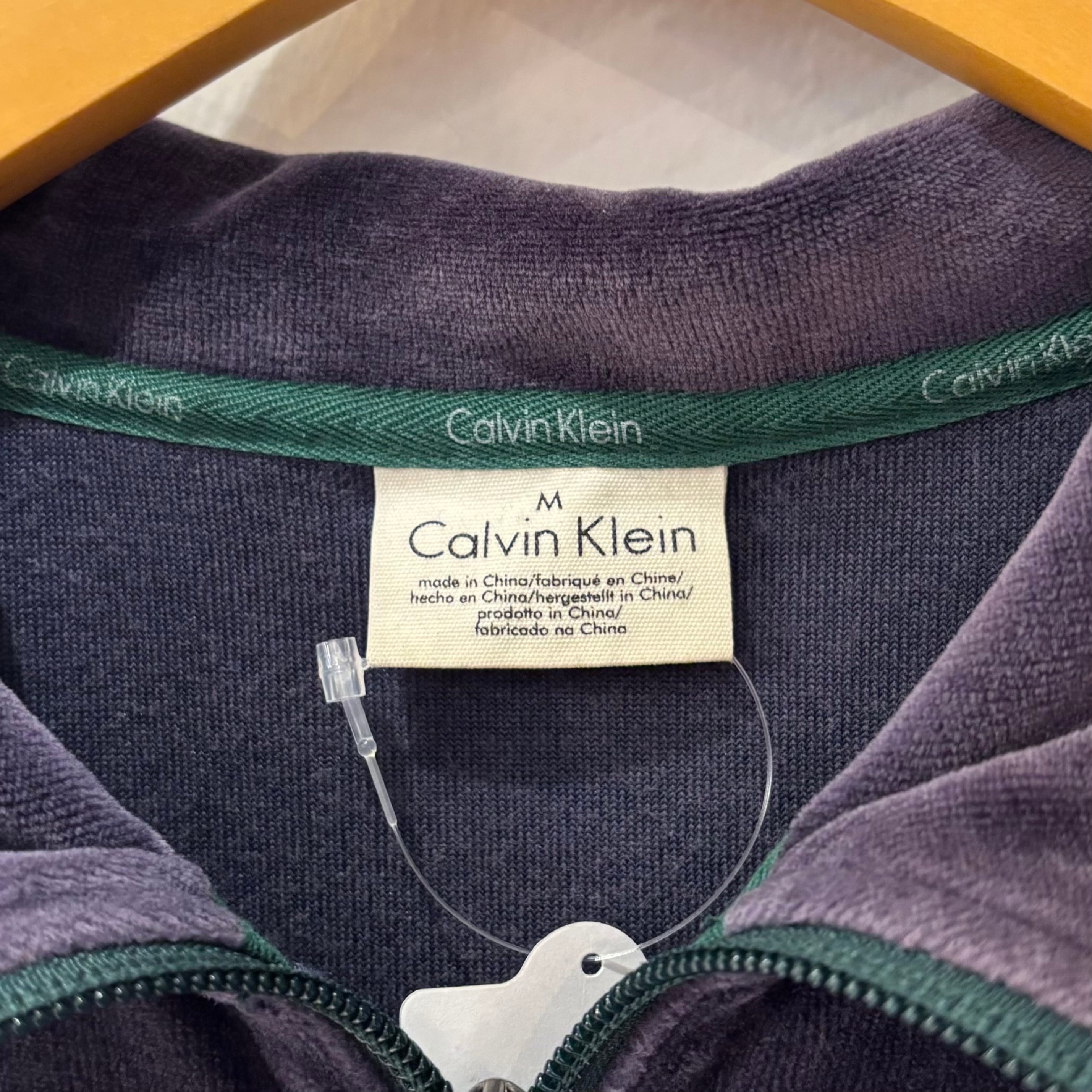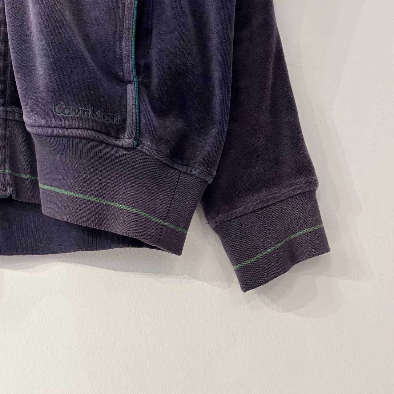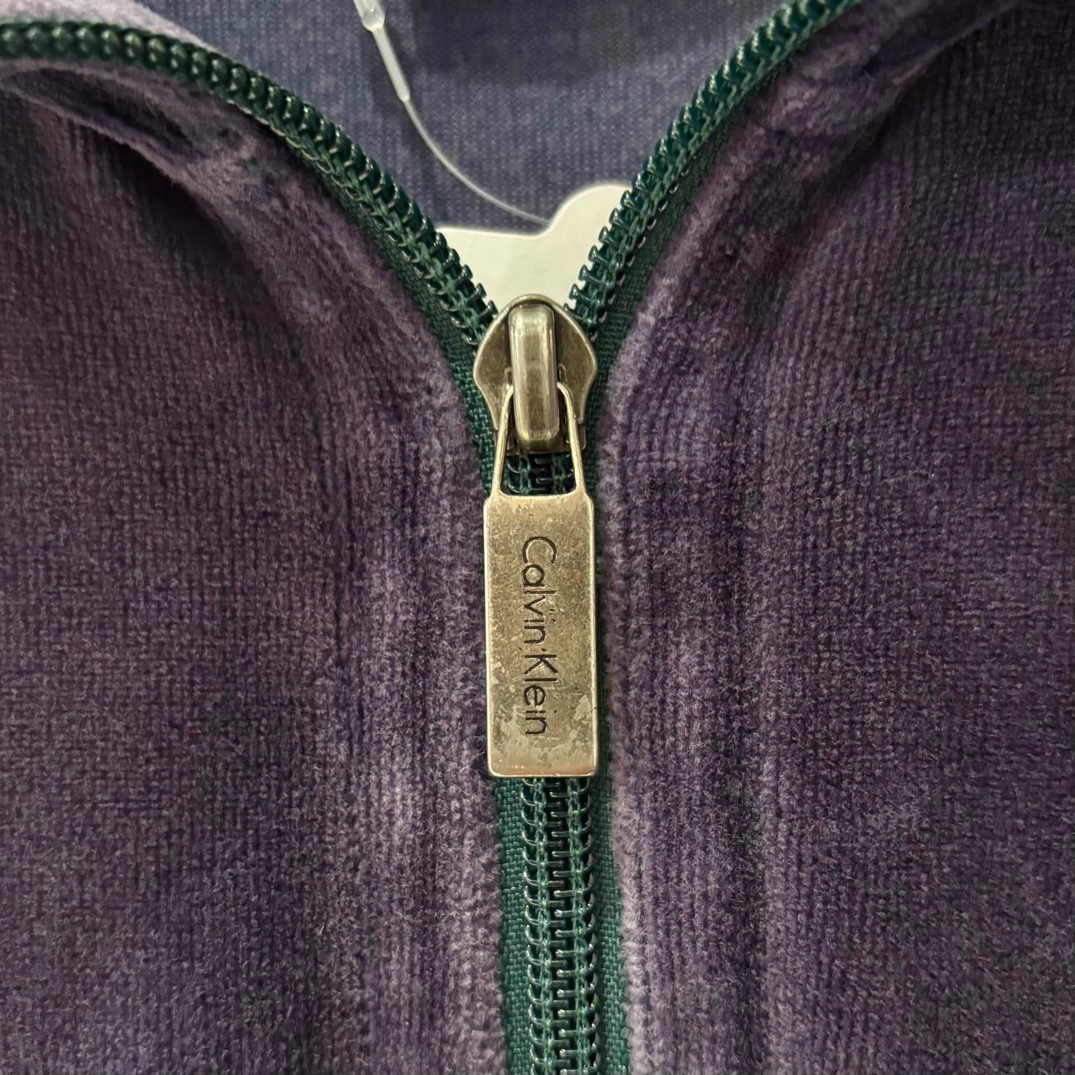 パープルのベロア素材xグリーンライン、左裾にCalvin Klein刺繍、ロゴ入りジッパースライダーを使用したダブルジッパーで開閉、ハンドウォームポケットが付いたシンプルデザインです。