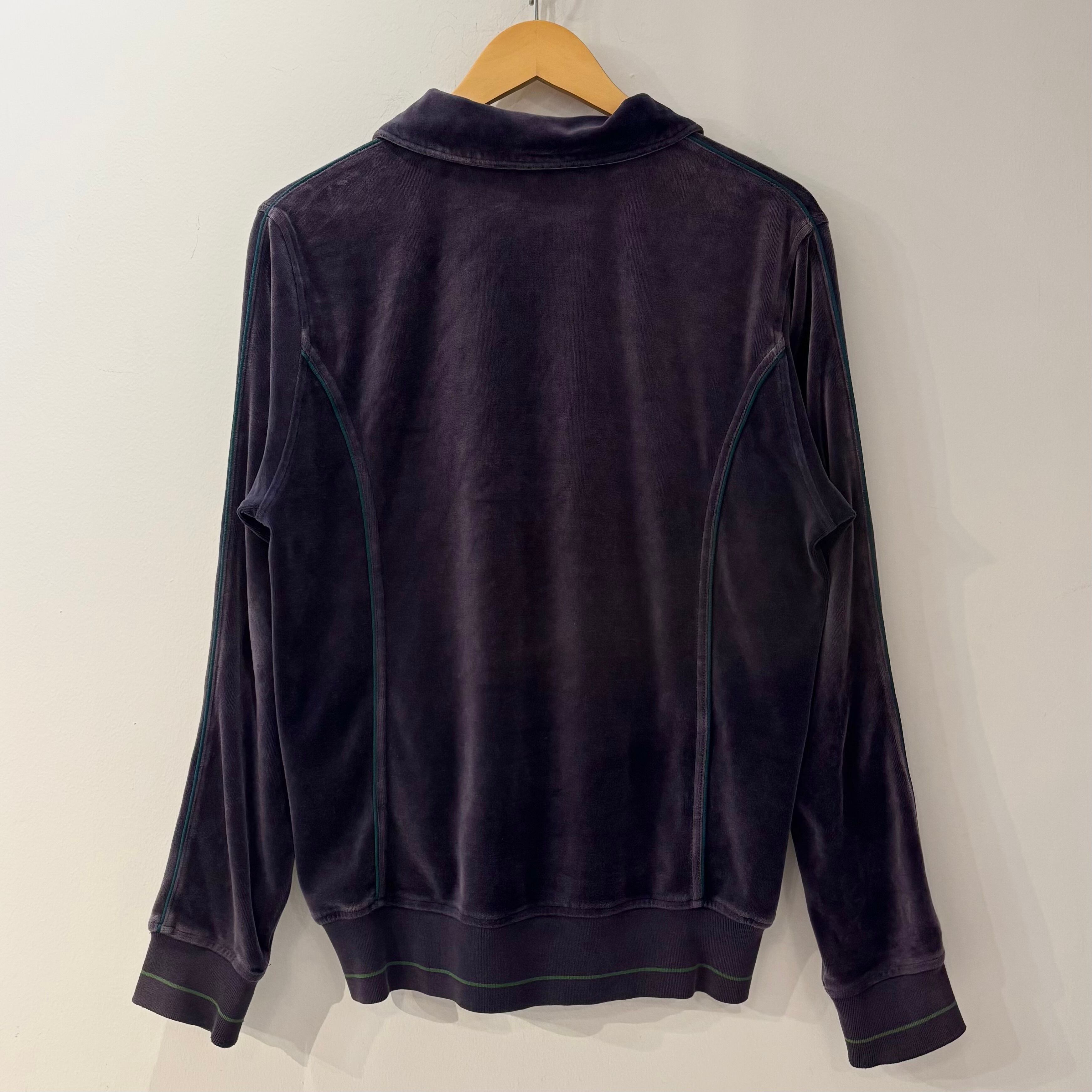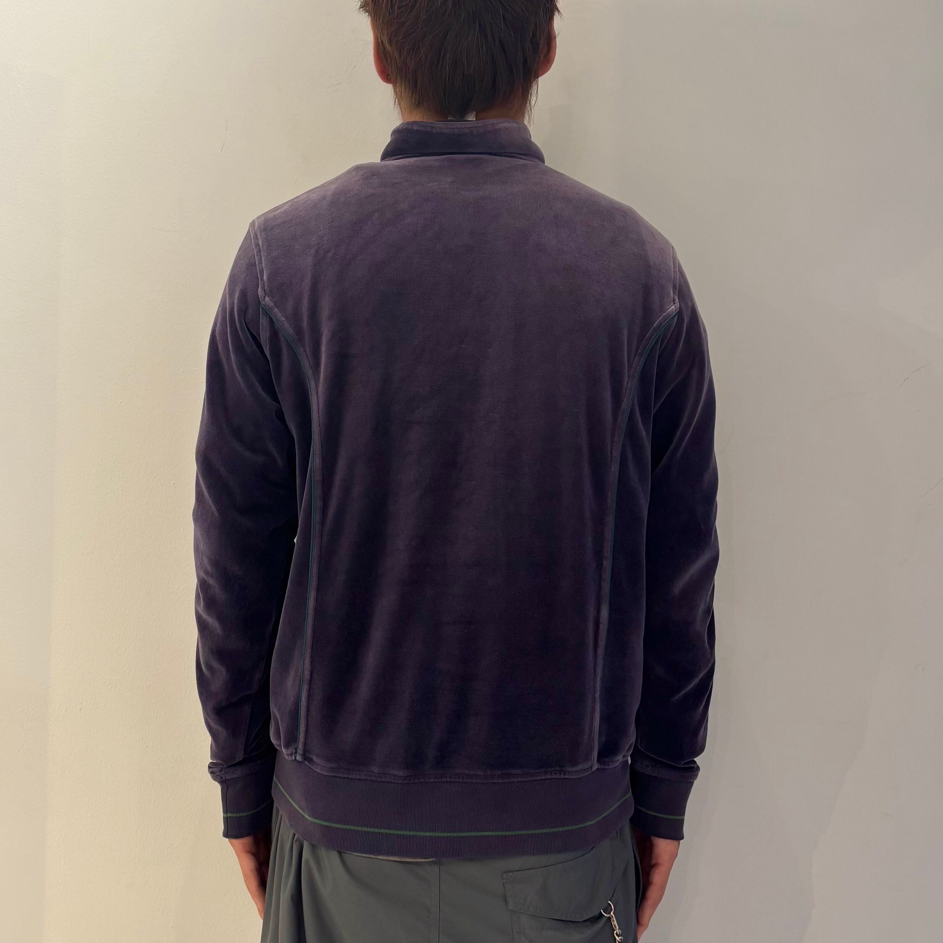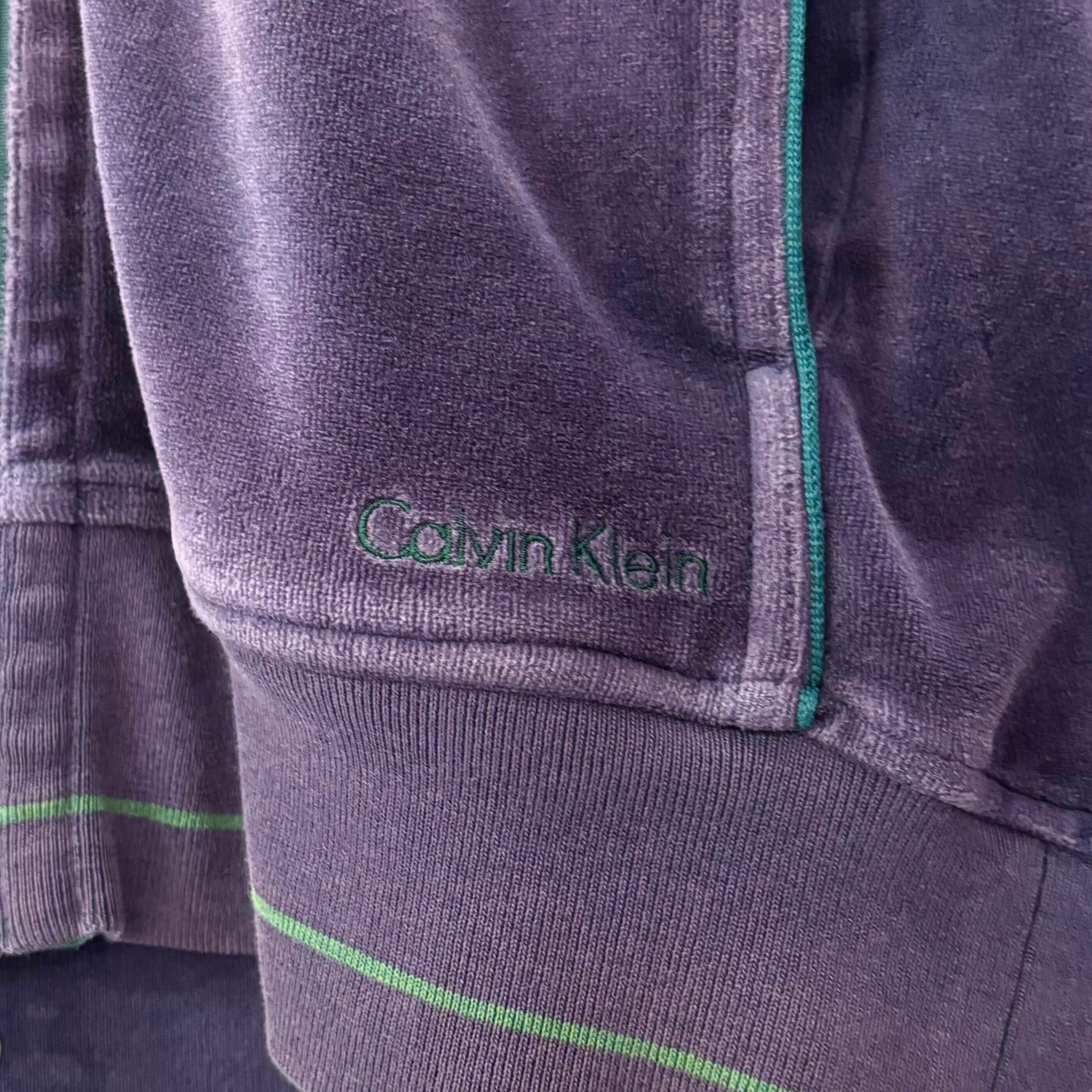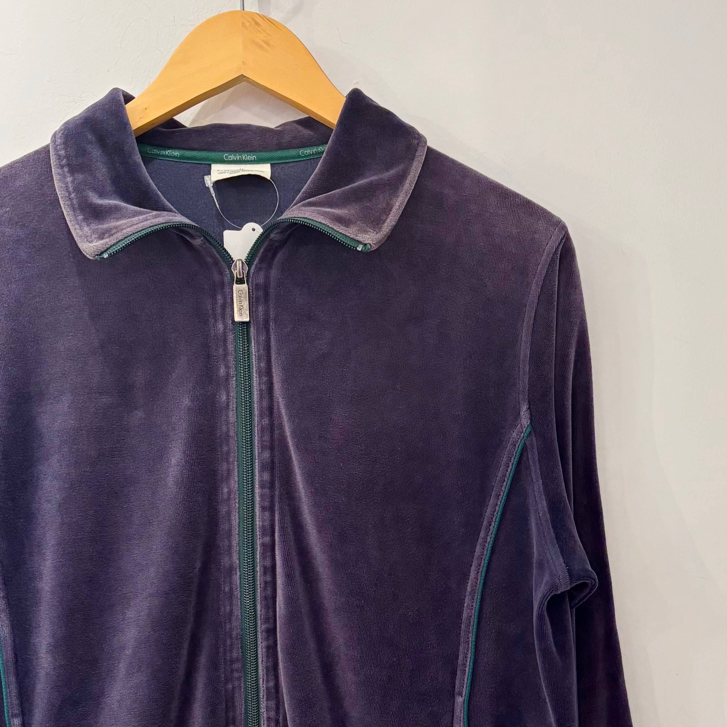 パープルのベロア素材xグリーンライン、左裾にCalvin Klein刺繍、ロゴ入りジッパースライダーを使用したダブルジッパーで開閉、ハンドウォームポケットが付いたシンプルデザインです。