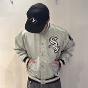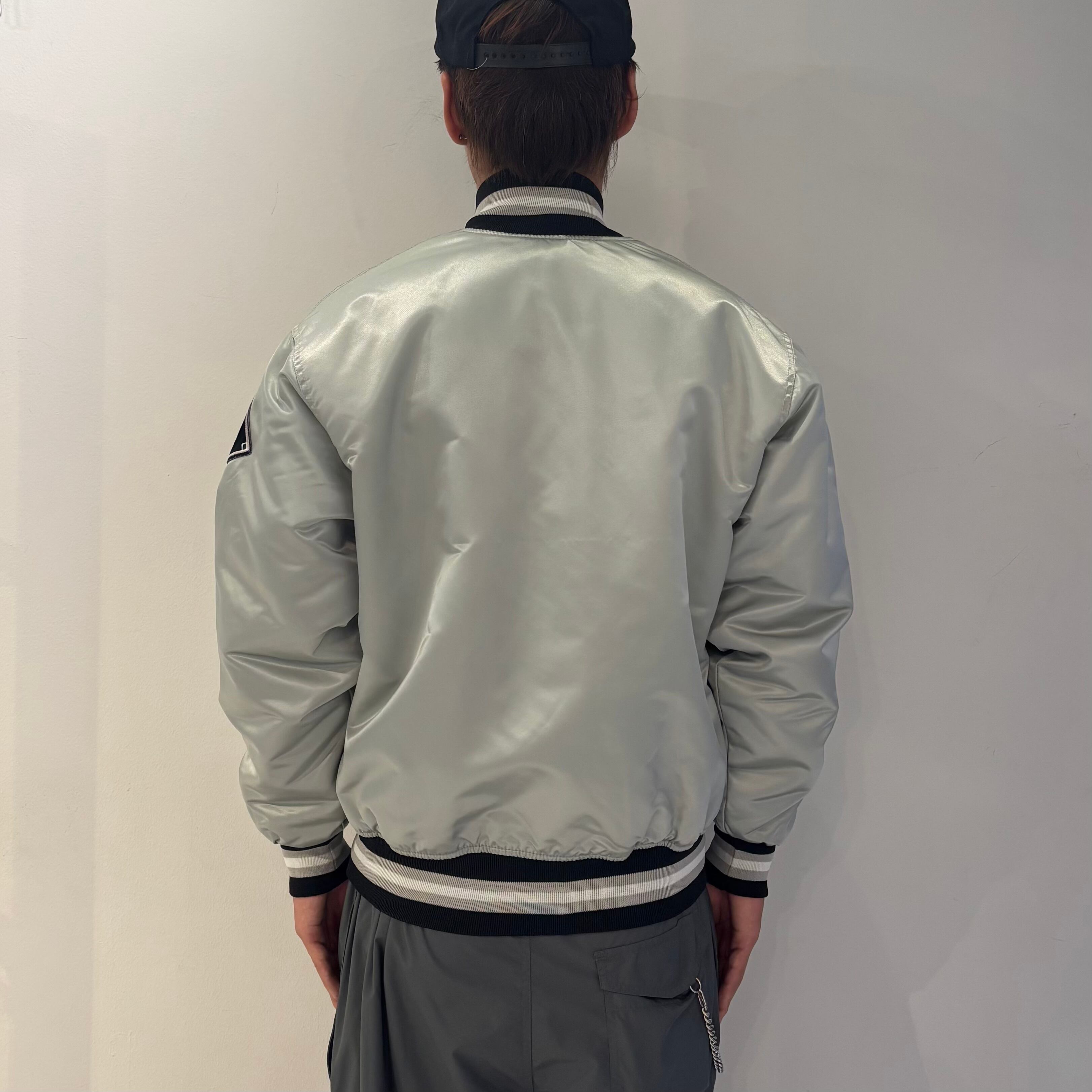 シルバーのナイロンサテンxブラック/ホワイトライン、左胸にSOXロゴマークワッペン、左袖にスクエア型のソックスロゴマークワッペン、左裾にバッターマンワッペンの付いたデザインです。