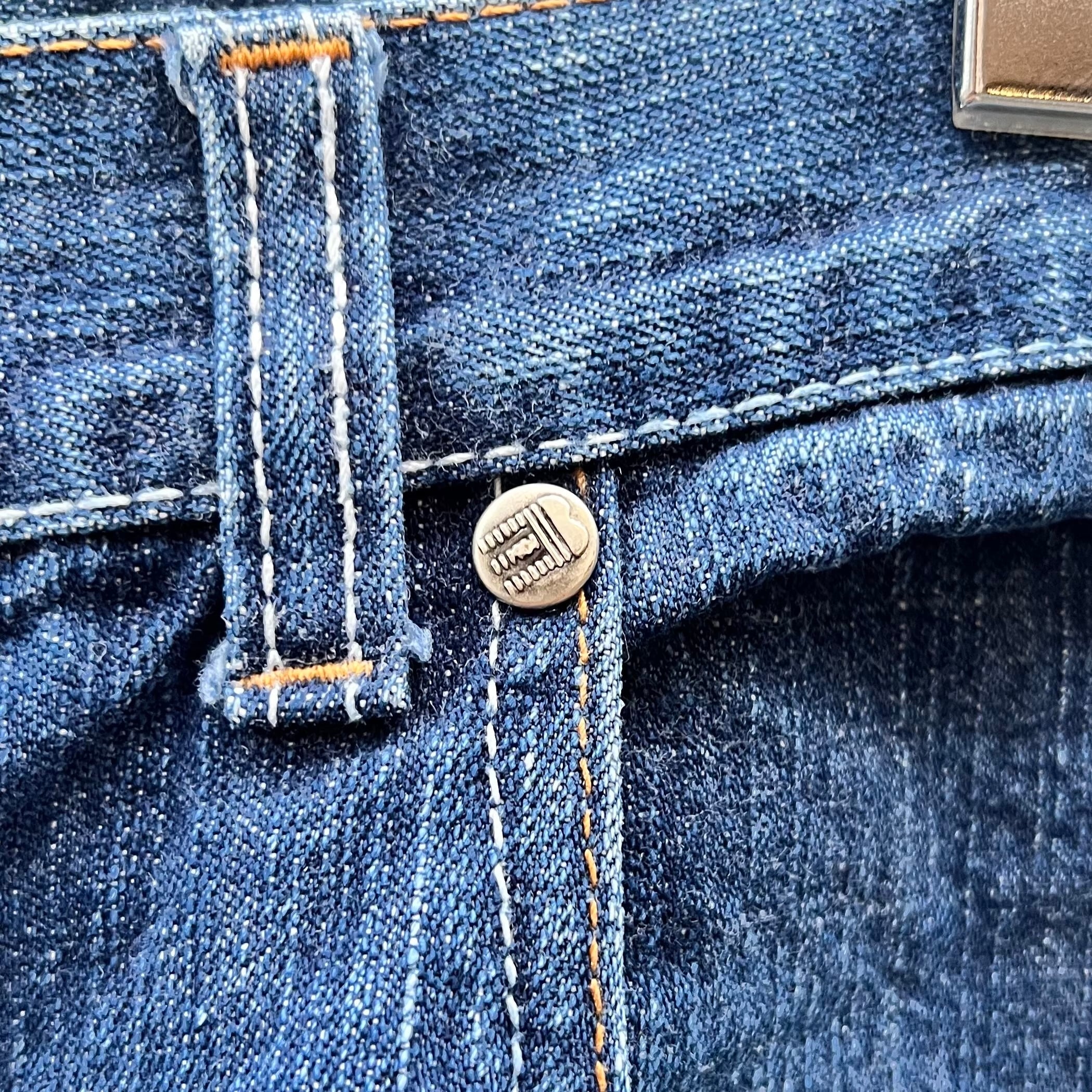 ウォッシュドブルーデニム、右バックポケットにBロゴマーク?刺繍、片側2つ、膝に切り替え、ロゴ入りボタン、リベットを使用したデザインです。