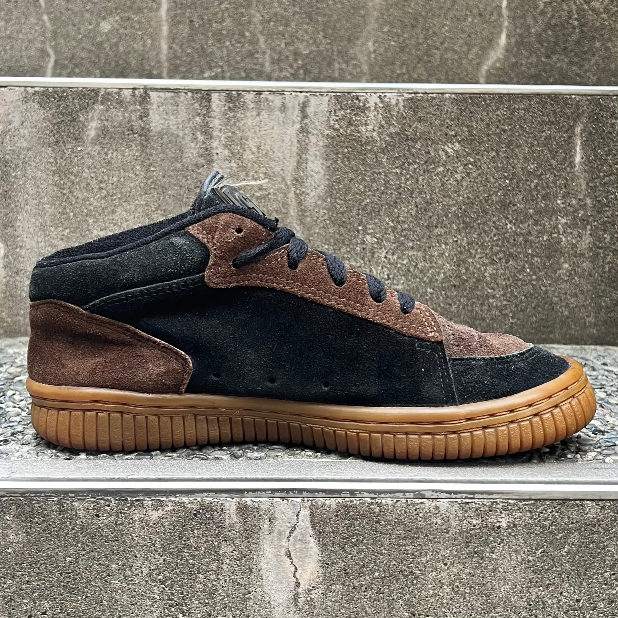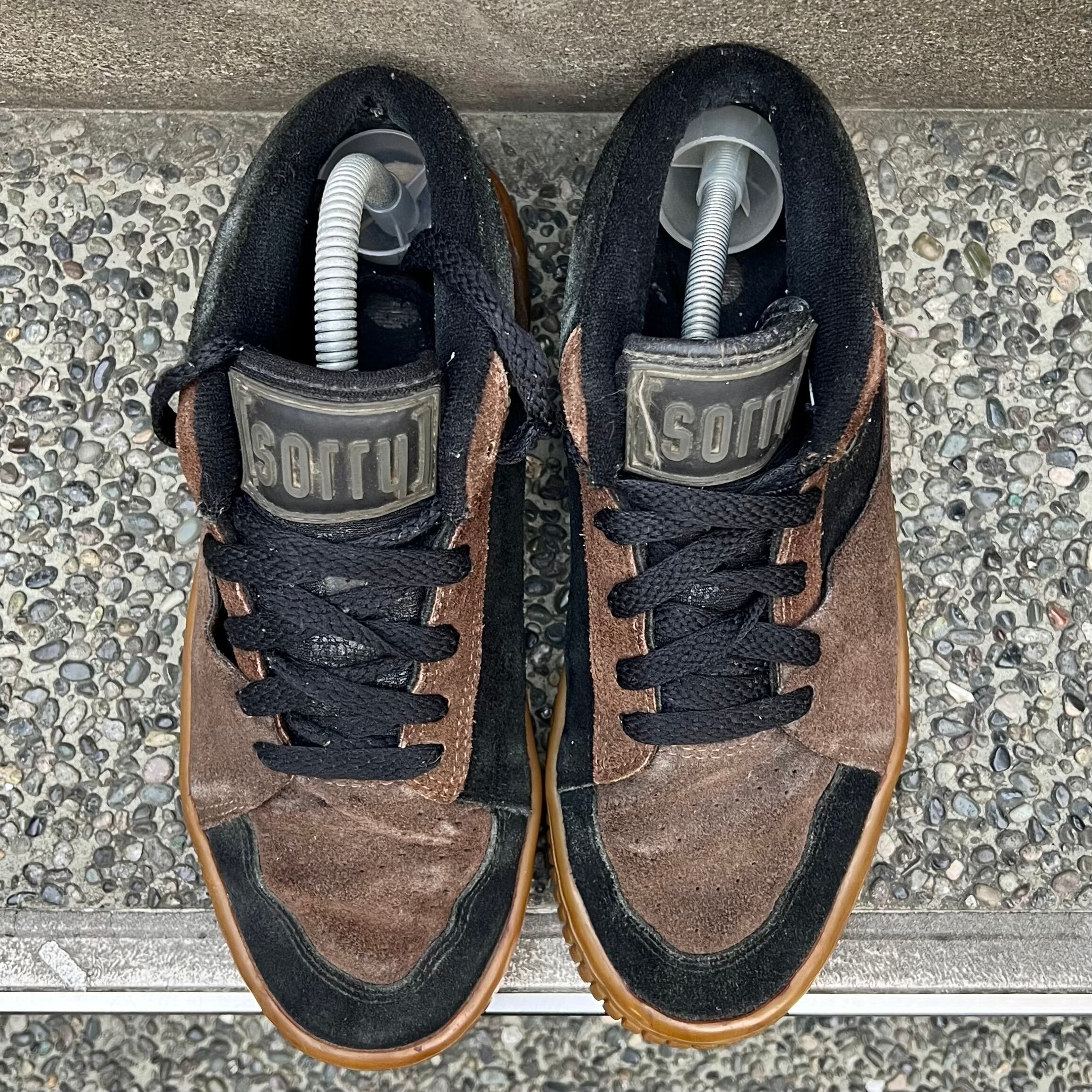 ブラックスウェードxブラウンスウェード、両サイドにAロゴ、シュータンにSORRYのラバーワッペン、ガムソールを履いたスケート用デザインです。