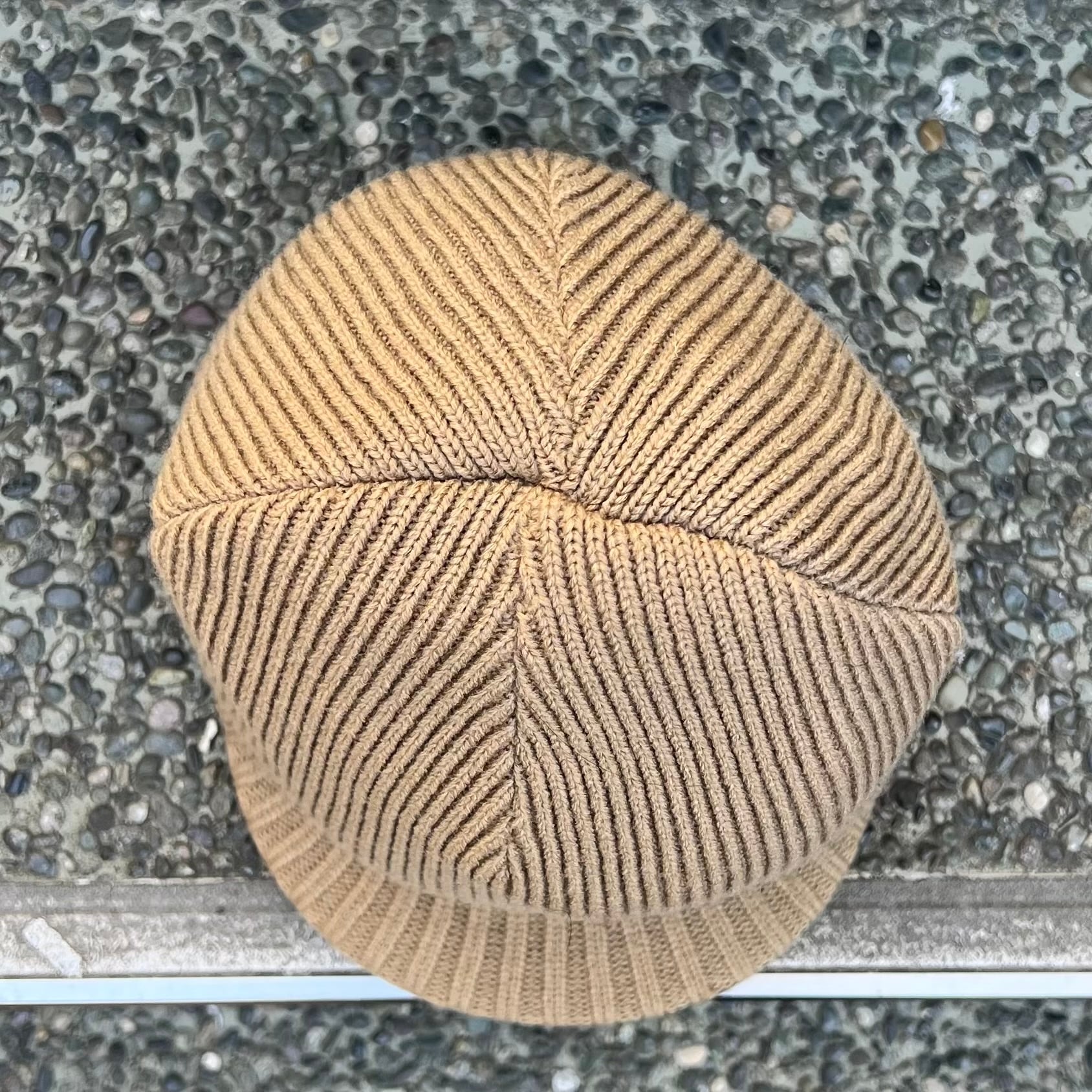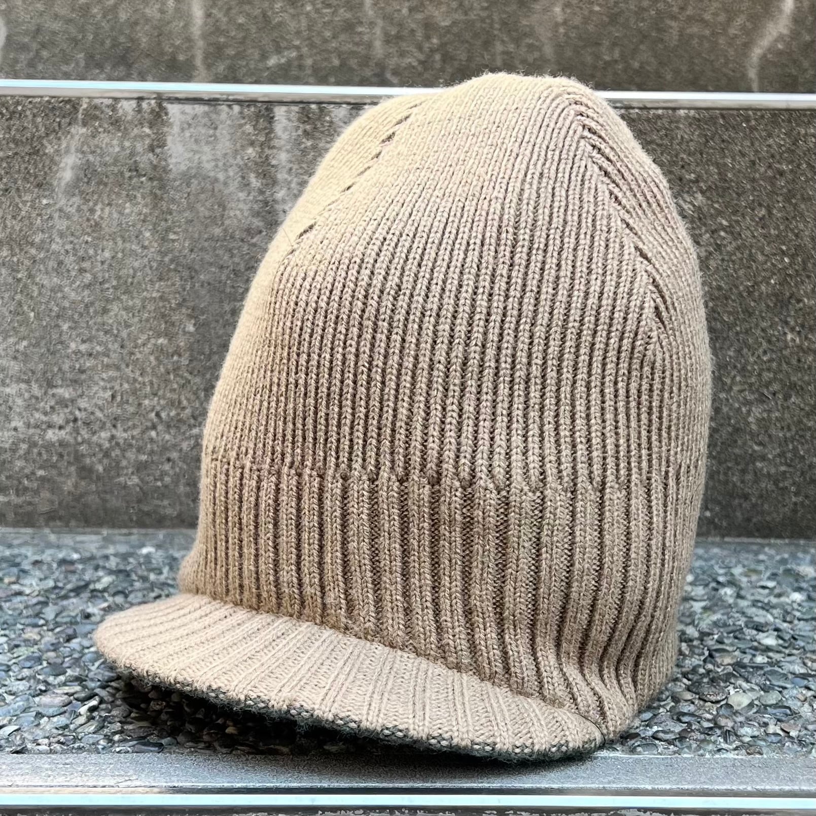 オリーブグリーンxベージュのアクリル系素材、ビーニーにツバの付いたデザインです。